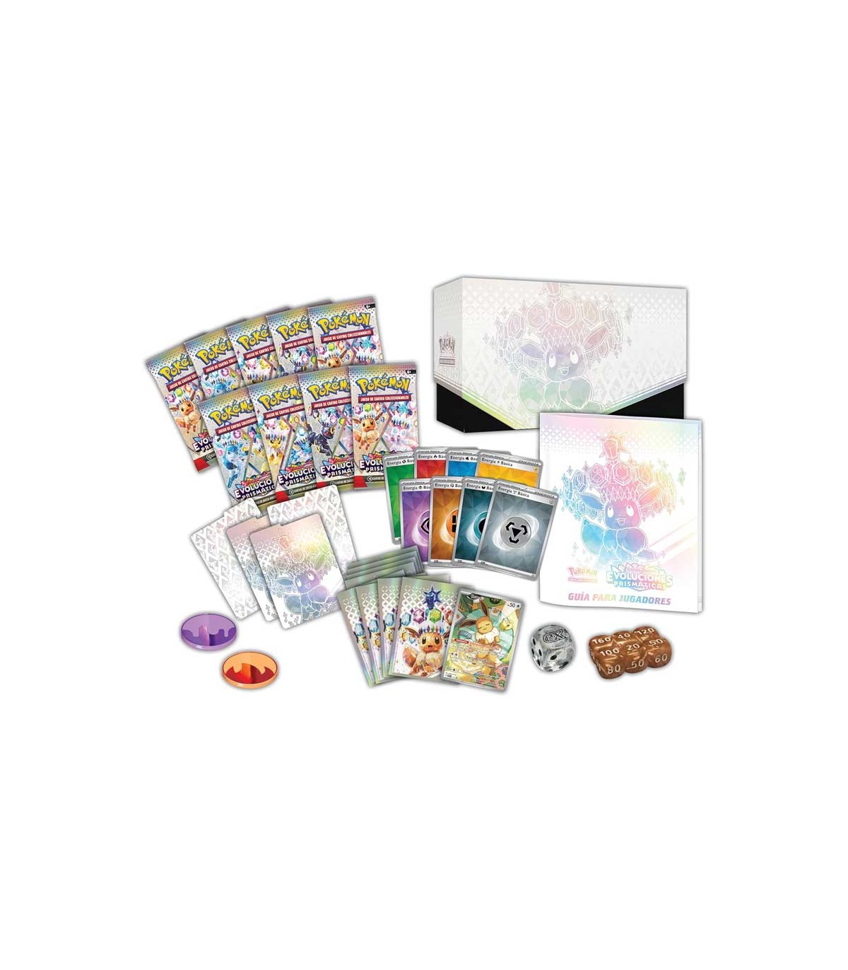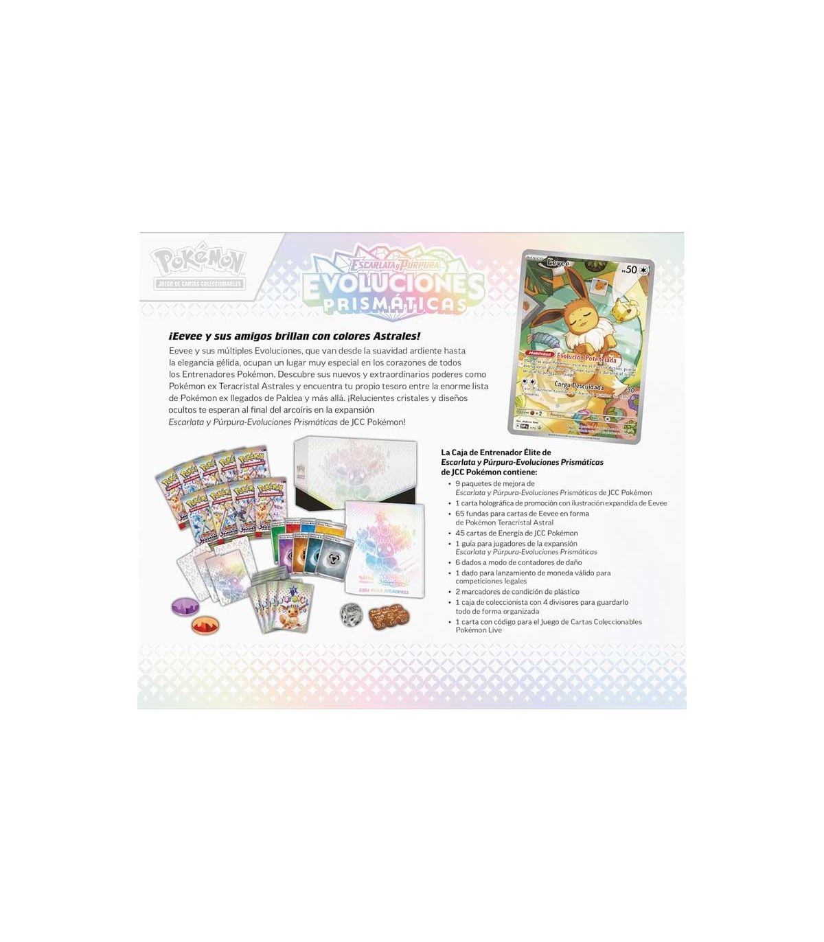 Pokémon, caja de entrenador élite Evoluciones prismáticas Escarlata y Púrpura, con todo lo que un entrenador necesita.