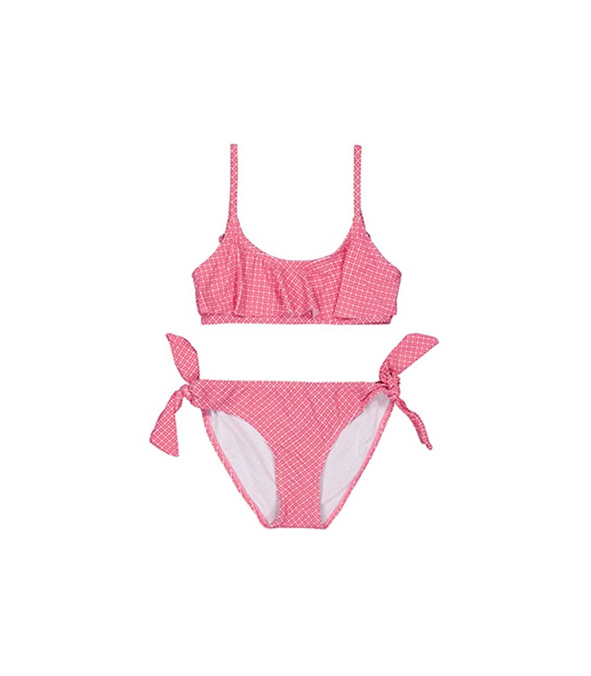 Go&Win bikini Lamana de dos piezas con estampado geométrico en color rosa y rojo, sujetador tipo top con volante a juego y con relleno extraíble a partir de la talla 12.