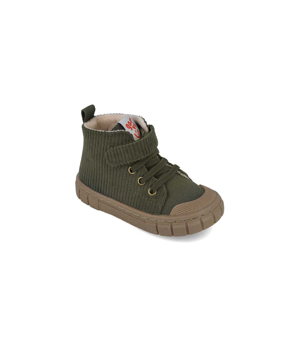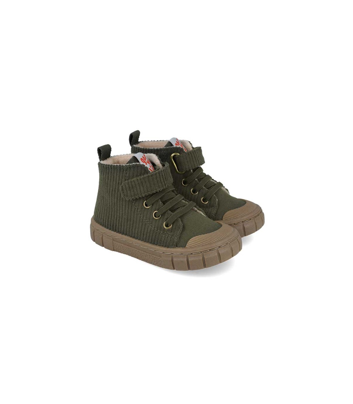 Botín de pana de Garvalín en color verde kaki, cierre con un velcro y elástico, suela de goma color caramelo y puntera reforzada. Interior de borreguillo.