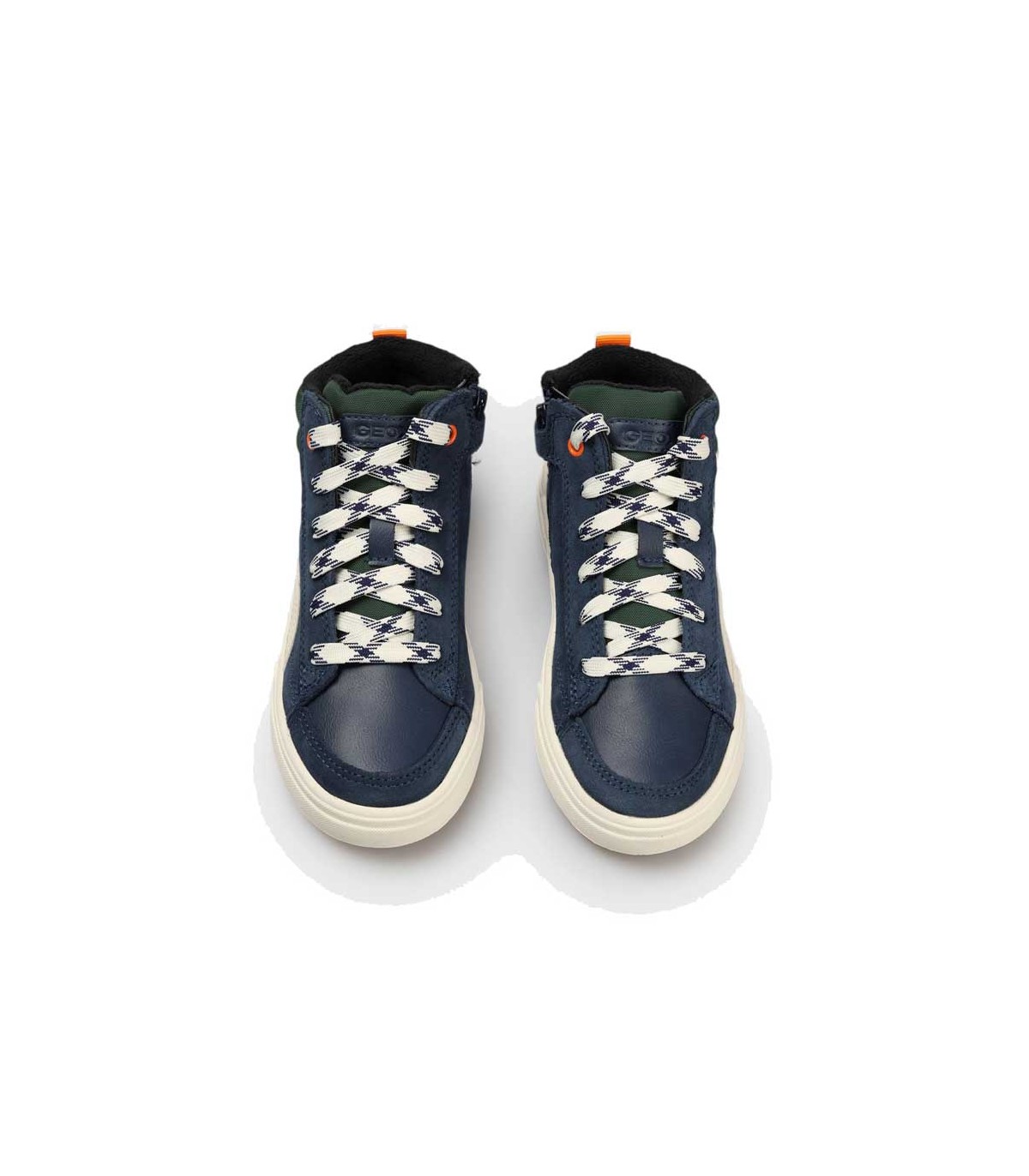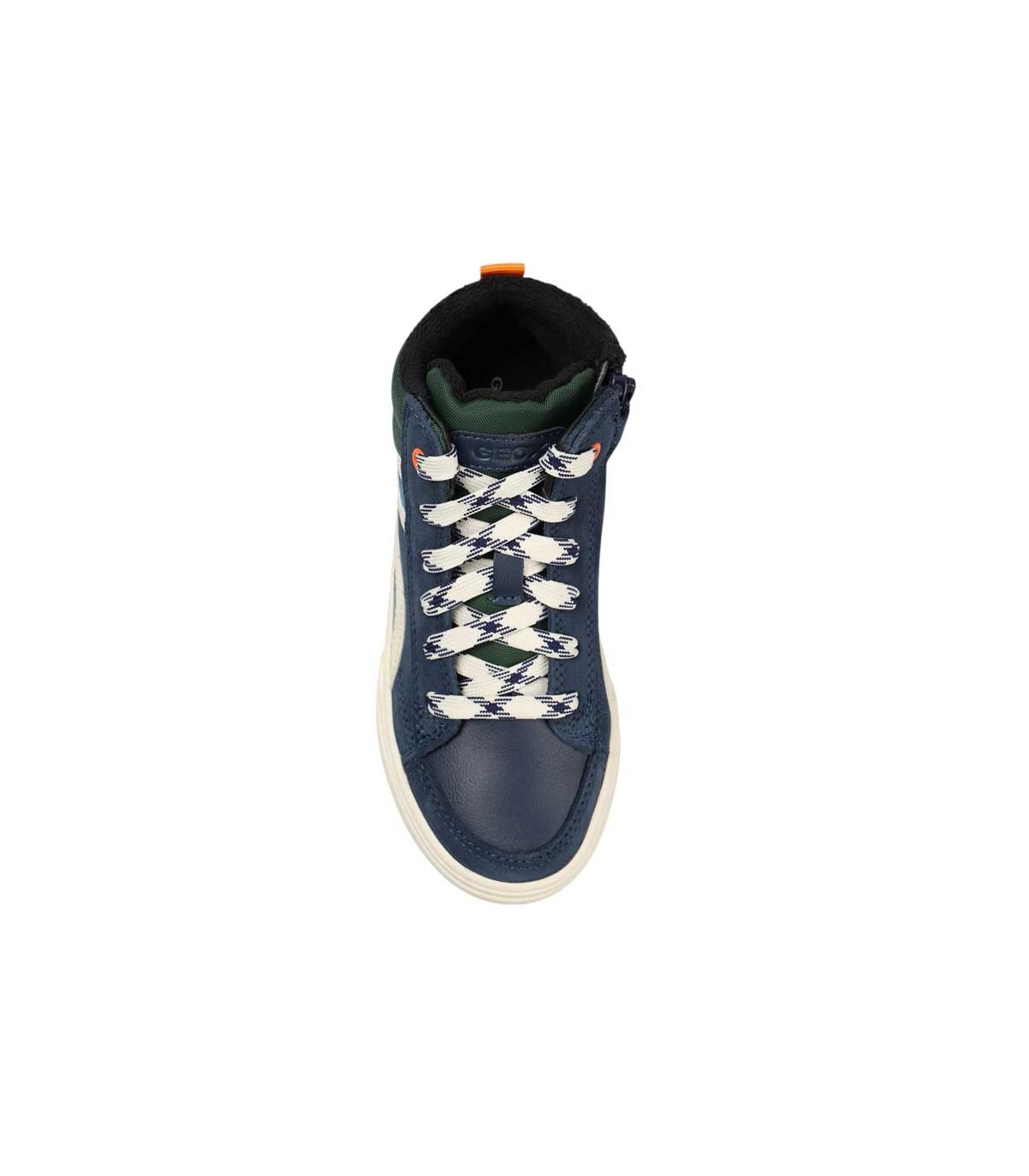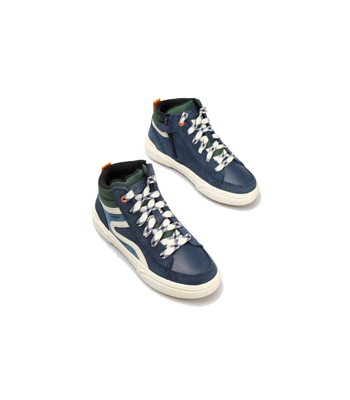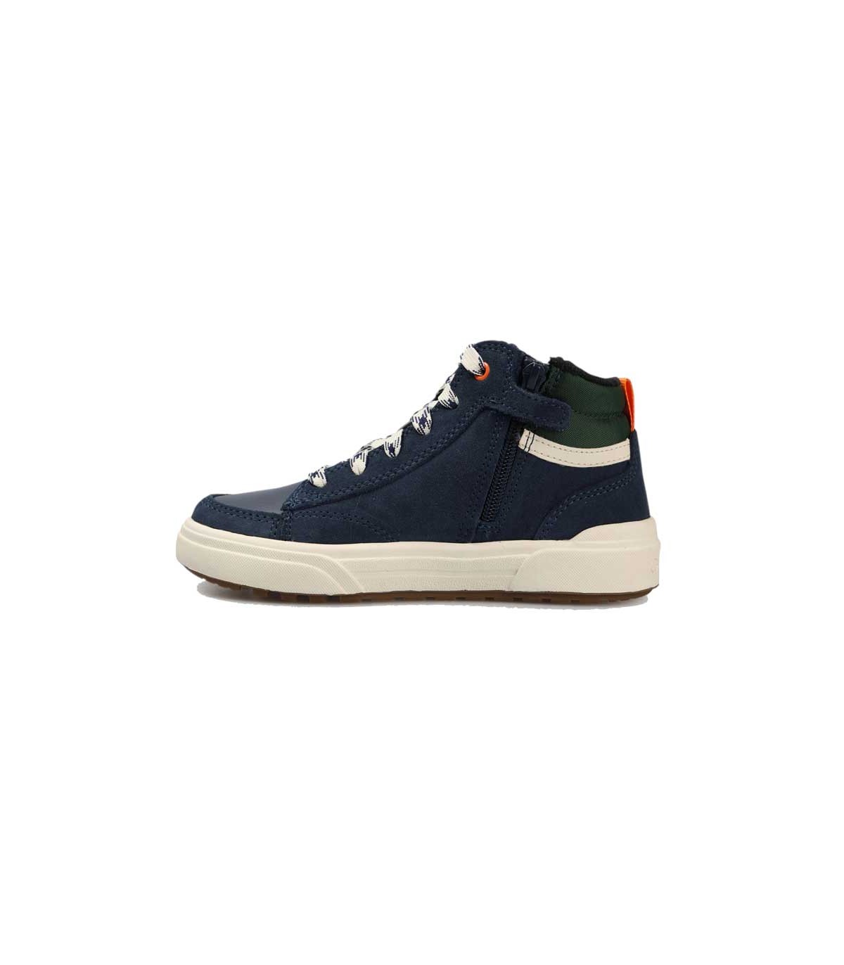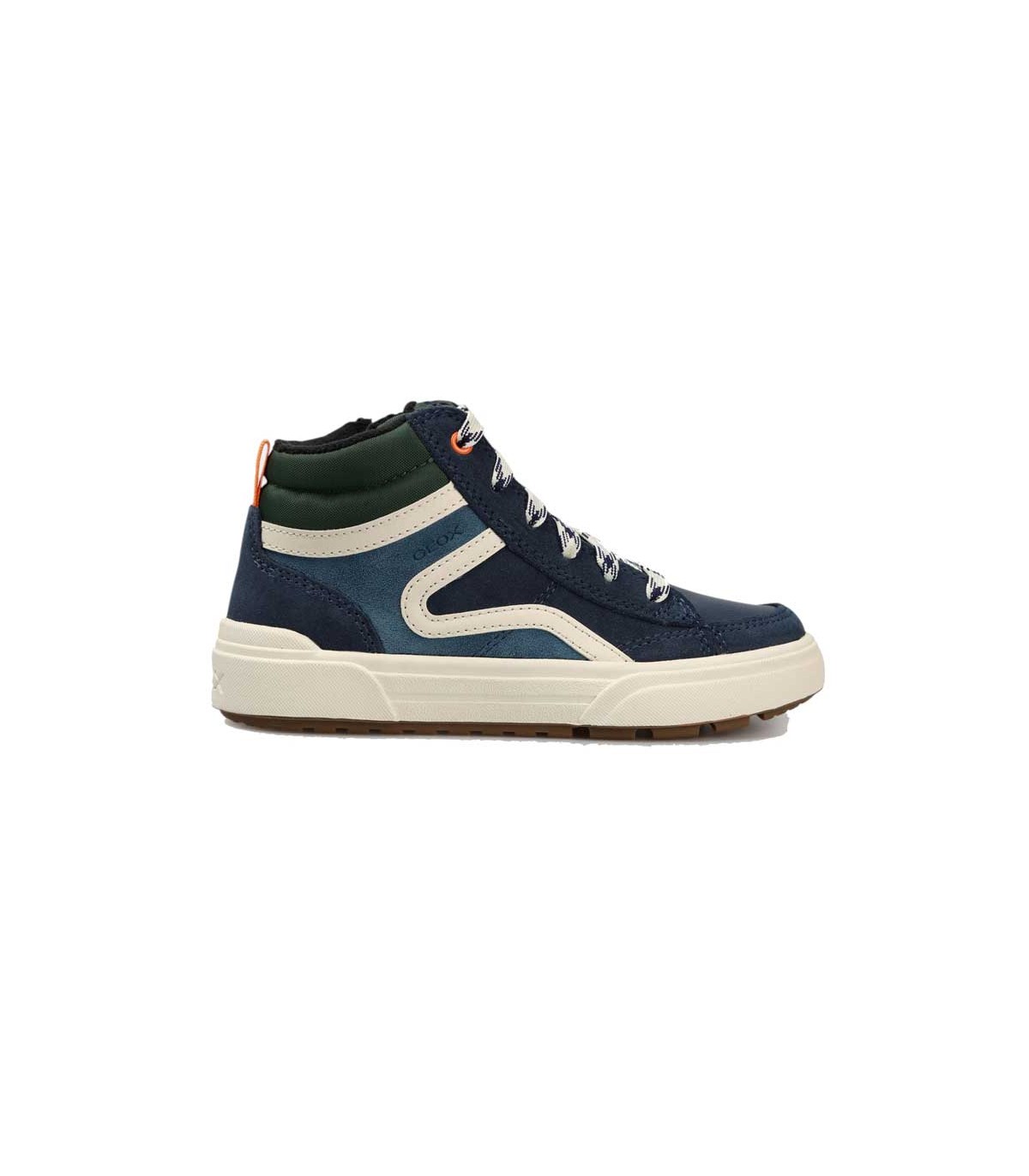 Bota Geox Weemble en piel sintética y nobuck azul, detalles en blanco y verde, Cierre con cordones blancos y azules y cremallera interior, interior de forro polar.