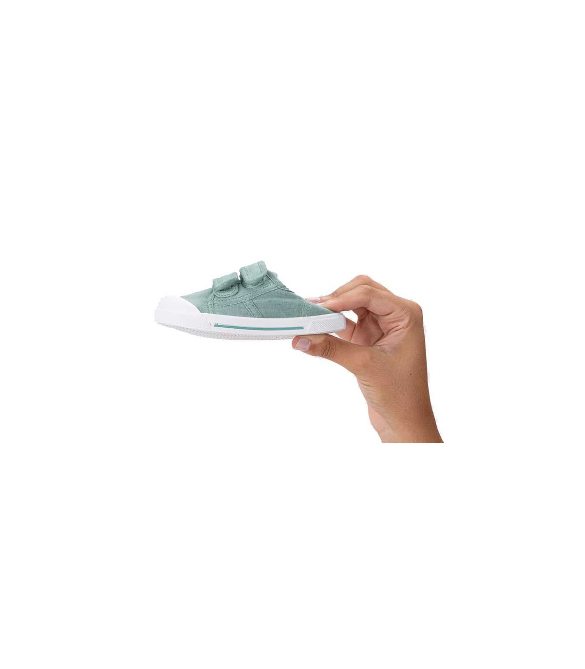 Zapatillas de lona 100 % algodón, color matcha, concepto barefoot wide, con la puntera más ancha, drop cero y suela blandita y flexible, plantilla extraíble y ajuste con tiras adherentes. Lavar en agua fría sin la plantilla.