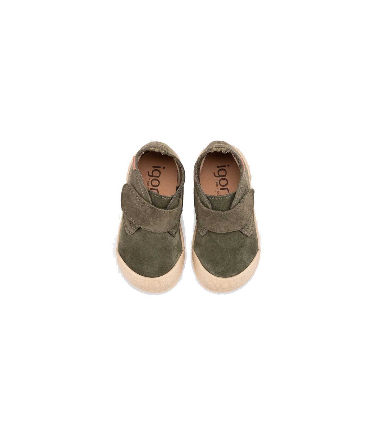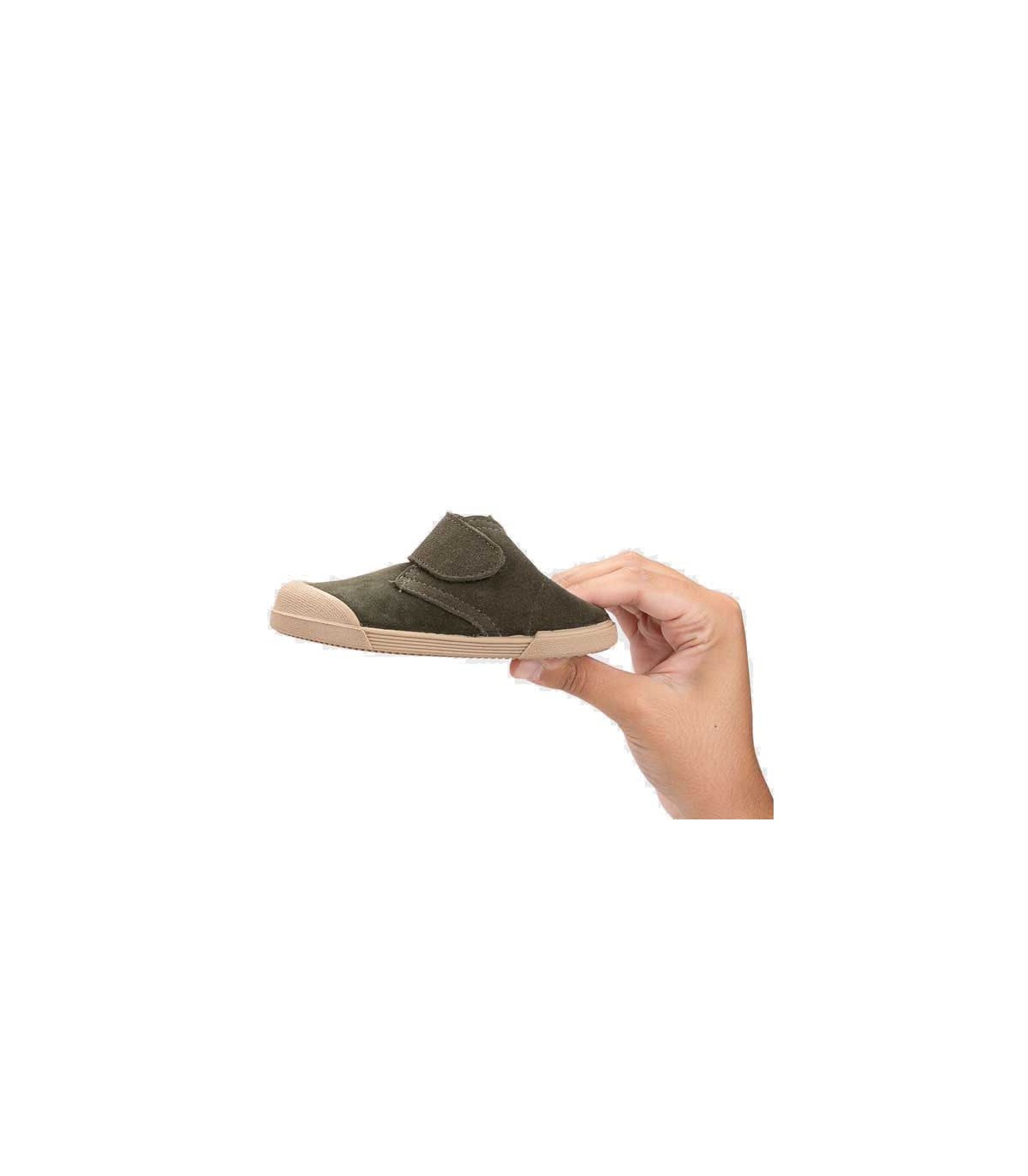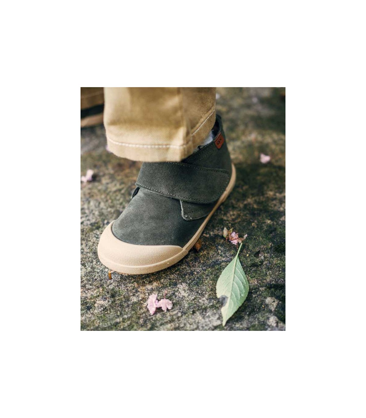 Botín de serraje concepto barefoot, flexible y blandito con drop cero. Plantilla extraíble acolchada y cierre con tira adhesiva para un buen ajuste. Color musgo.
