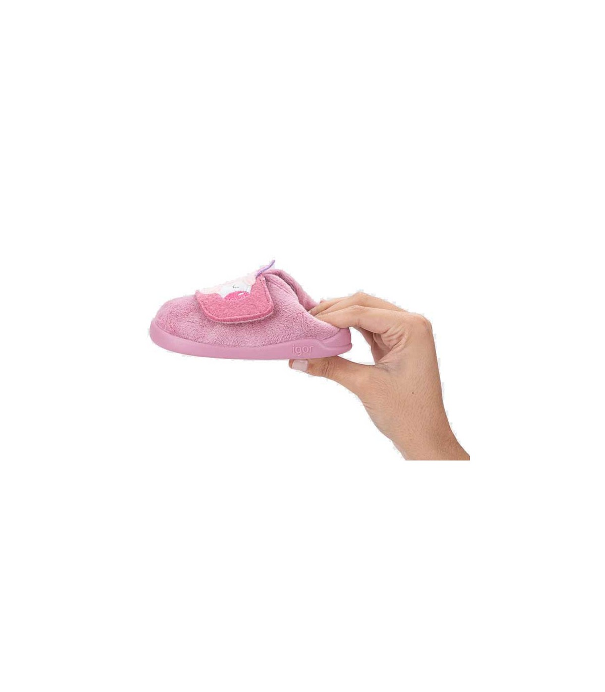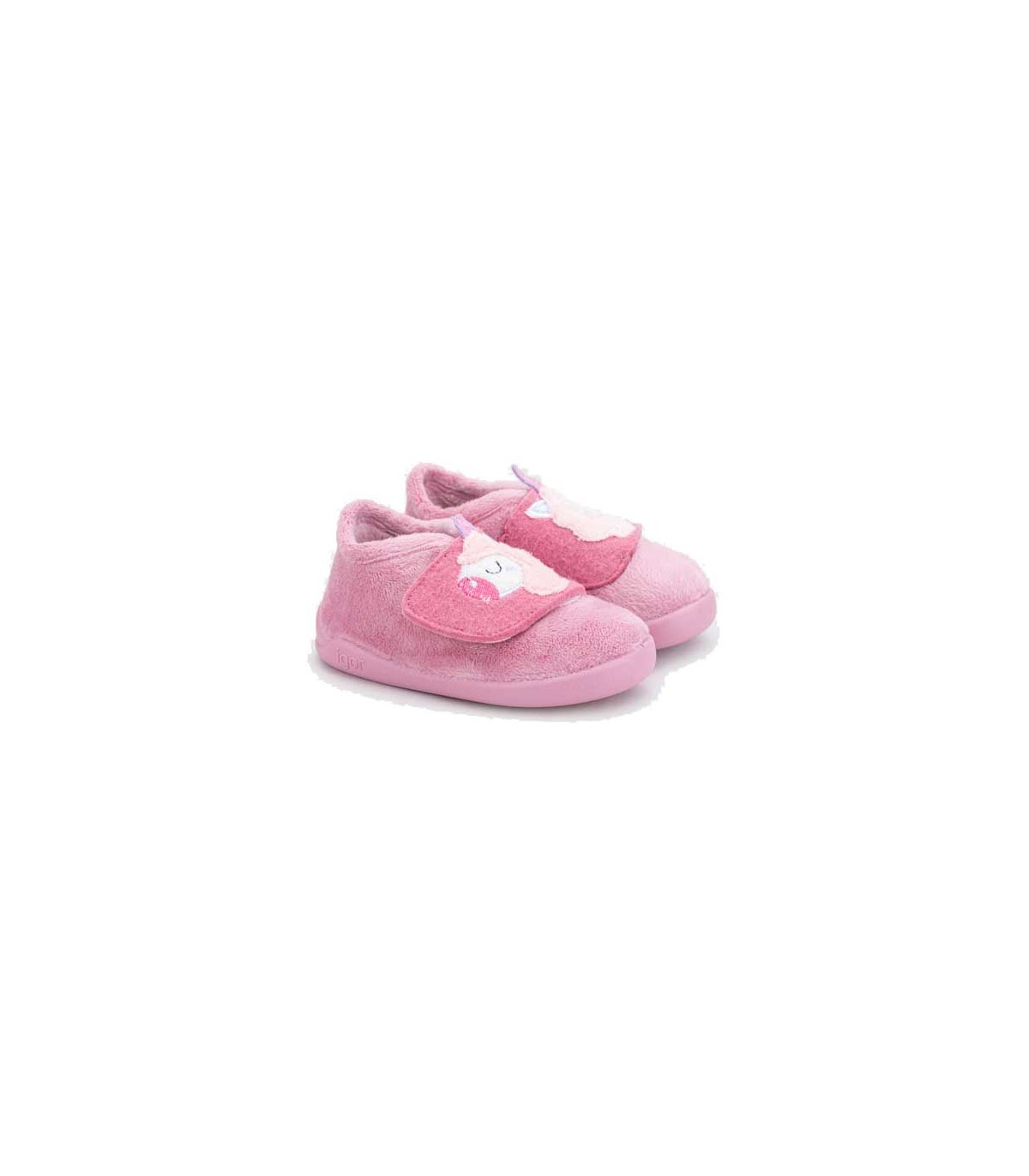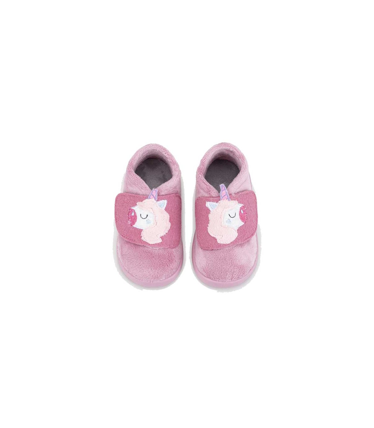 Zapatilla de estar por casa en color ros, con detalle de unicornio, de concepto barefoot, con cero drop, flexible y blandita. Hecha con un tejido blandito, suave y calentito.