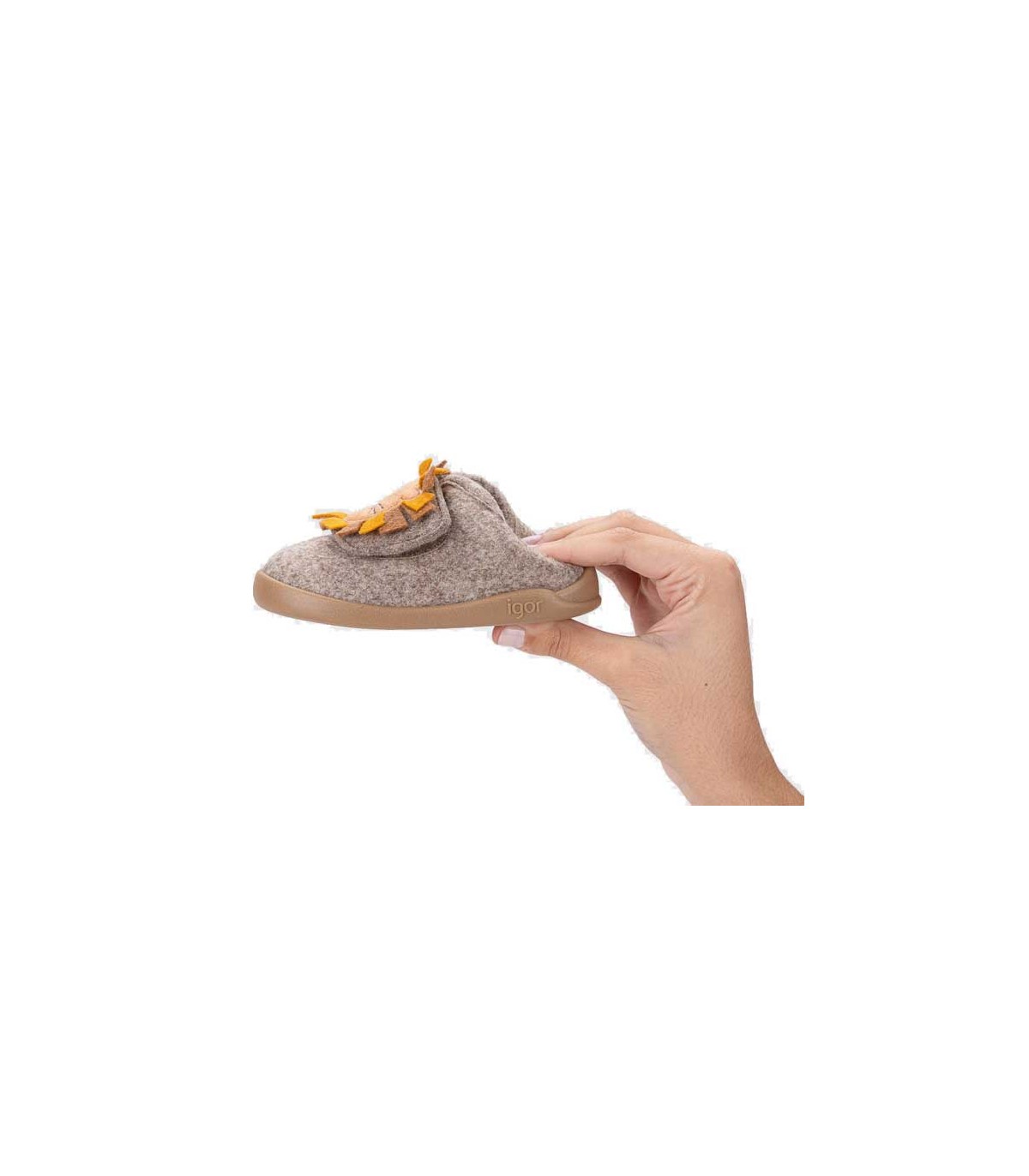 Zapatilla de estar por casa en color teja, con detalle de erizo, de concepto barefoot, con cero drop, flexible y blandita. Hecha con un tejido blandito, suave y calentito.