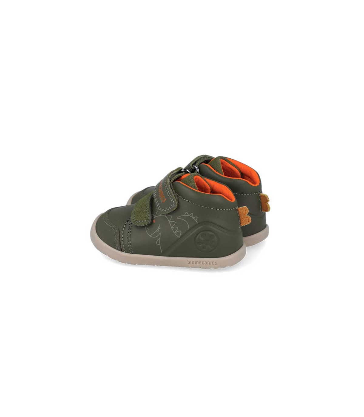 Bota Biomecanics bebé con diseño de dinosaurios en color verde. Parte superior de piel con refuerzo en la puntera que es más ancha para que los dedos estén libres. Plantilla extraíble con tratamiento anti-bacterias.