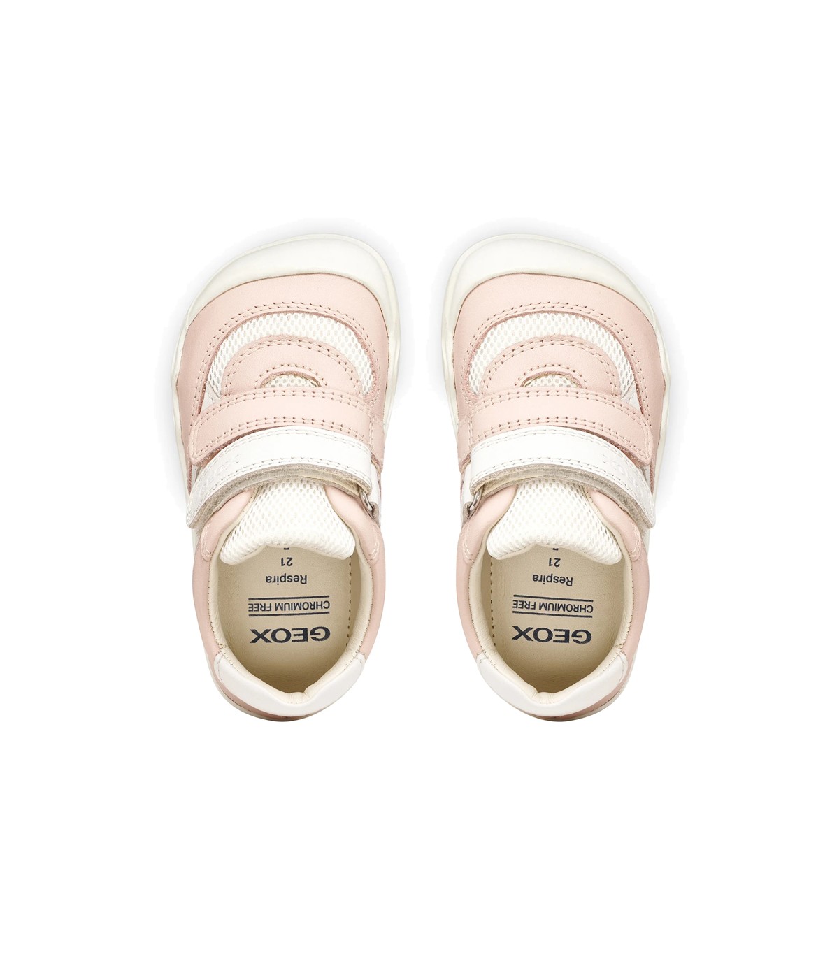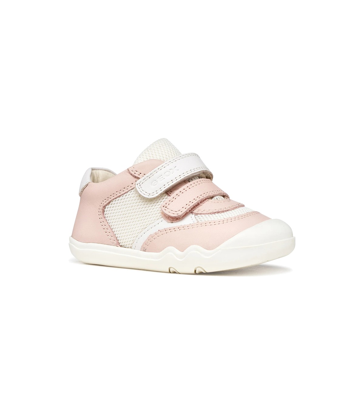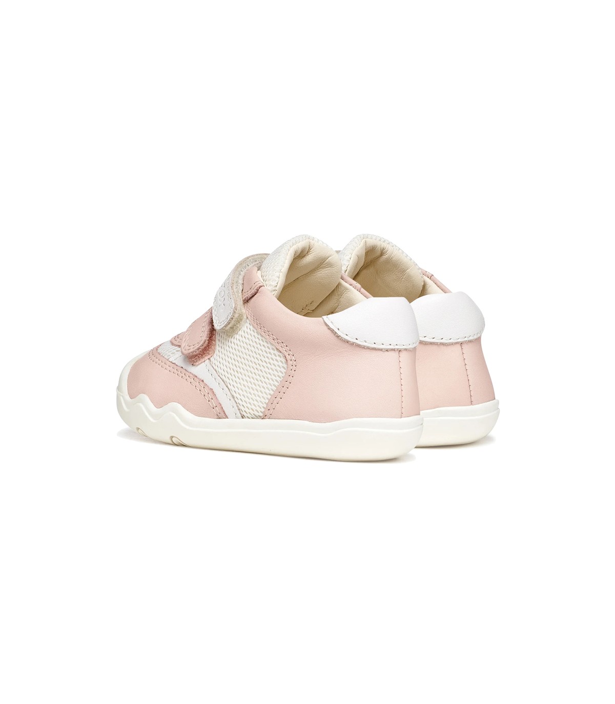 Zapatillas deportivas para bebé en color rosa y blanco, con la parte superior de piel sintética y malla textil, interior y plantilla de piel. Barefoot para que el niño pueda mover los dedos libremente y cero drop. Ajuste con dos tiras adherentes.