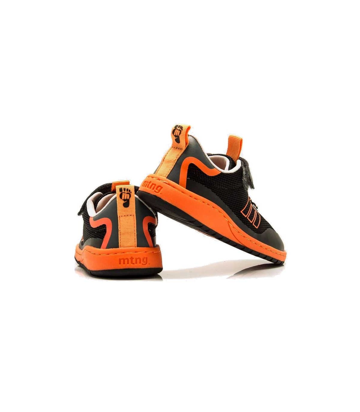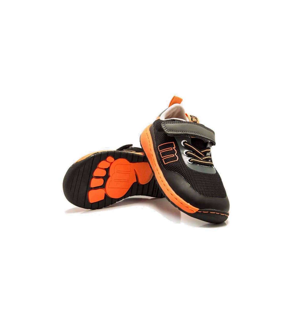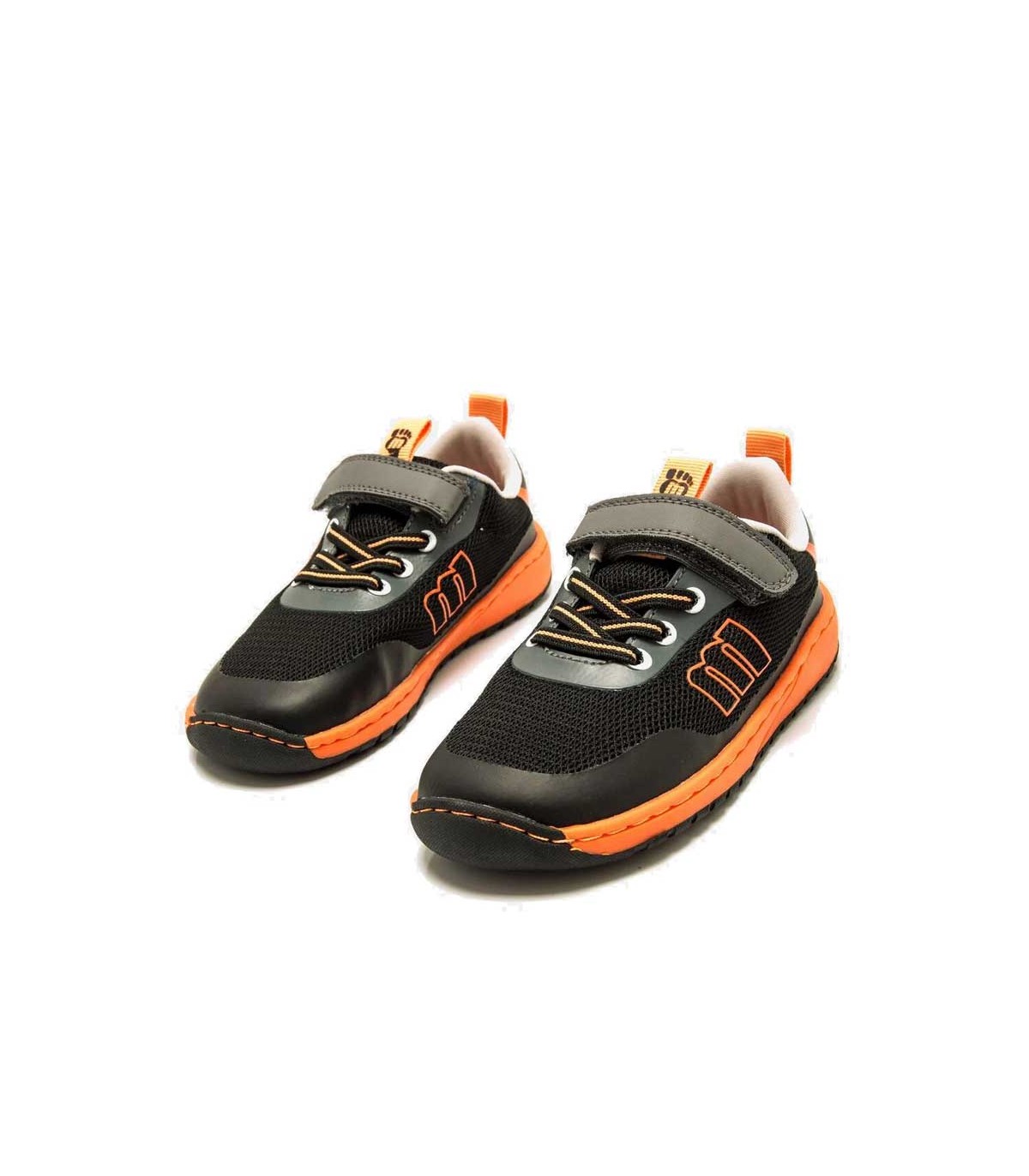 Zapatilla deportiva infantil en color negro y gris con logo de la marca bordado en el lateral. Ajuste con cordones elásticos y tira adhesiva para un ajuste más cómodo. Las deportivas Mustang Free están desarrolladas y diseñadas en colaboración con el traumatólogo deportivo Dr. Juanjo López para respetar el desarrollo natural del pie de los niños. Su puntera ancha permite el movimiento libre de los dedos dentro del zapato. La plantilla es extraíble y la suela tiene drop cero.