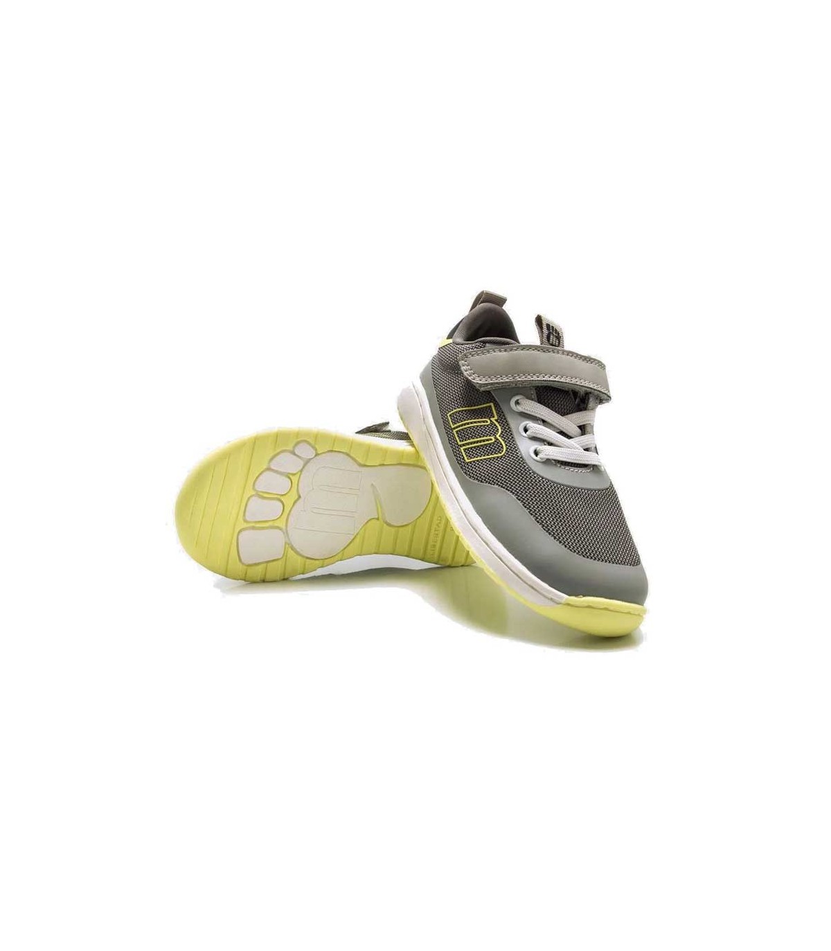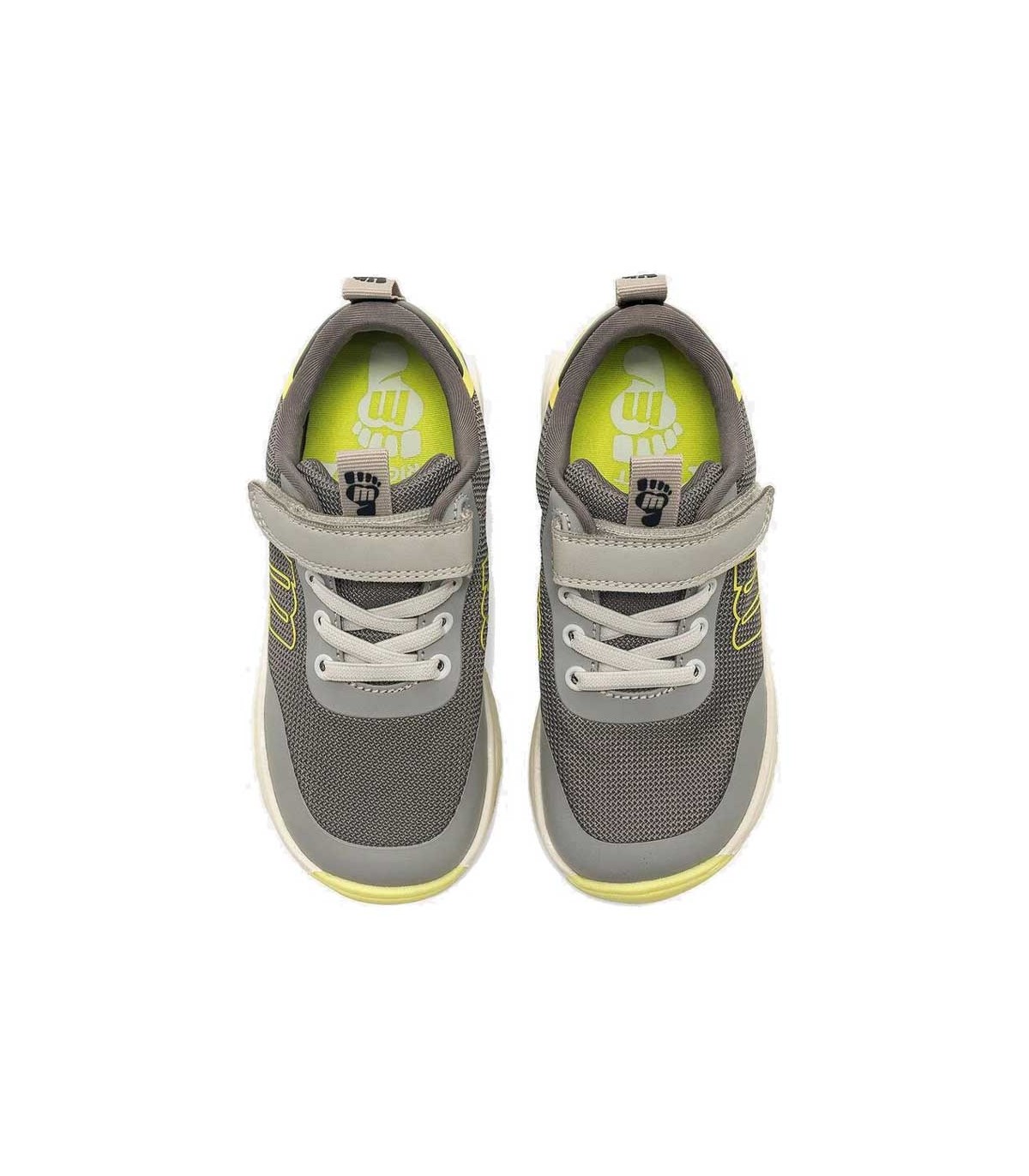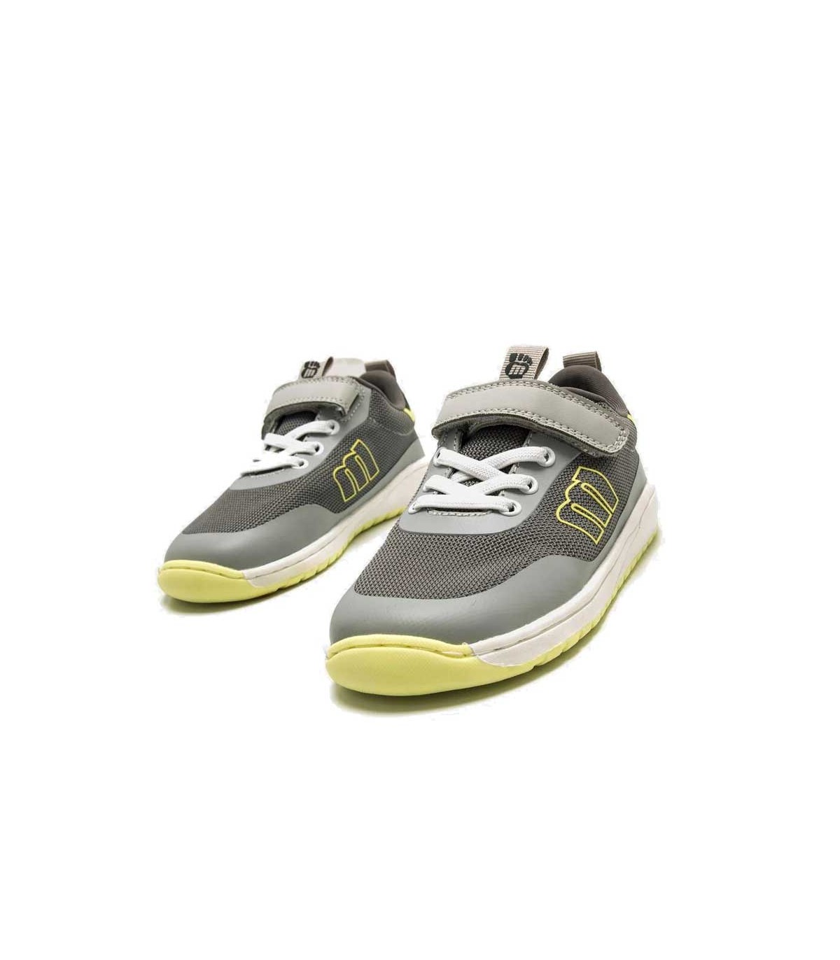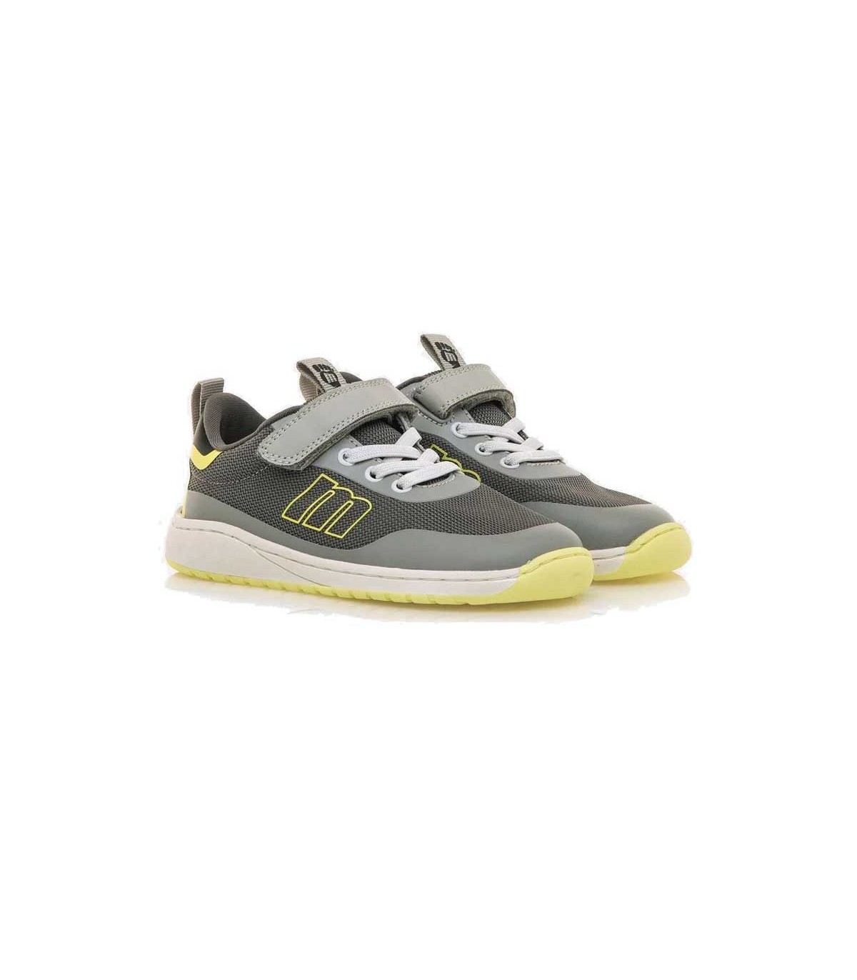 Zapatilla deportiva infantil en color gris con logo de la marca bordado en el lateral. Ajuste con cordones elásticos y tira adhesiva para un ajuste más cómodo. Las deportivas Mustang Free están desarrolladas y diseñadas en colaboración con el traumatólogo deportivo Dr. Juanjo López para respetar el desarrollo natural del pie de los niños. Su puntera ancha permite el movimiento libre de los dedos dentro del zapato. La plantilla es extraíble y la suela tiene drop cero.