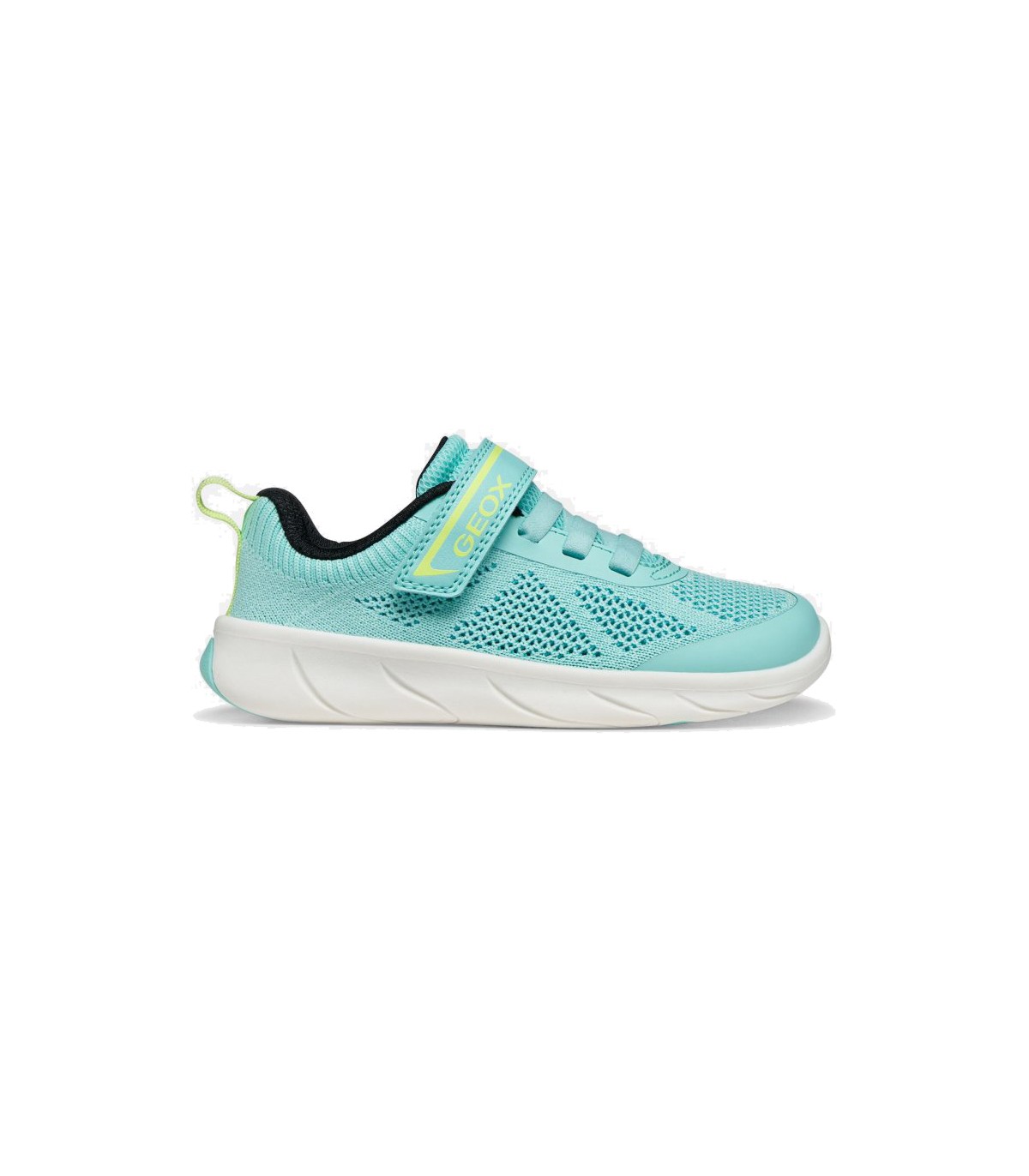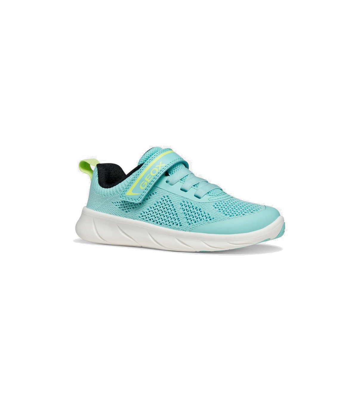 Zapatilla deportiva para niños en color turquesa y detalles en lima, fabricada en malla textil transpirable con refuerzos en la puntera y los ojales. Barefoot y cero drop que respeta la pisada natural del pie.
