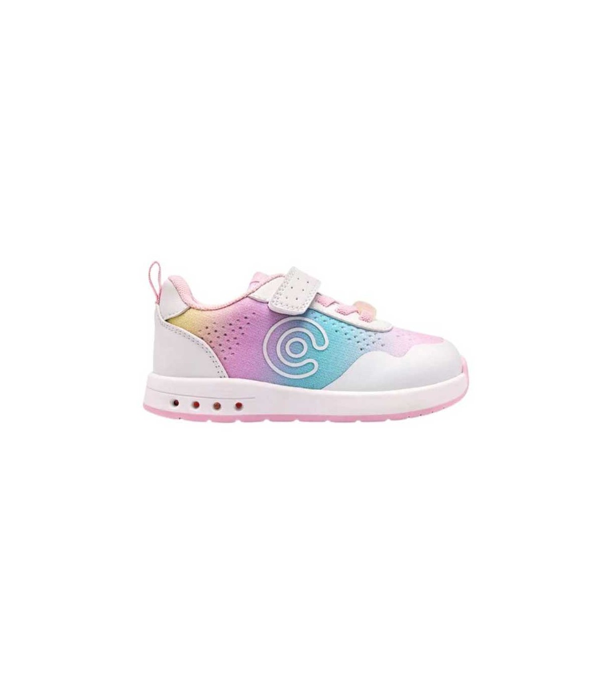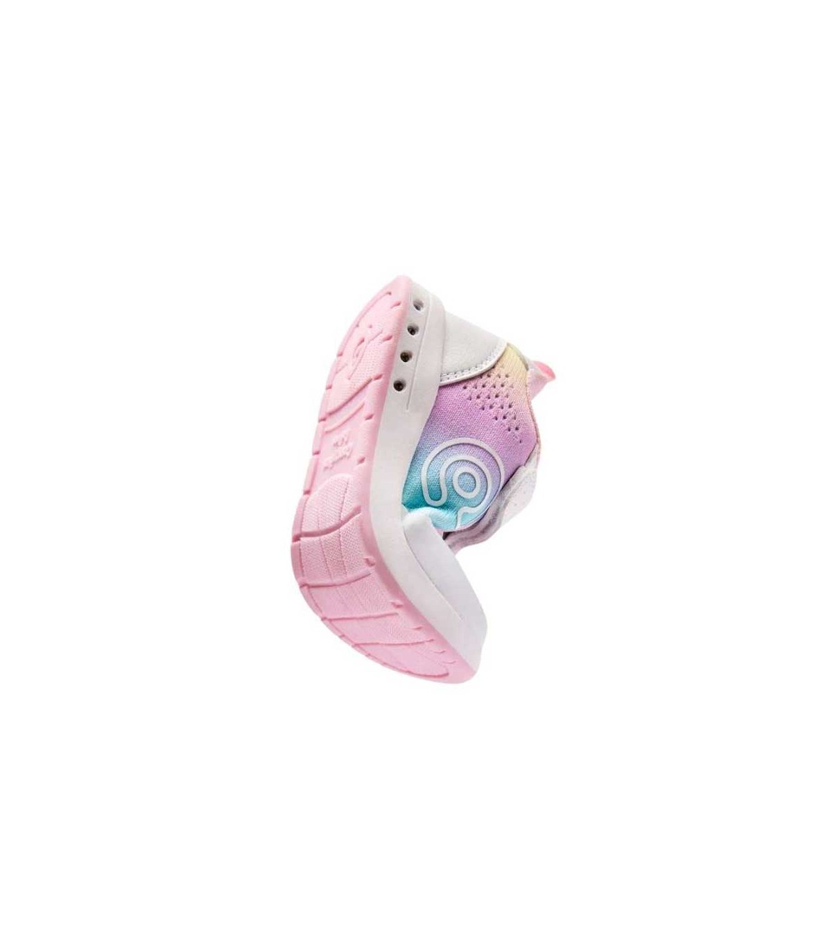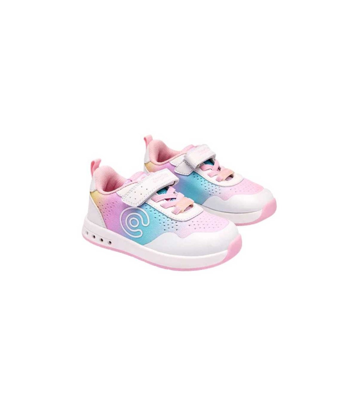 Zapatilla deportiva respetuosa barefoot en color rosa multicolor con luces en las suelas que se activan al caminar, cierre con tira adherente y cordón elástico. Flexibles, ligeros y cómodos para utilizar todo el día.