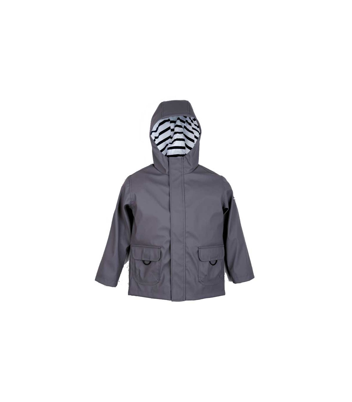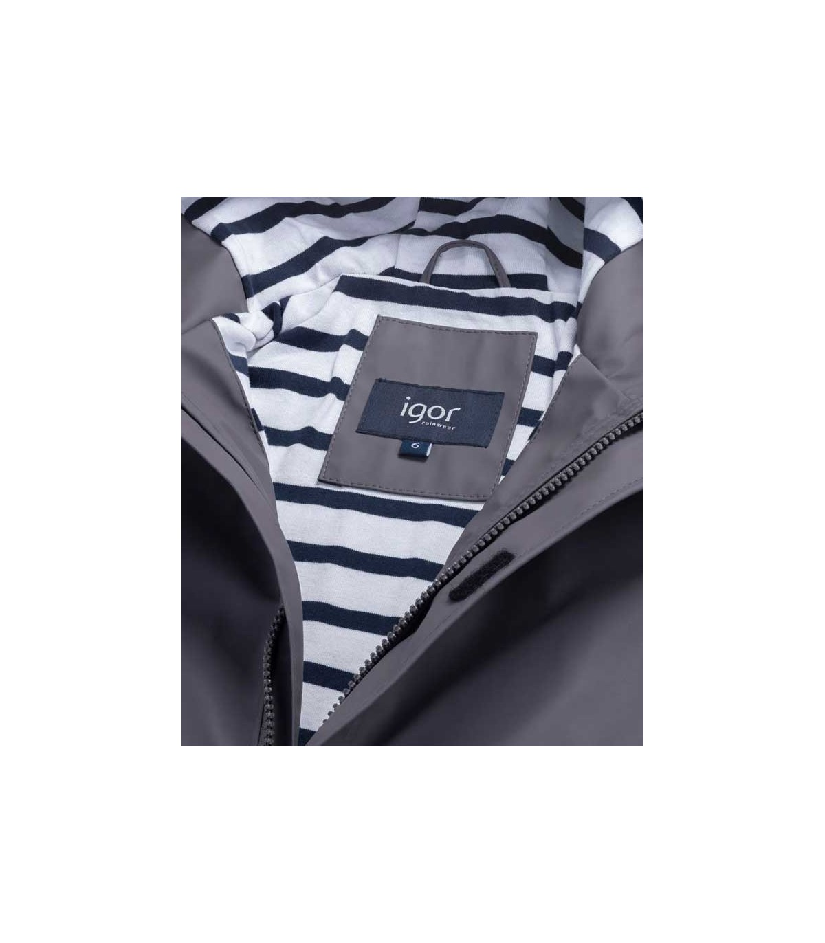 Chaqueta Igor Impermeable con capucha, de color gris, lleva forro de algodón rayado en blanco y marino, cierre con cremallera protegida con solapa y y protección debajo de la barbilla para evitar pellizcos, dos bolsillos delanteros con solapa.