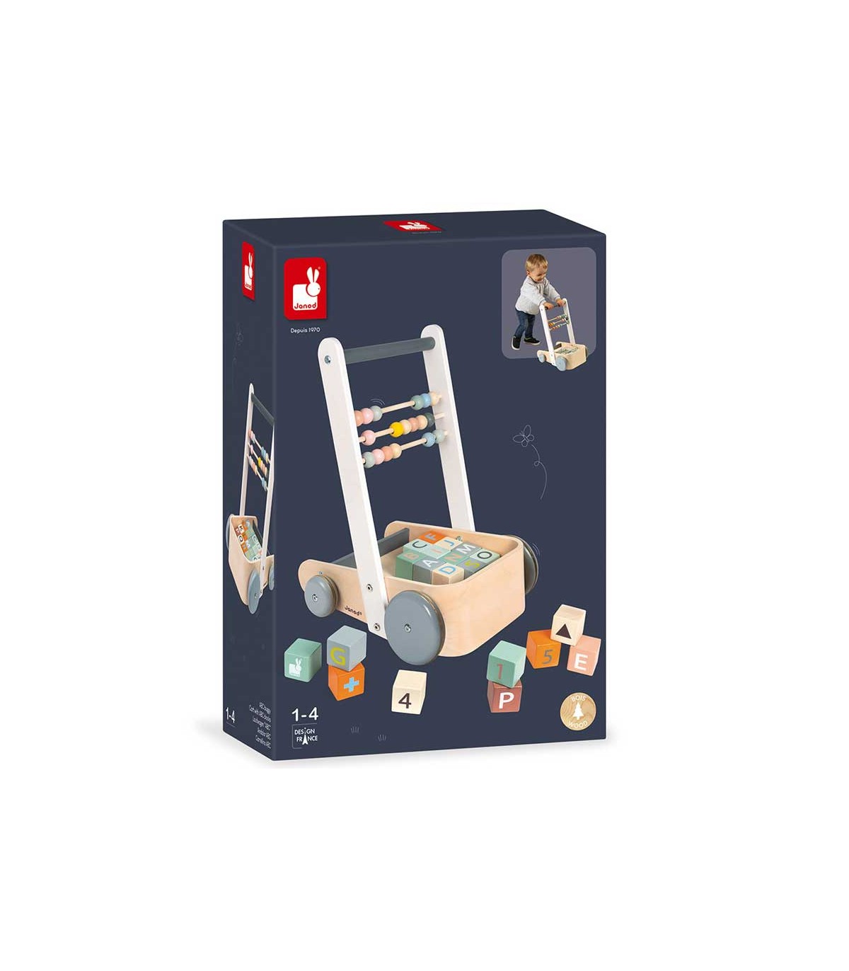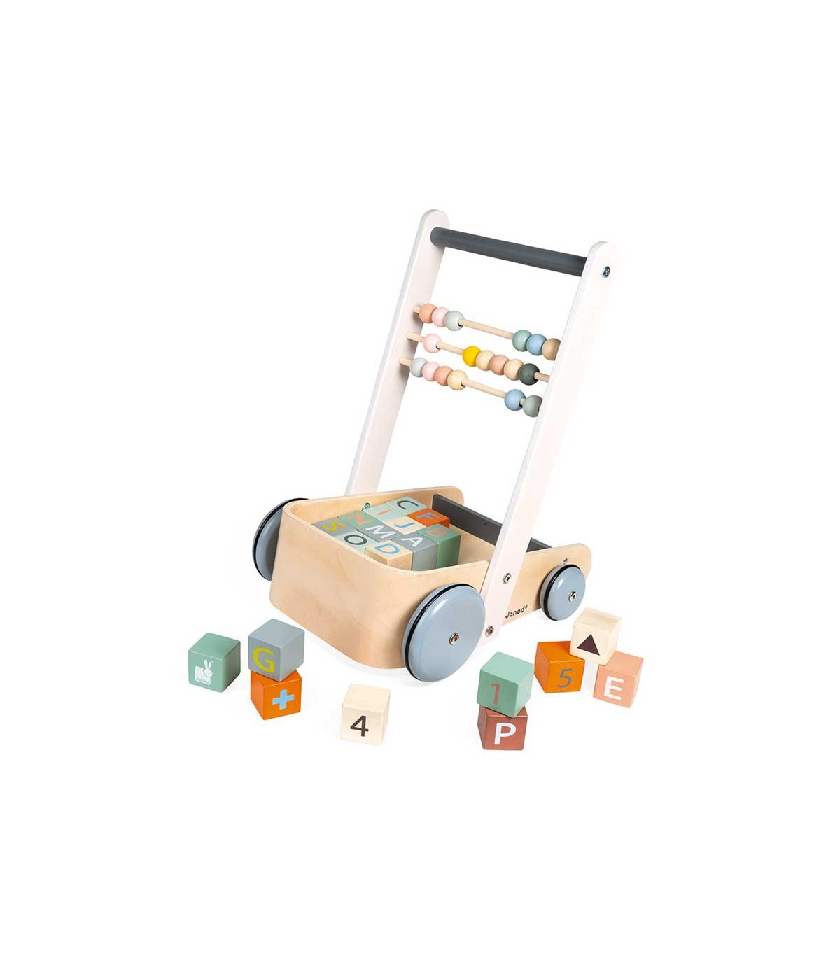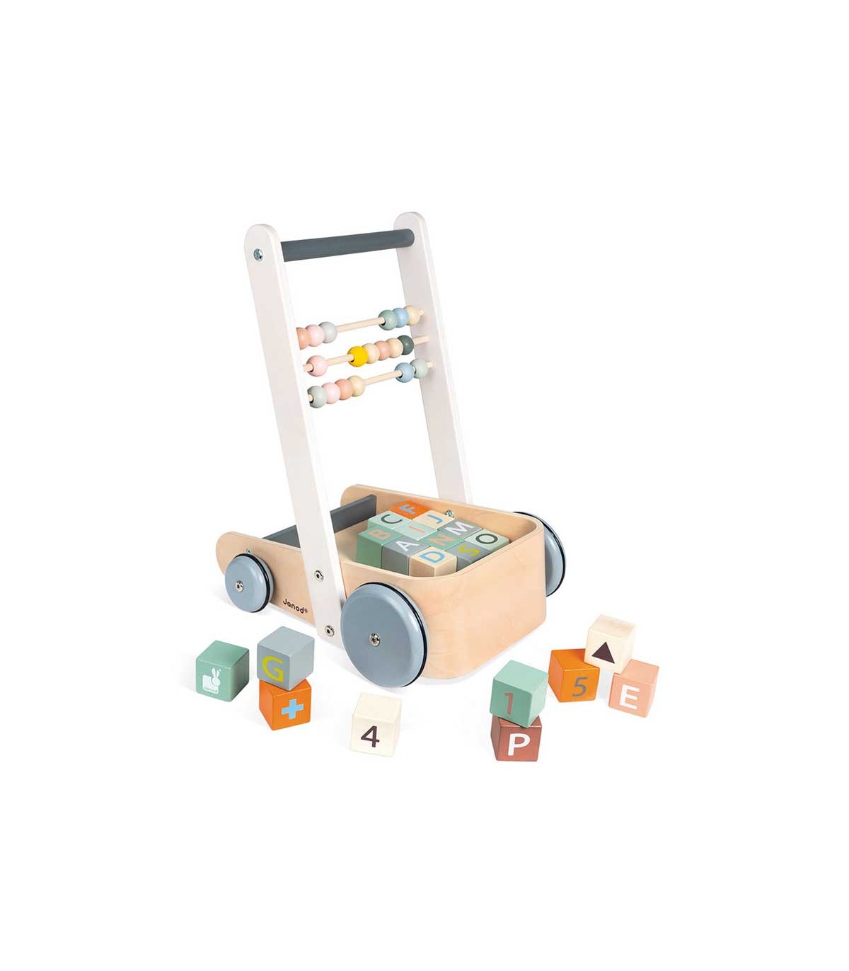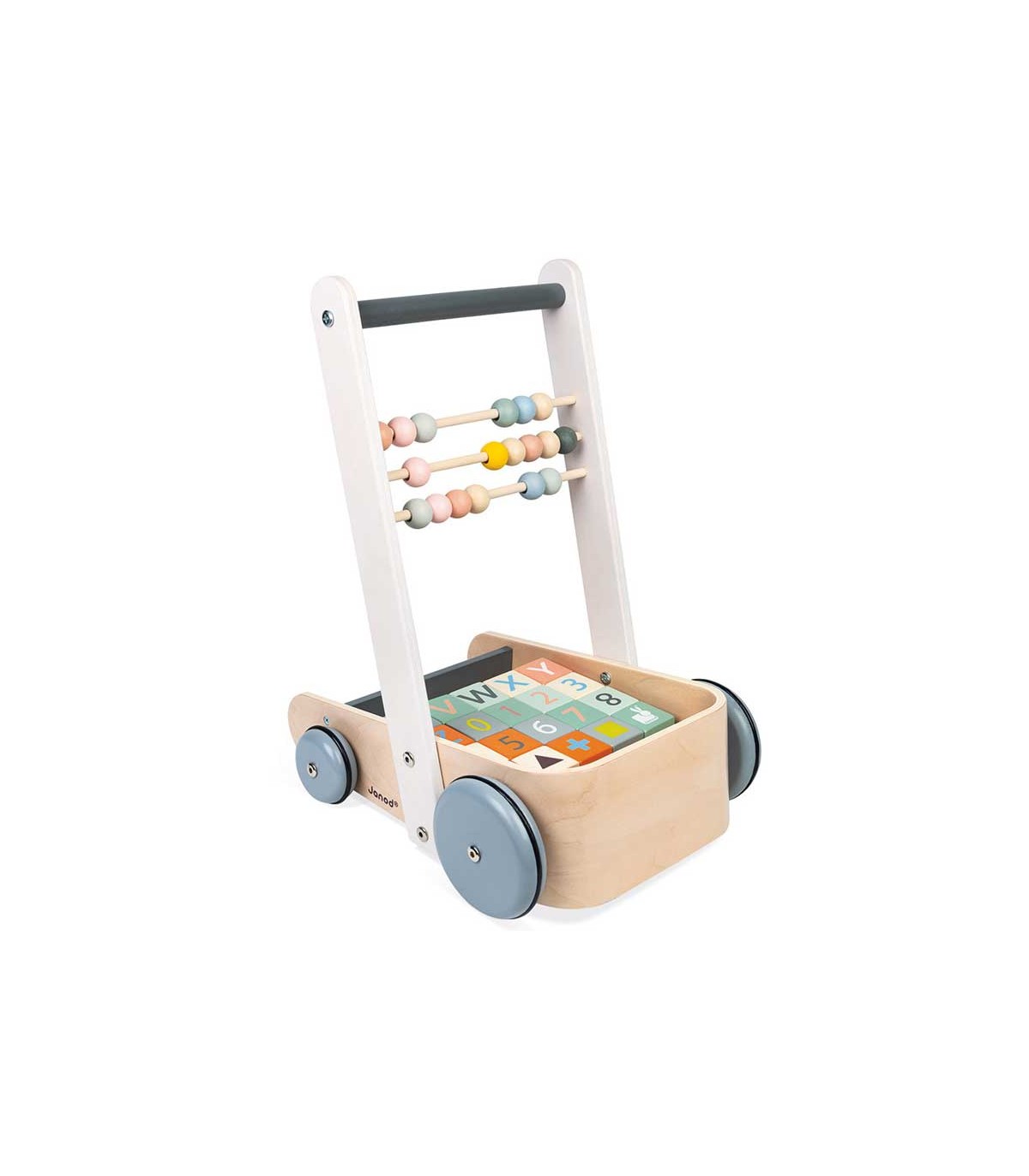 Andador para los primeros pasos del bebé, con 20 cubos con las letras del alfabeto, las cifras y formas sencillas. Cuenta con tres filas de ábaco para empezar a contar. Colores suaves y líneas redondeadas. Tiempo de ensamblaje aproximado: 5 Minutos.