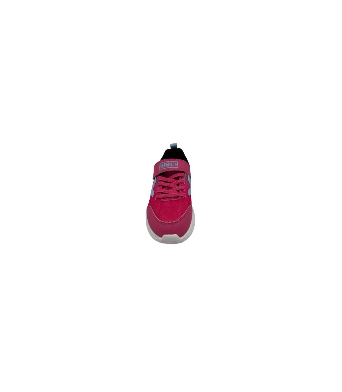 Deportiva Munich en fucsia y negro con el logo en celeste. Muy ligera, perfecta para la escuela, y deportes al aire libre, cierre con velcro y elástico. Con tira adherente y cordón elástico hasta la talla 32, a partir de la talla 33 con cordón.
