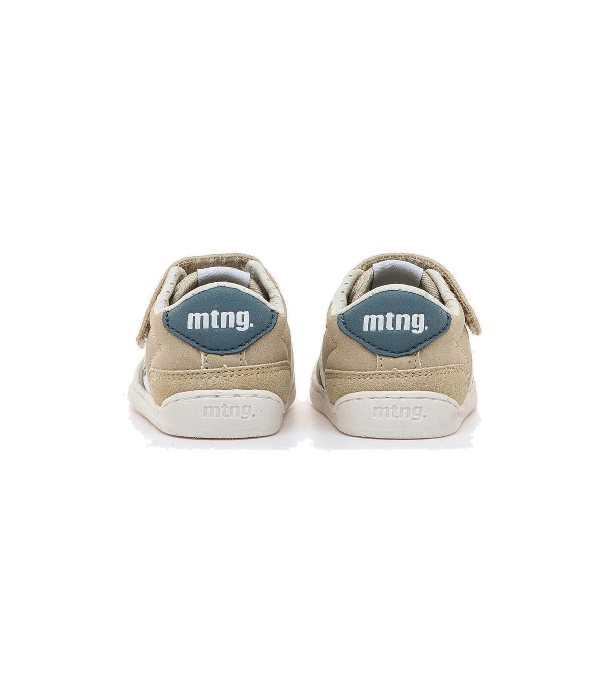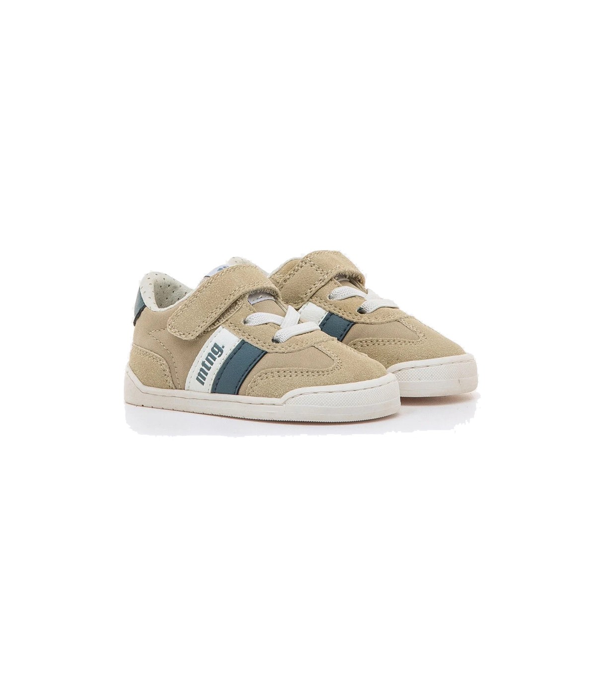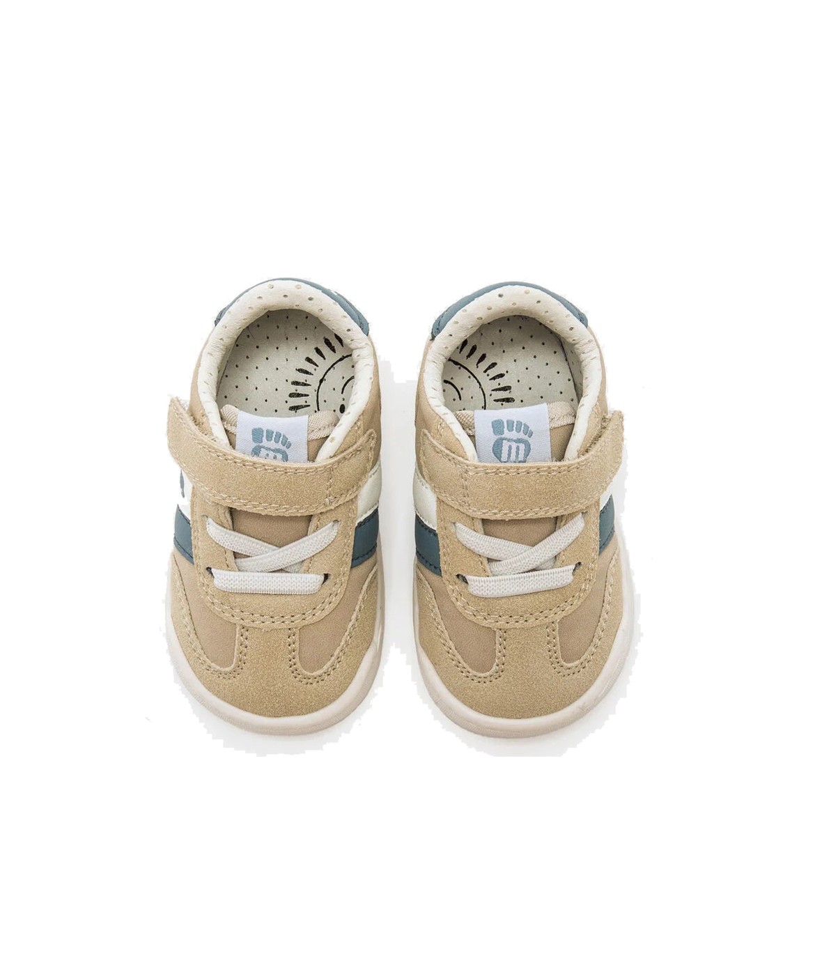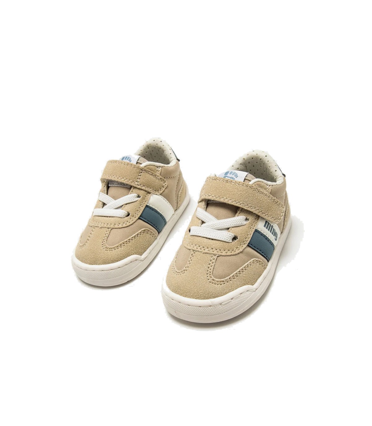 Zapatillas deportivas Mustang Free Baby en color arena con detalles en azul y blanco y suela color blanco, estilo casual. Puntera ancha que permite el libre movimiento de los dedos y drop zero. Plantilla extraíble y fácil apertura para que el niño pueda calzarse y descalzarse por si mismo.