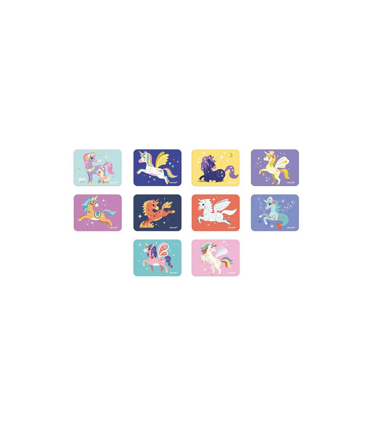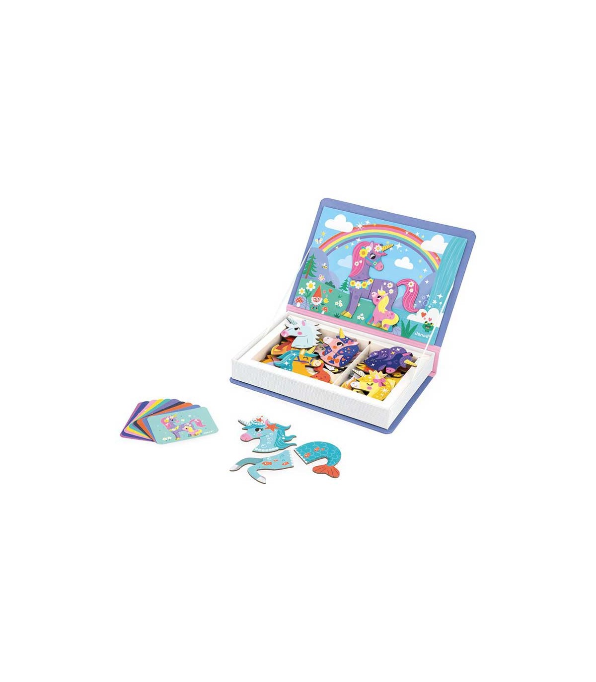 Libro magnético con 44 imanes y 10 cartas de modelo con diferentes unicornios. Adecuado a partir de 3 años. Practico formato en forma de libro para su fácil transporte.