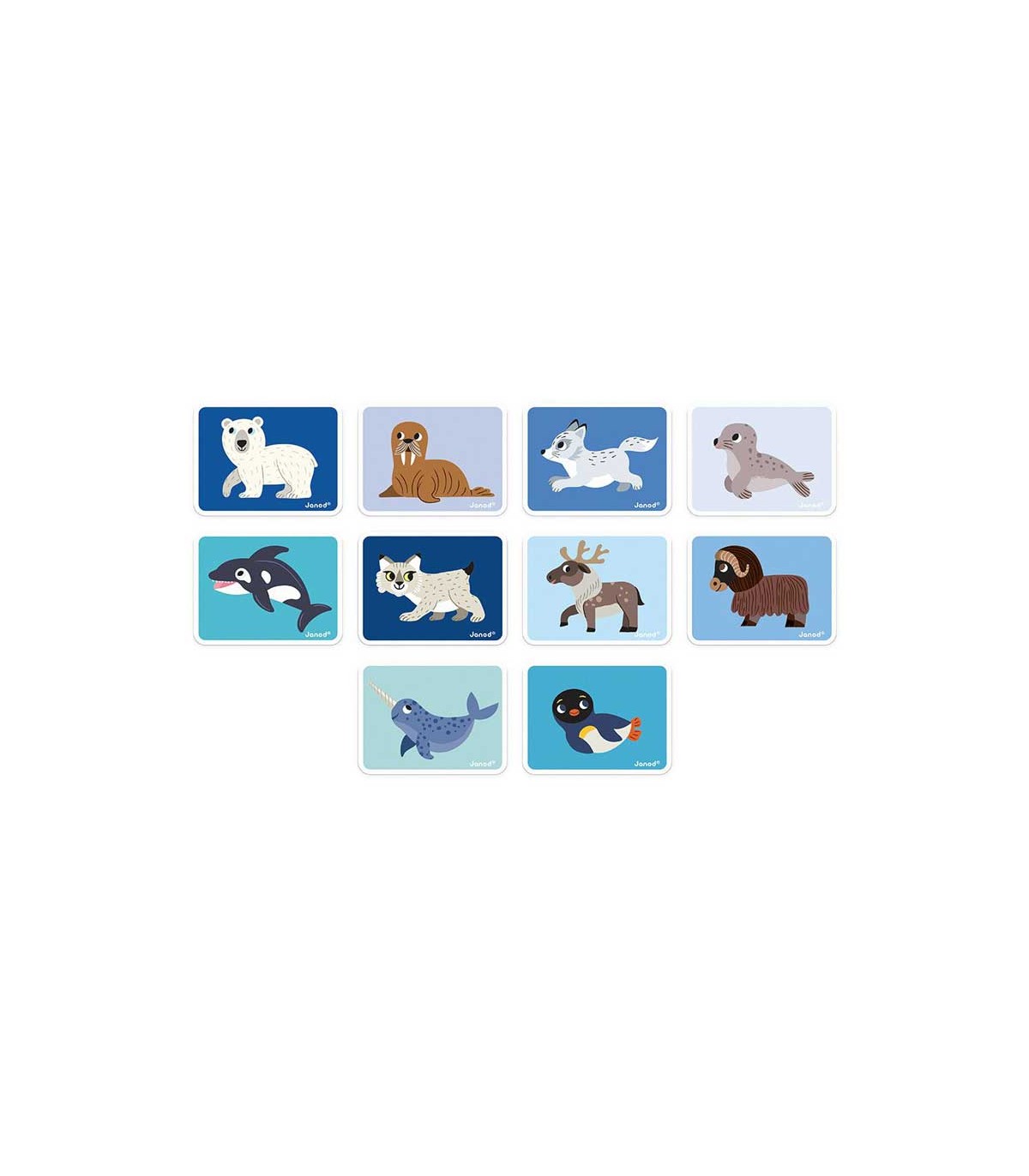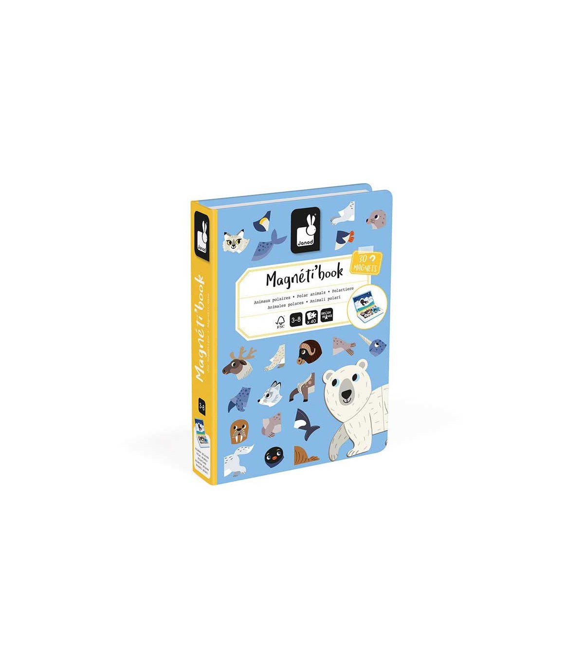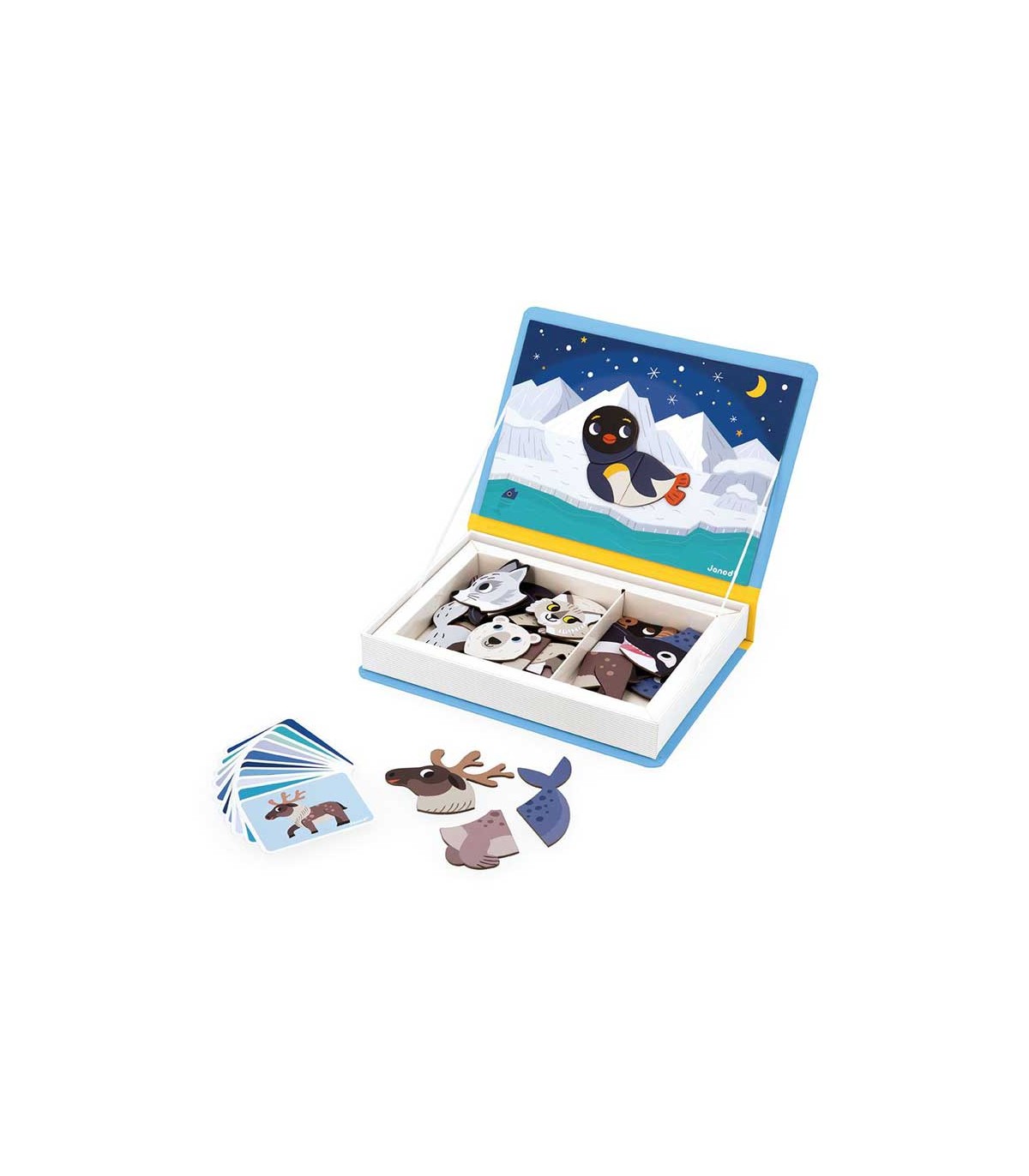 Libro magnético de temática animales polares, incluye 30 imanes y 10 cartas de ejemplo. Formato en forma de libro para guardar las piezas en su interior y facilitar el transporte.