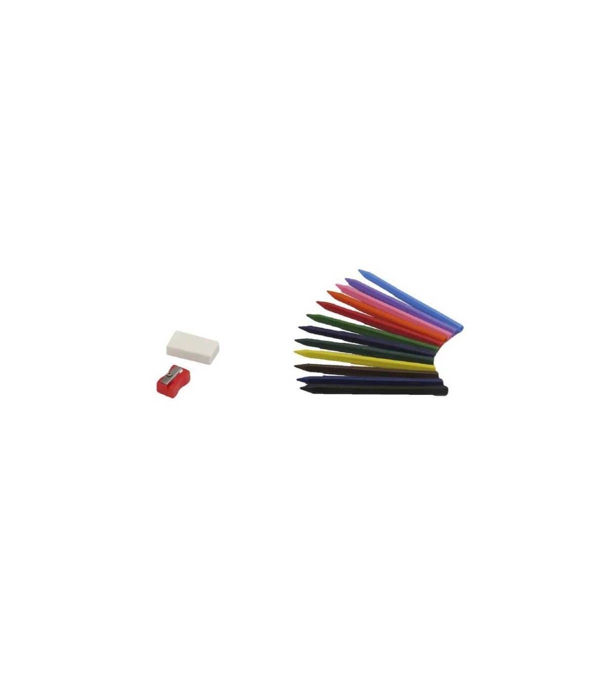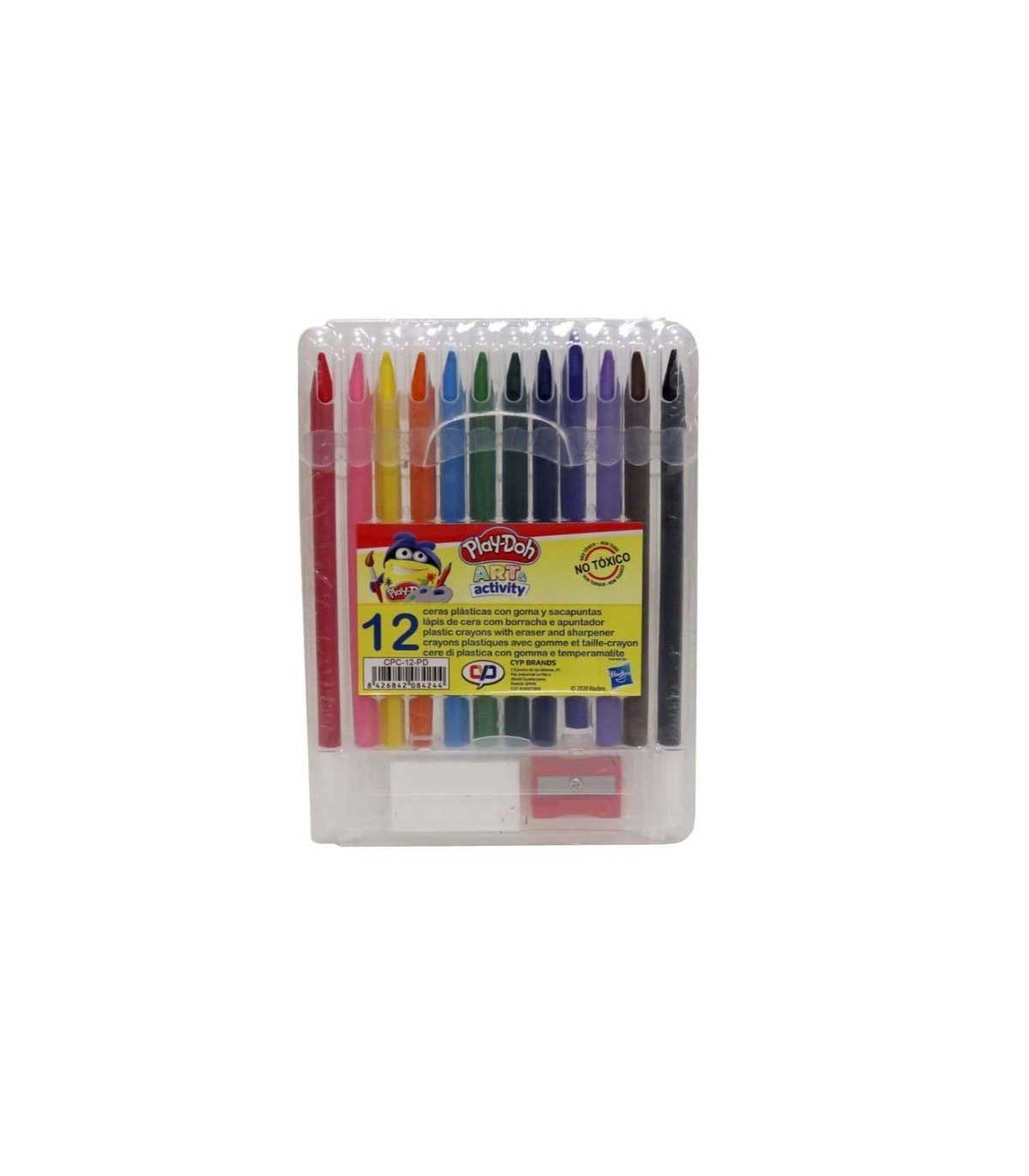 Set de 12 ceras plásticas borrables con goma y sacapuntas. Artículo con licencia Hasbro.