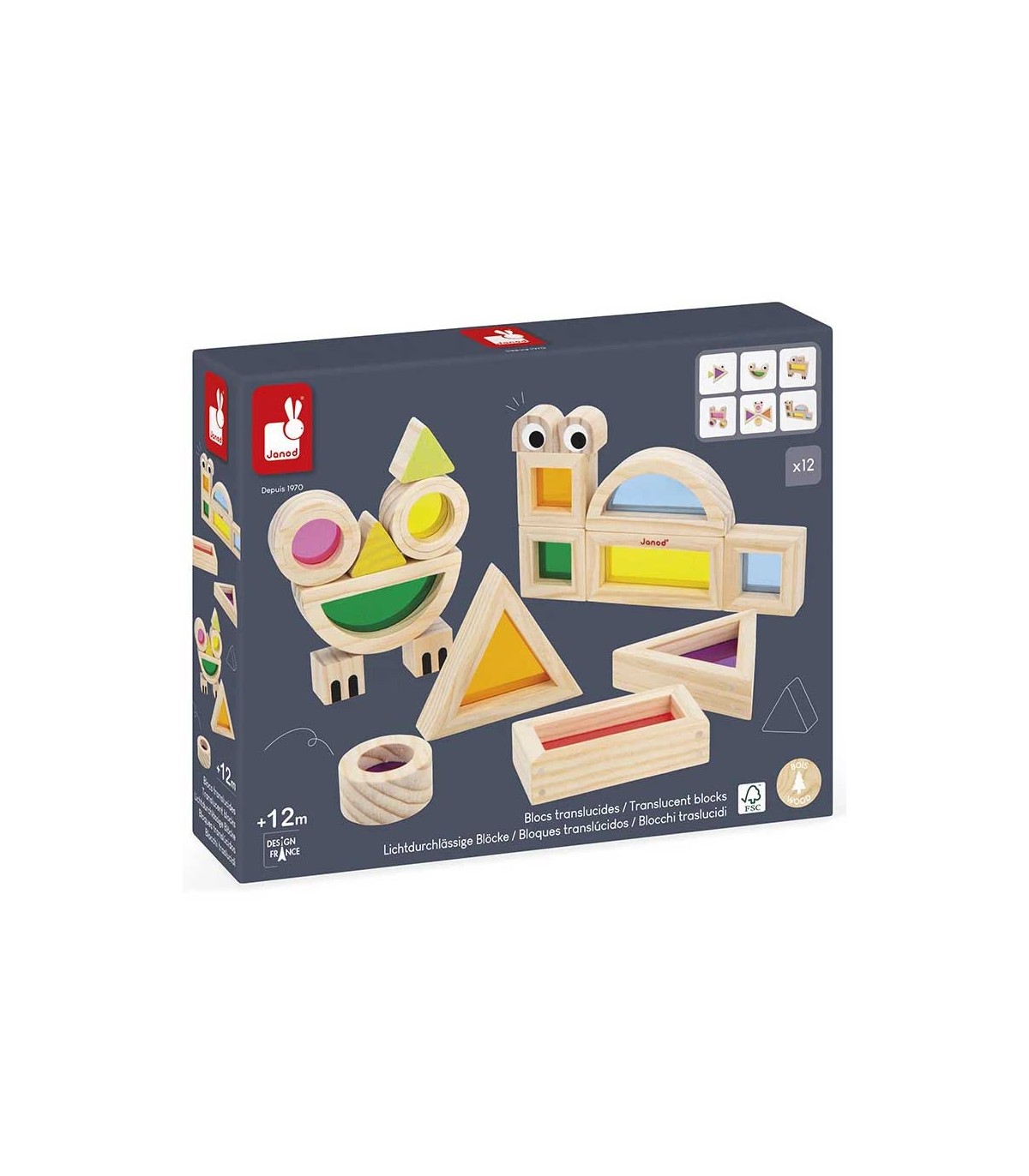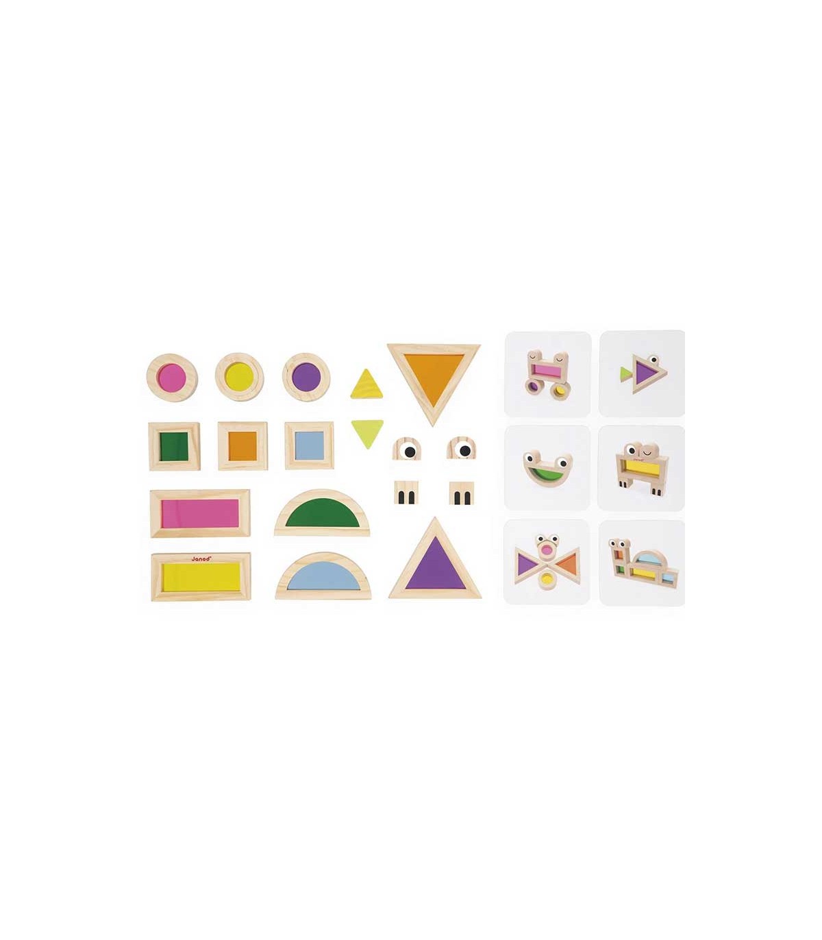 Set compuesto de 12 formas geométricas de colores transparentes y 6 bloques de madera impresos con ojos patas o orejas con 6 tarjetas de ejemplos. El niño aprende a apilar y a reconocer los colores.