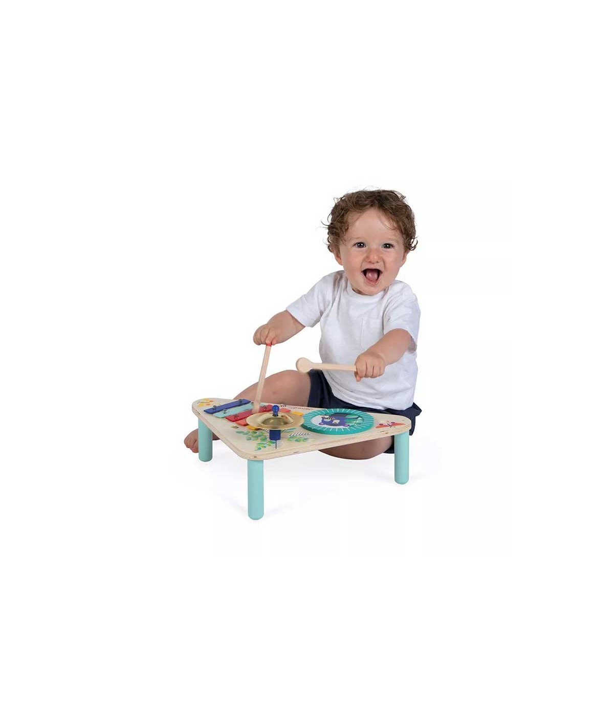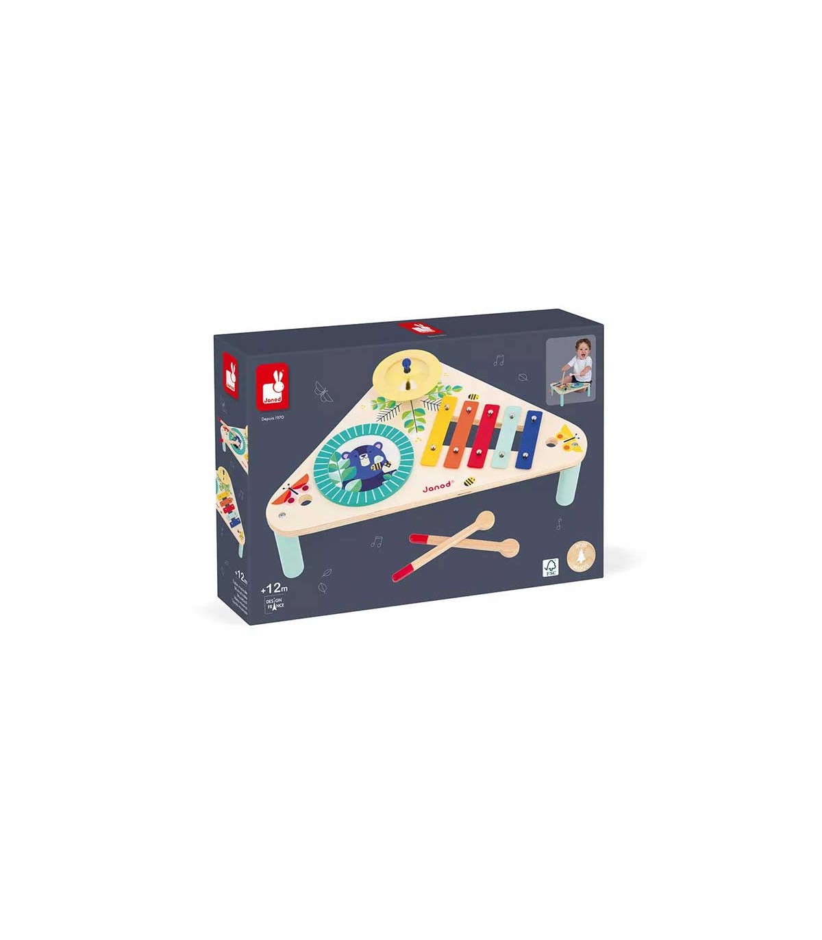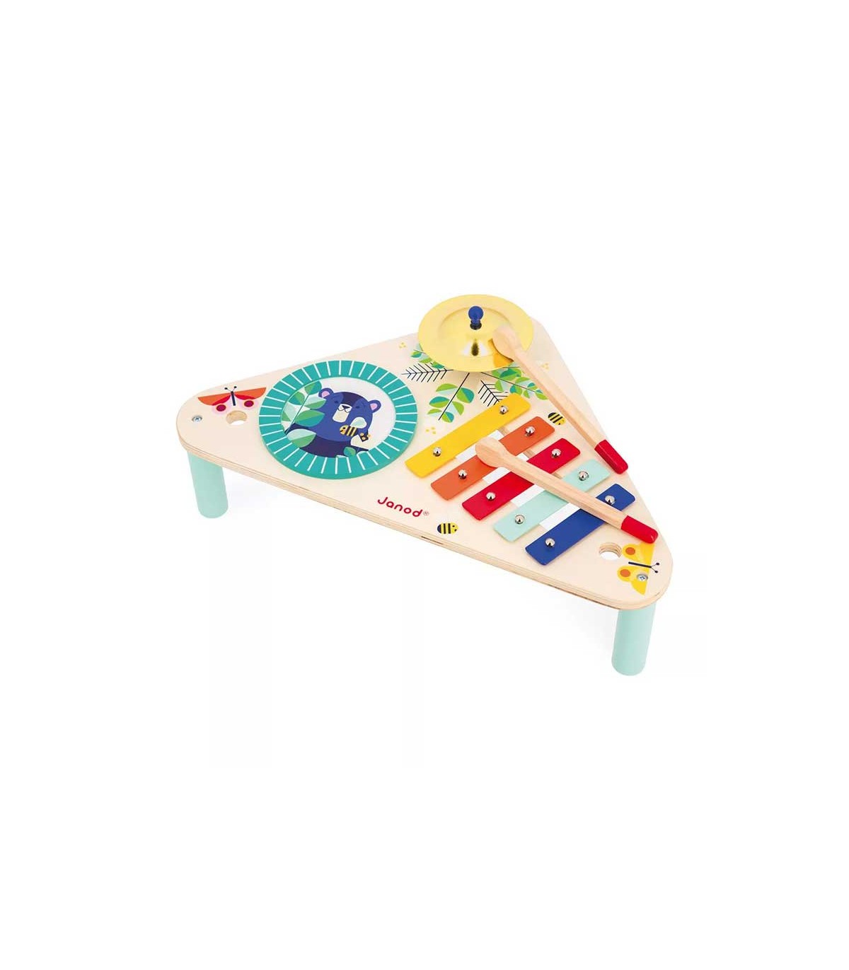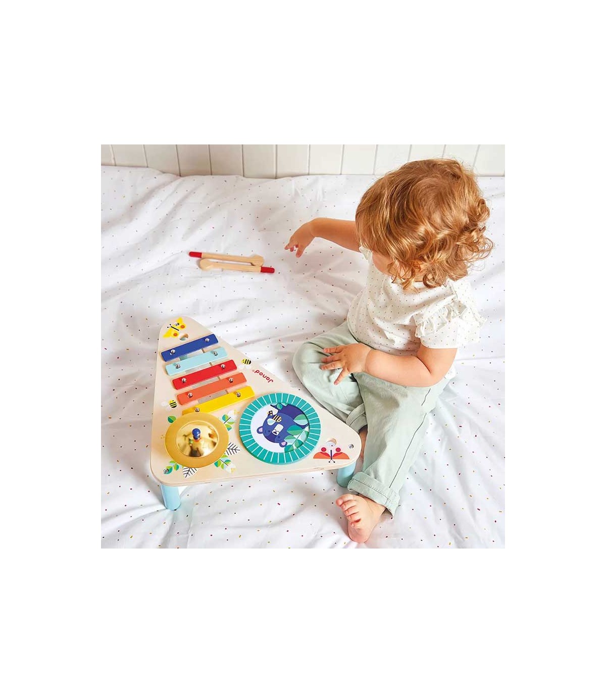Mesa musical compuesta de tres instrumentos, un tambor, un xilófono y un platillo para que el niño pase un rato divertido y conozca los distintos sonidos.