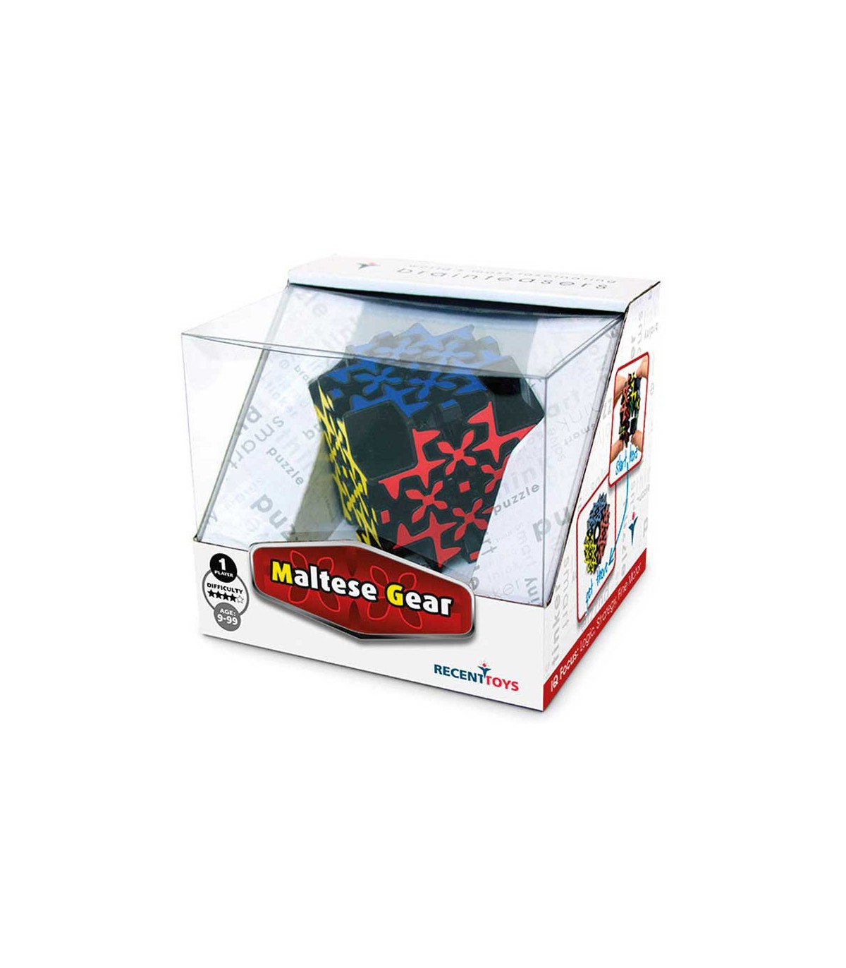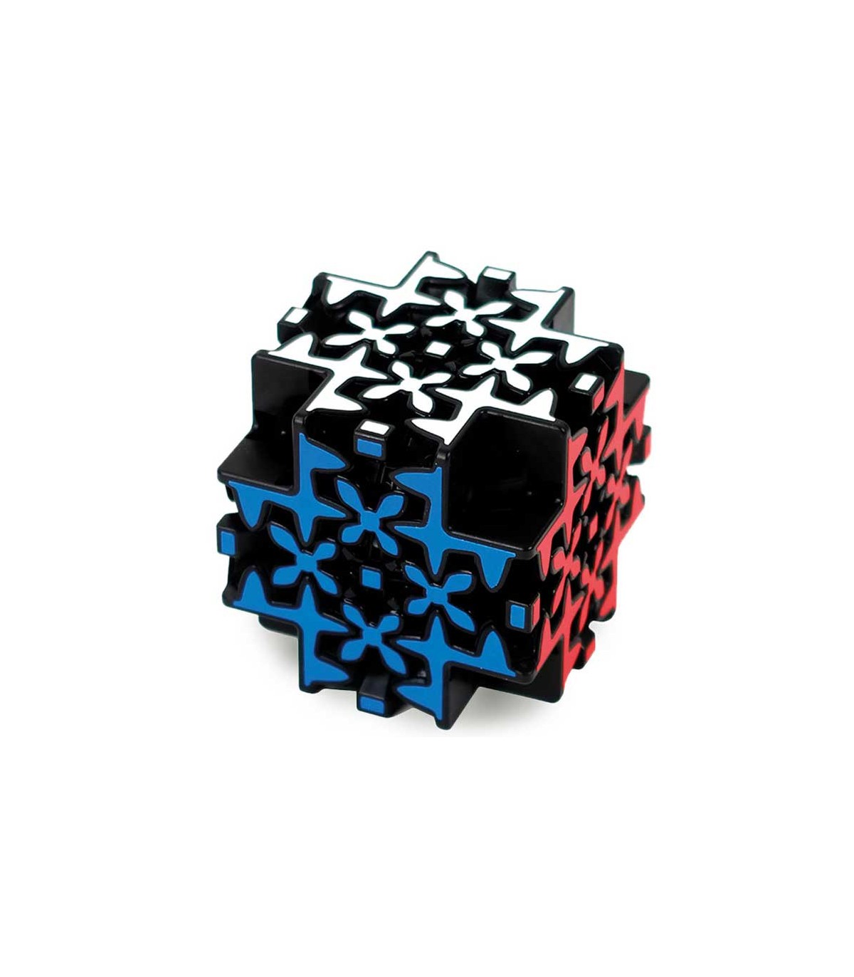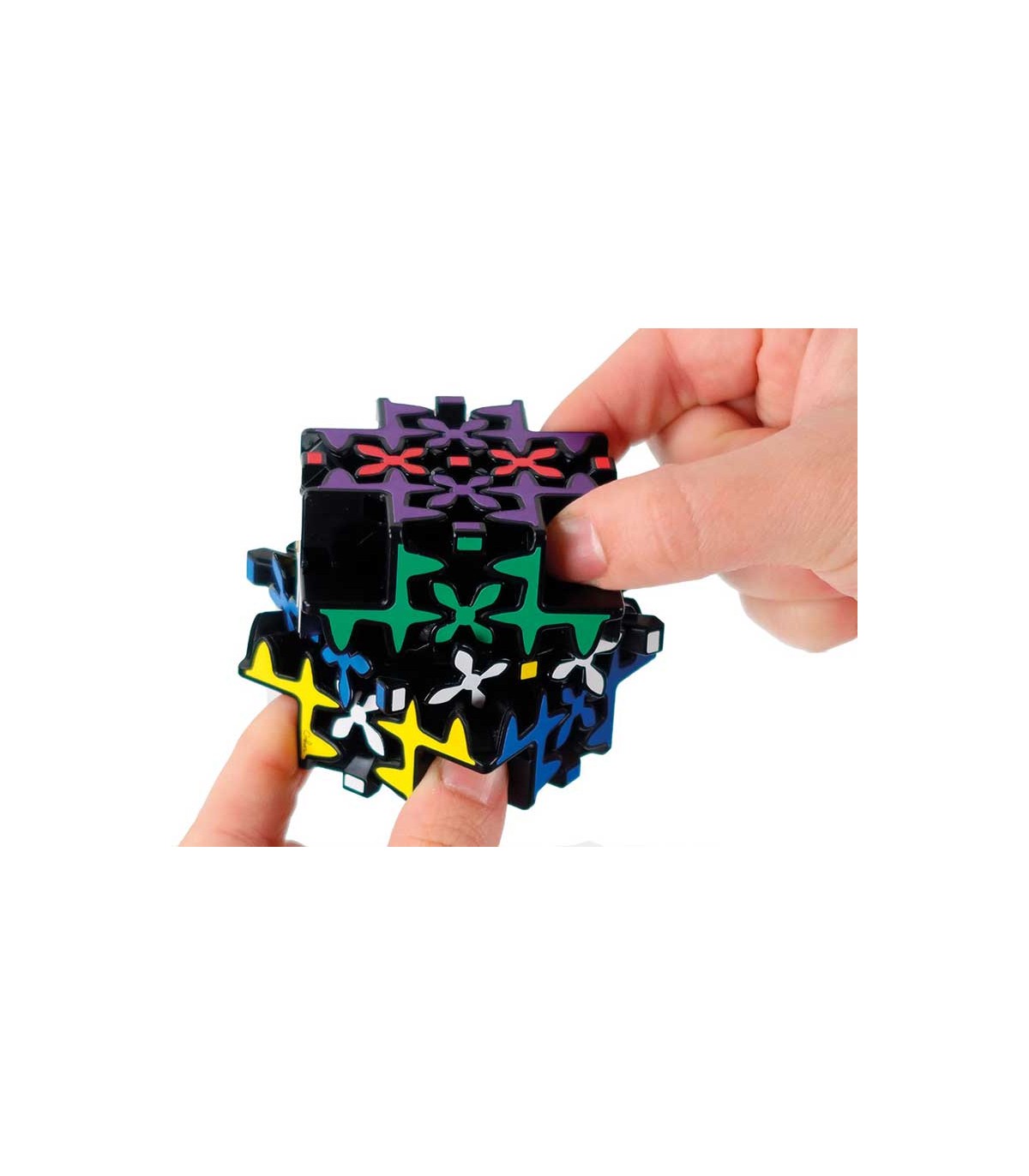 Cubo rompecabezas de engranajes, con hipnóticos movimientos en trono a su interior hueco. Haz girar el cubo para mezclar los colores y luego resuélvelo para que quede cada cara del mismo color.