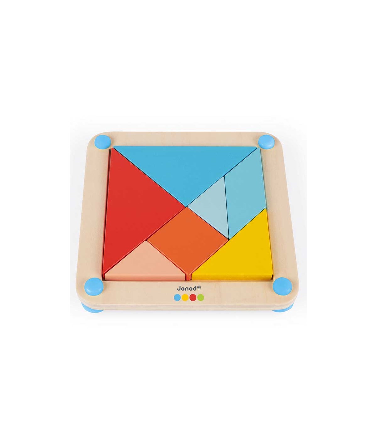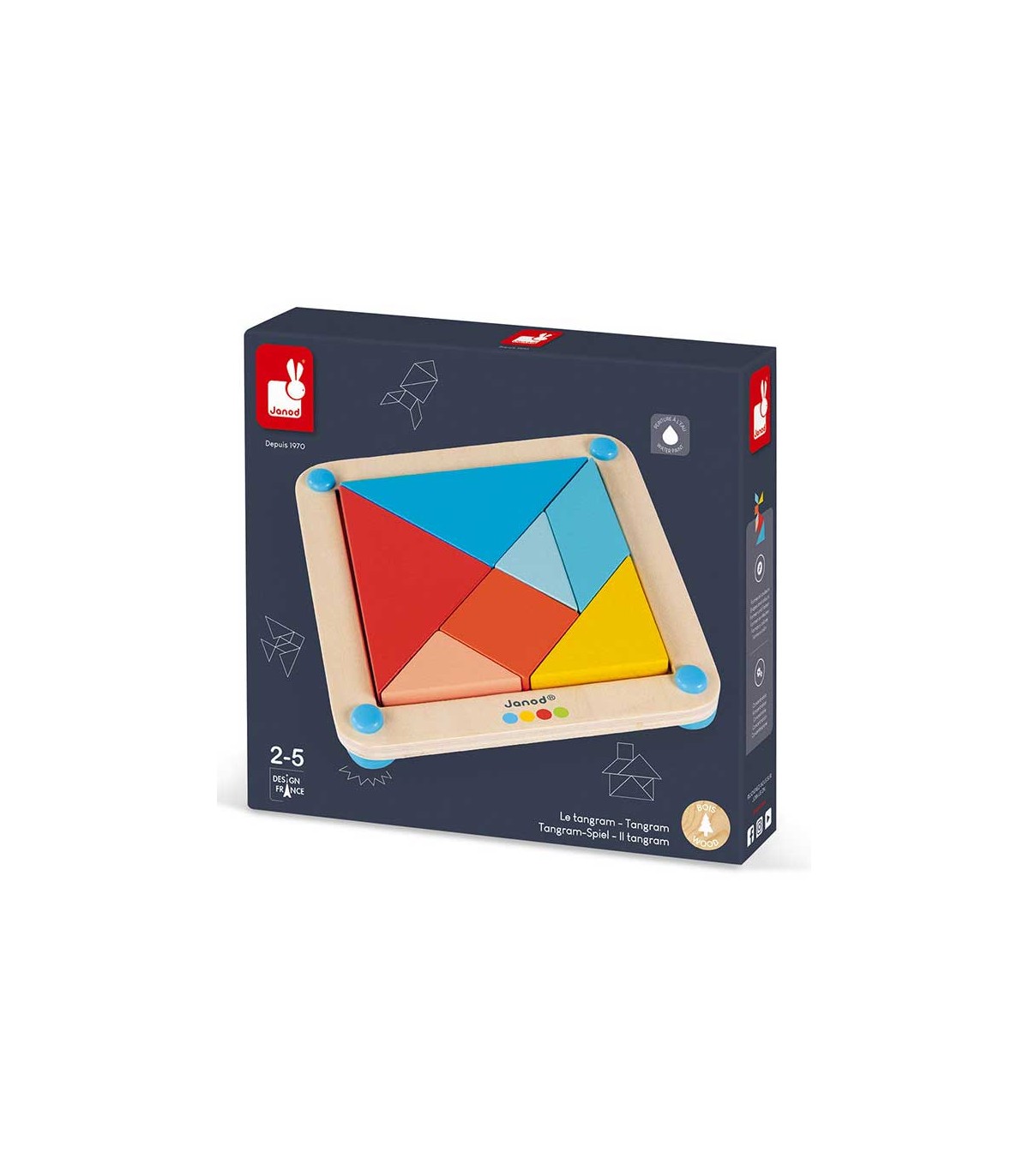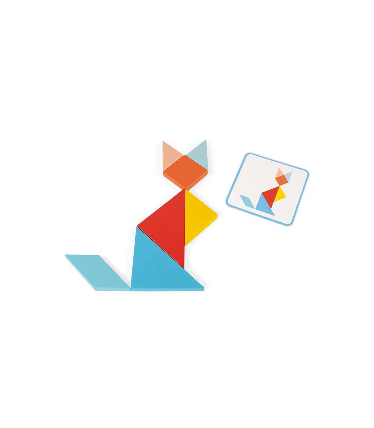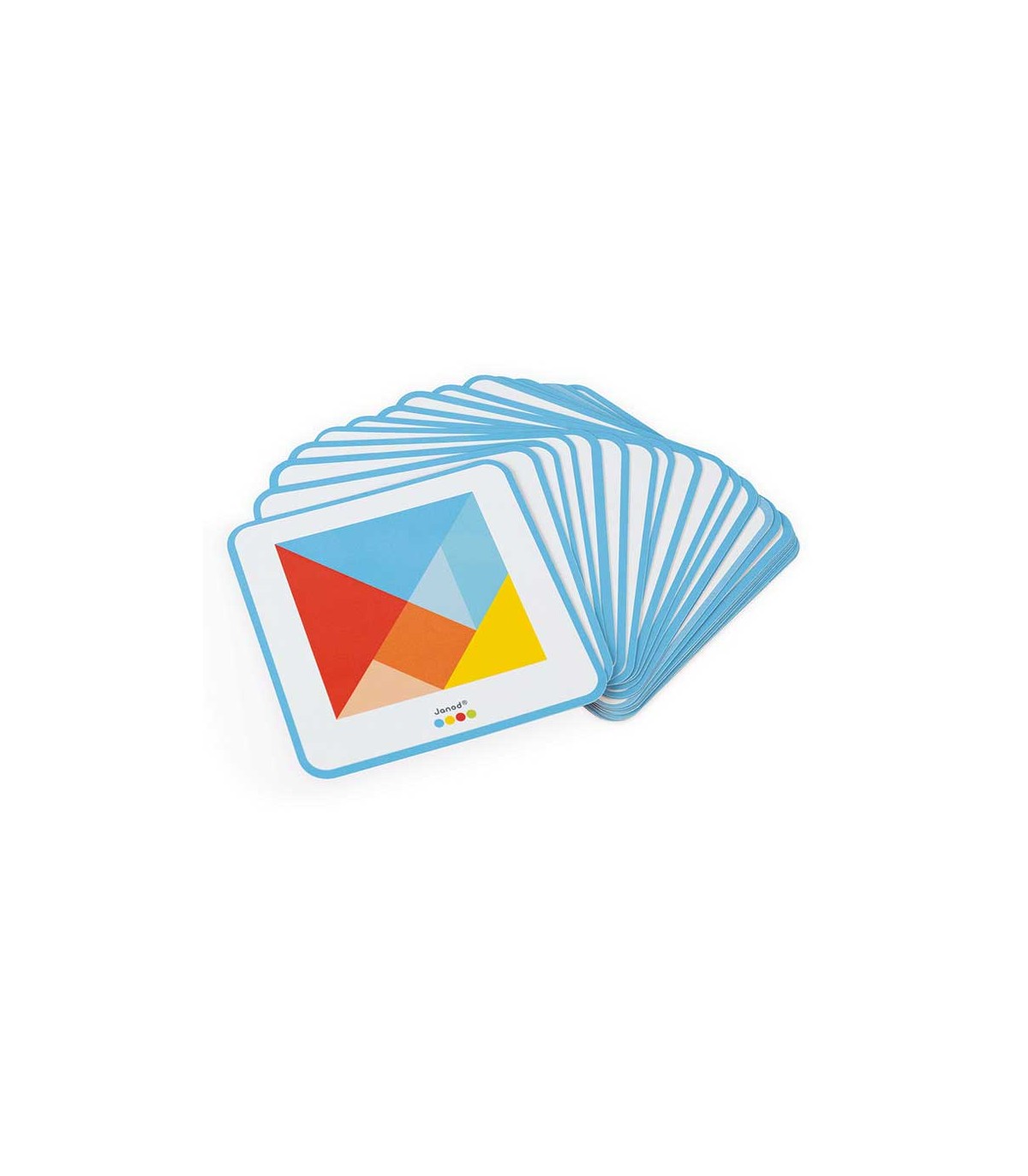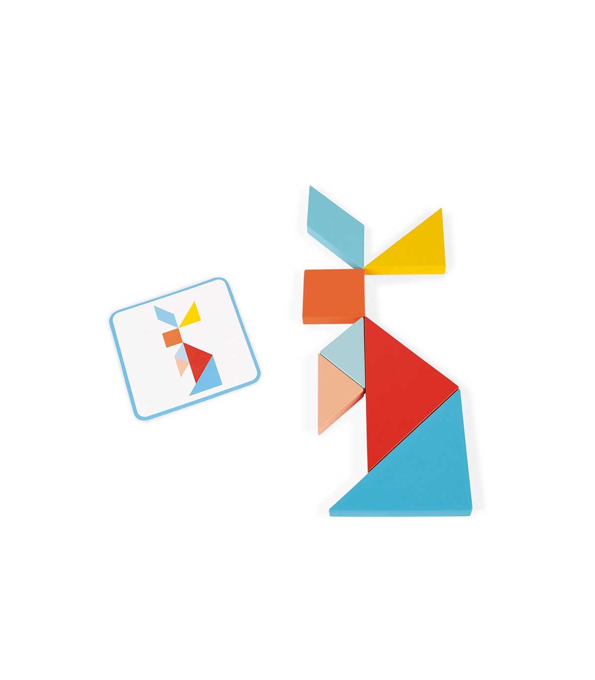 Tangram Janod Essentiel, forma las formas de las tarjetas con las 7 piezas de madera de diferentes tamaños, formas y colores.