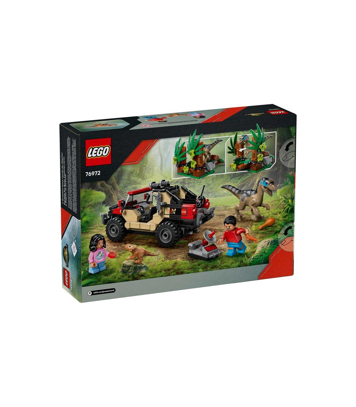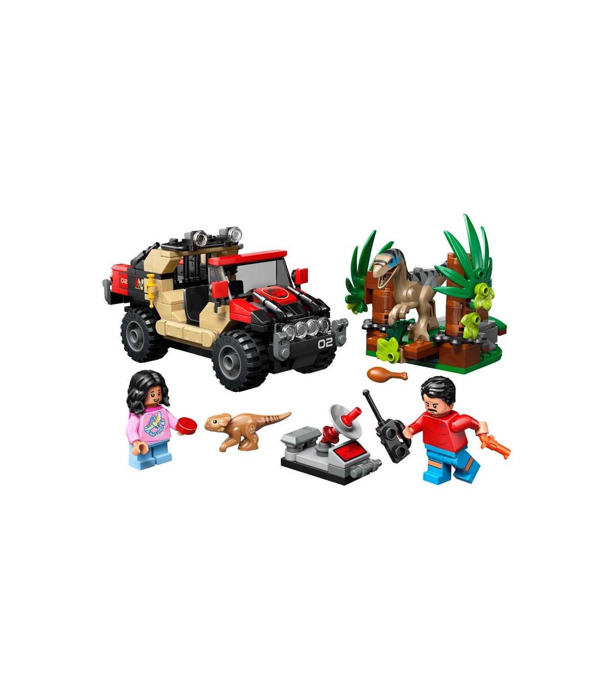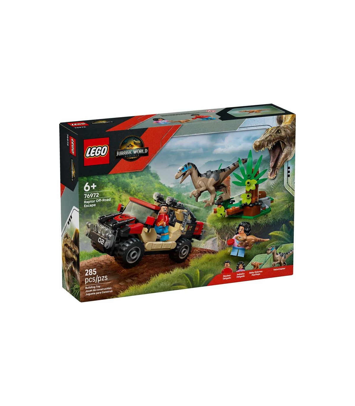 Set de construcción Lego Jurassic World, huida en todoterreno y raptor al acecho. Contiene 285 piezas, incluye 2 Minifiguras exclusivas.