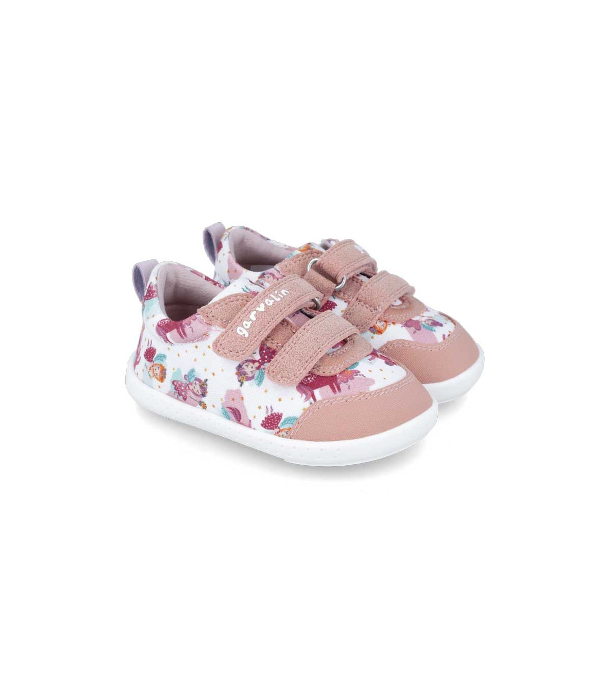 Zapatillas de lona blanditas Garvalín blancas con estampado en rosa, con velcro. Calzado infantil respetuoso con el crecimiento natural del pie.