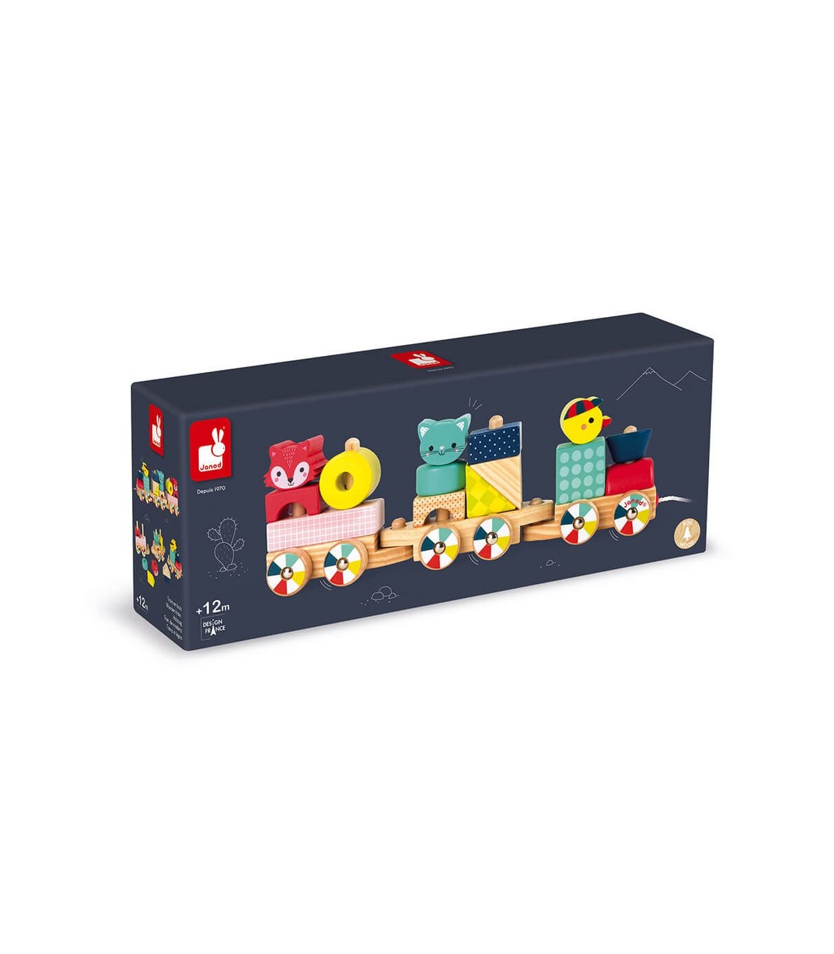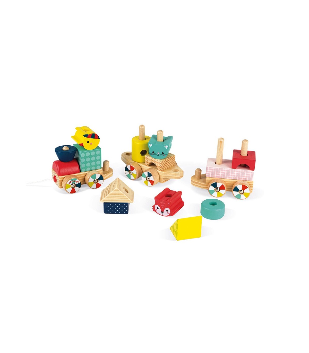 Tren de juguete de madera 2 en 1, esta compuesto de tres vagones de madera y bloques de diferentes colores y tamaños que encajan en los vagones de diferentes maneras. El niño puede jugar con los bloques realizando divertidas construcciones y también puede arrastrarlo tirando del cordel. Incluye 14 bloques de diferentes colores y estampados. Esta fabricado en madera.
