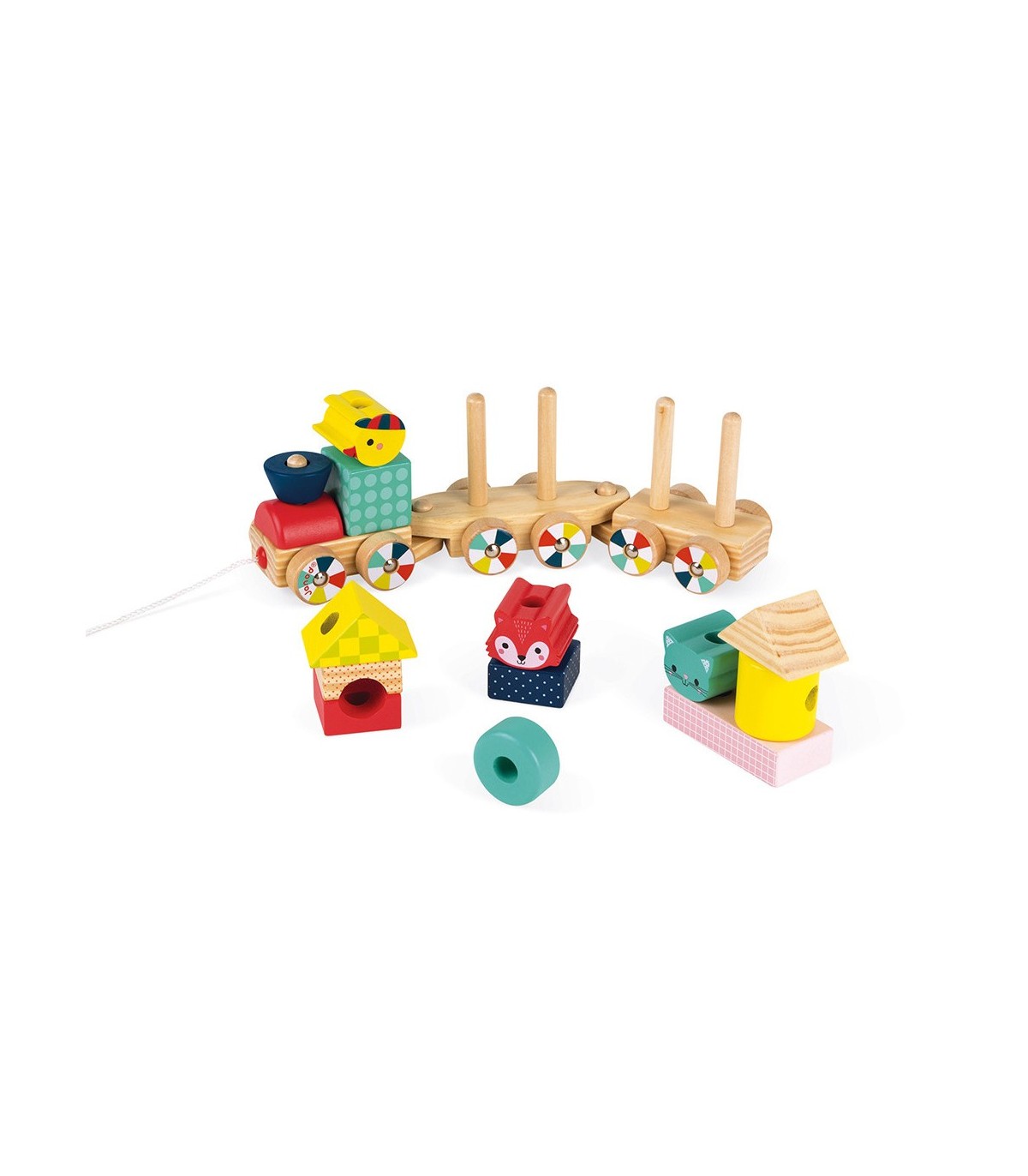 Tren de juguete de madera para arrastrar y realizar construcciones.