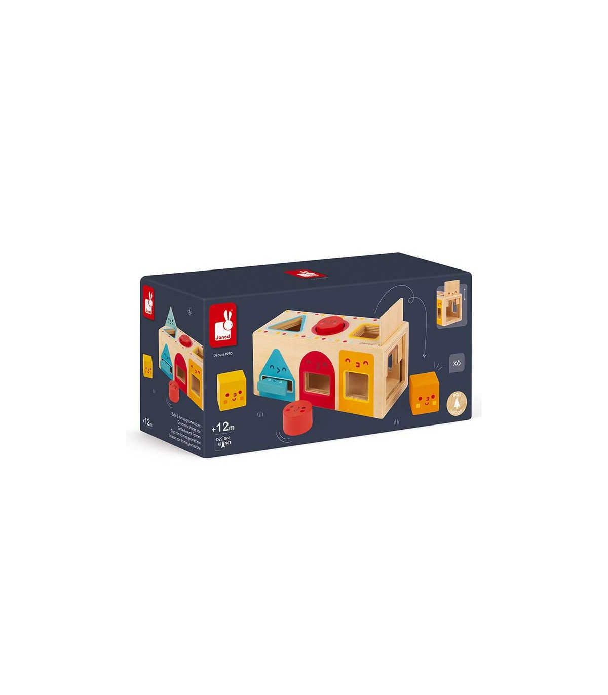 Bonita caja para que los más pequeños aprendan a diferenciar colores y formas geométricas. Contiene 6 piezas distintas que se pueden guardar en la caja que se abre fácilmente. Fabricada en madera de haya y contrachapado.