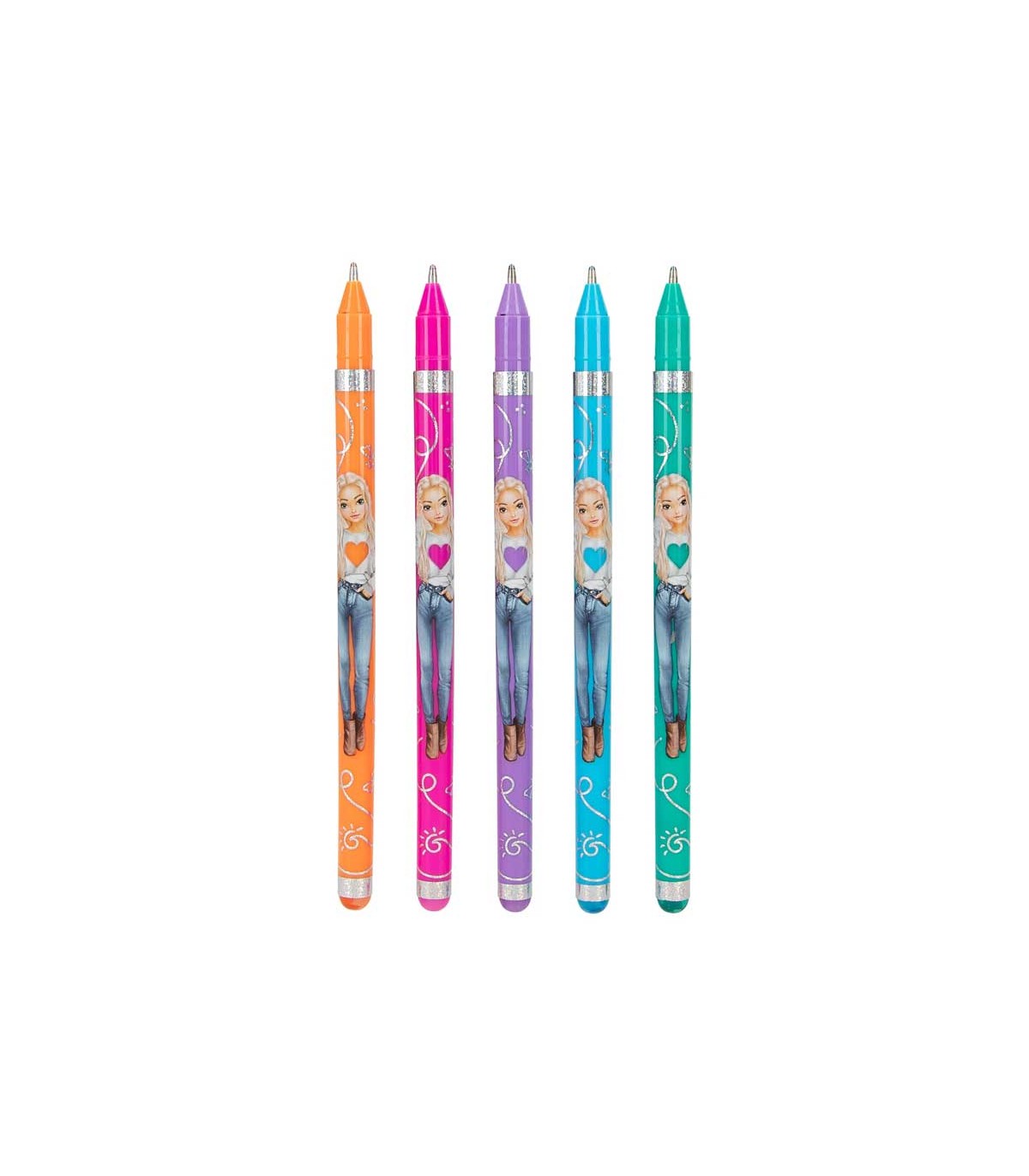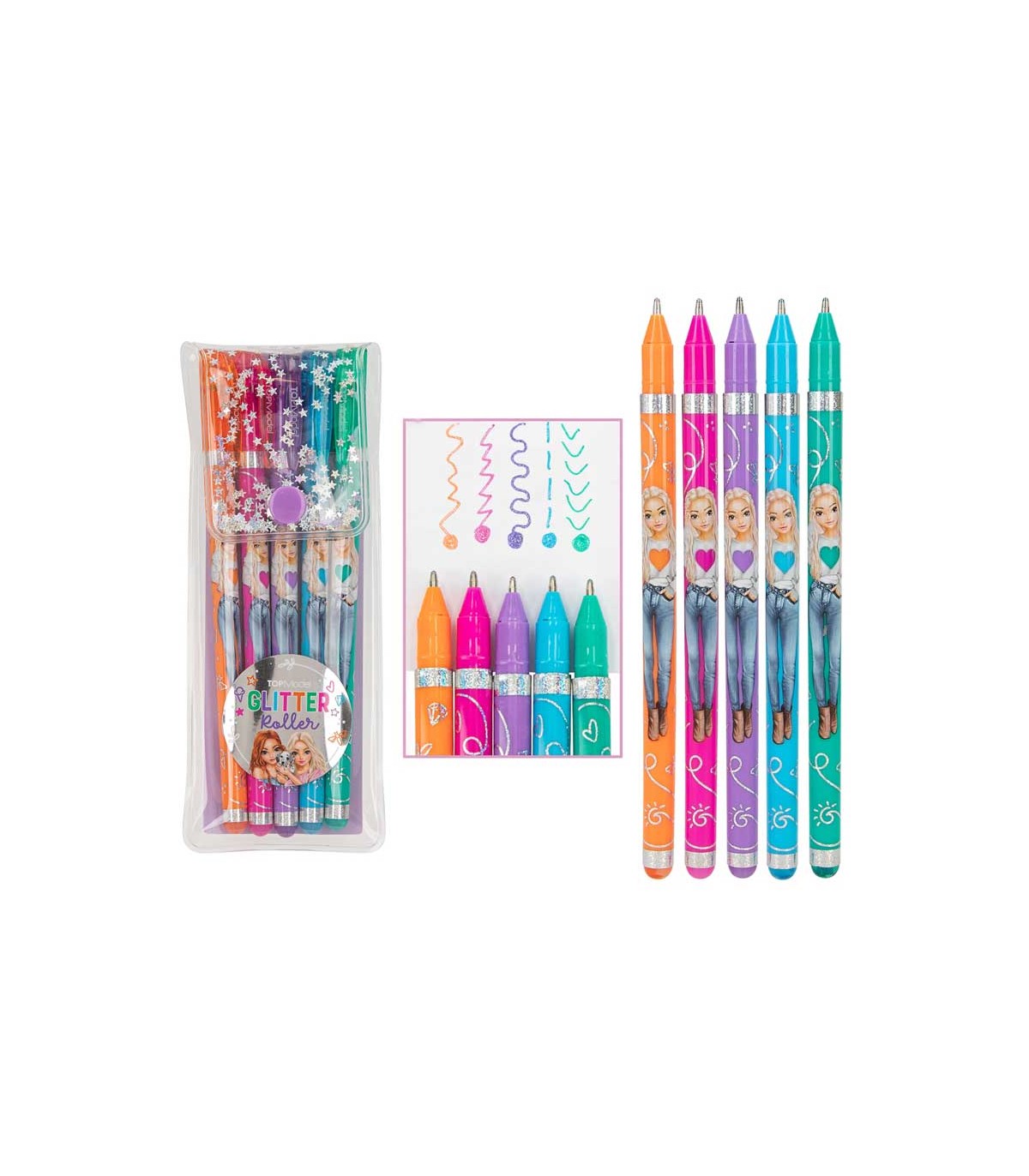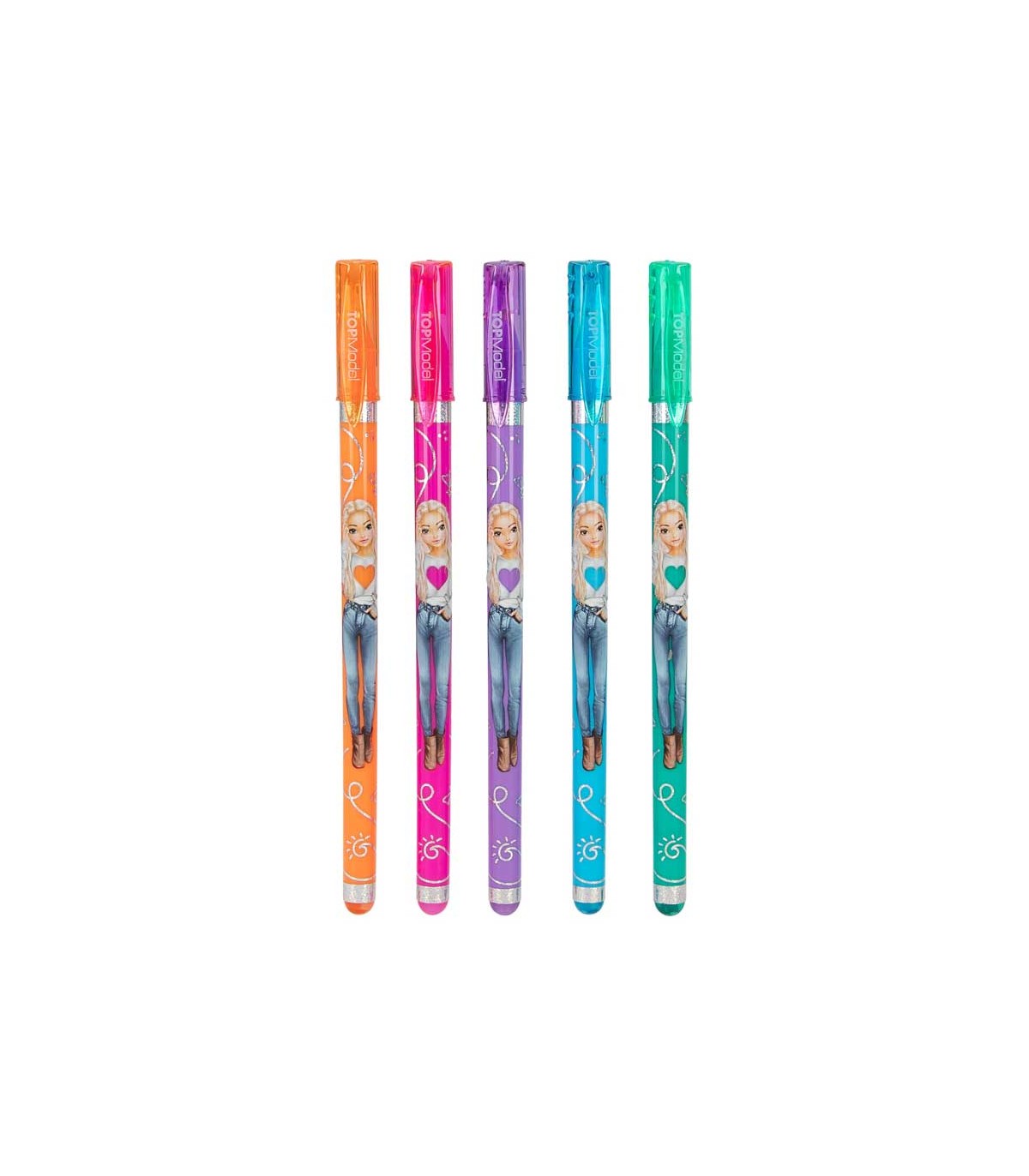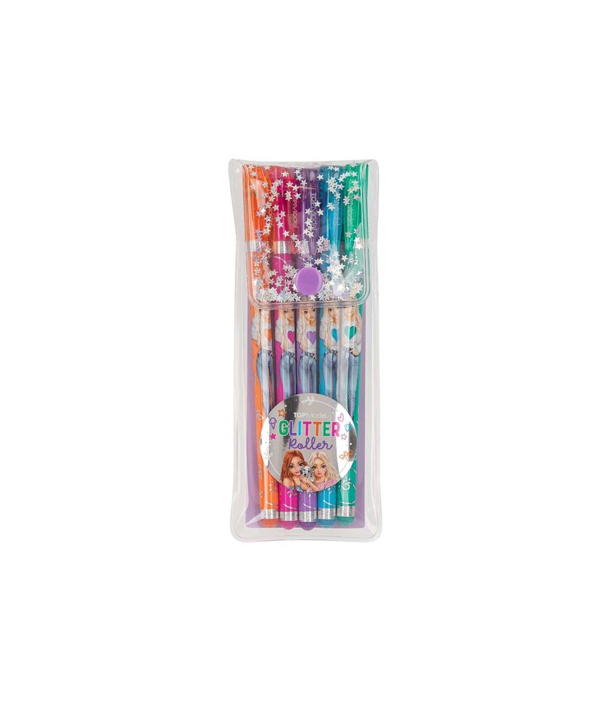 Set de 5 rotuladores de gel con purpurina TopModel de diferentes colores en estuche transparente con la solapa decorada.