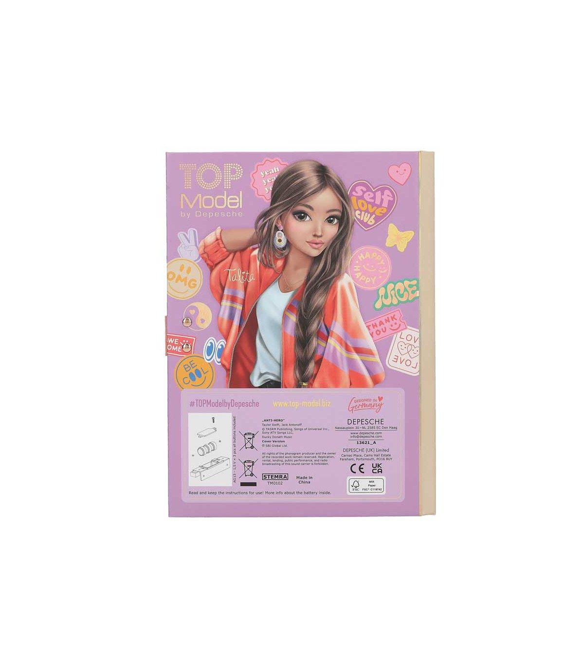 Diario con código secreto para anotar tus pensamientos y secretos. El candado solo se puede desbloquear introduciendo el código de 4 cifras que puedes personalizar y modificar cuando quieras. Cuando se abre suena la canción Anti-Hero de Taylor Swift durante 20 segundos aprox. En el interior cuenta con 80 páginas con pauta de line fina y ilustraciones en color.