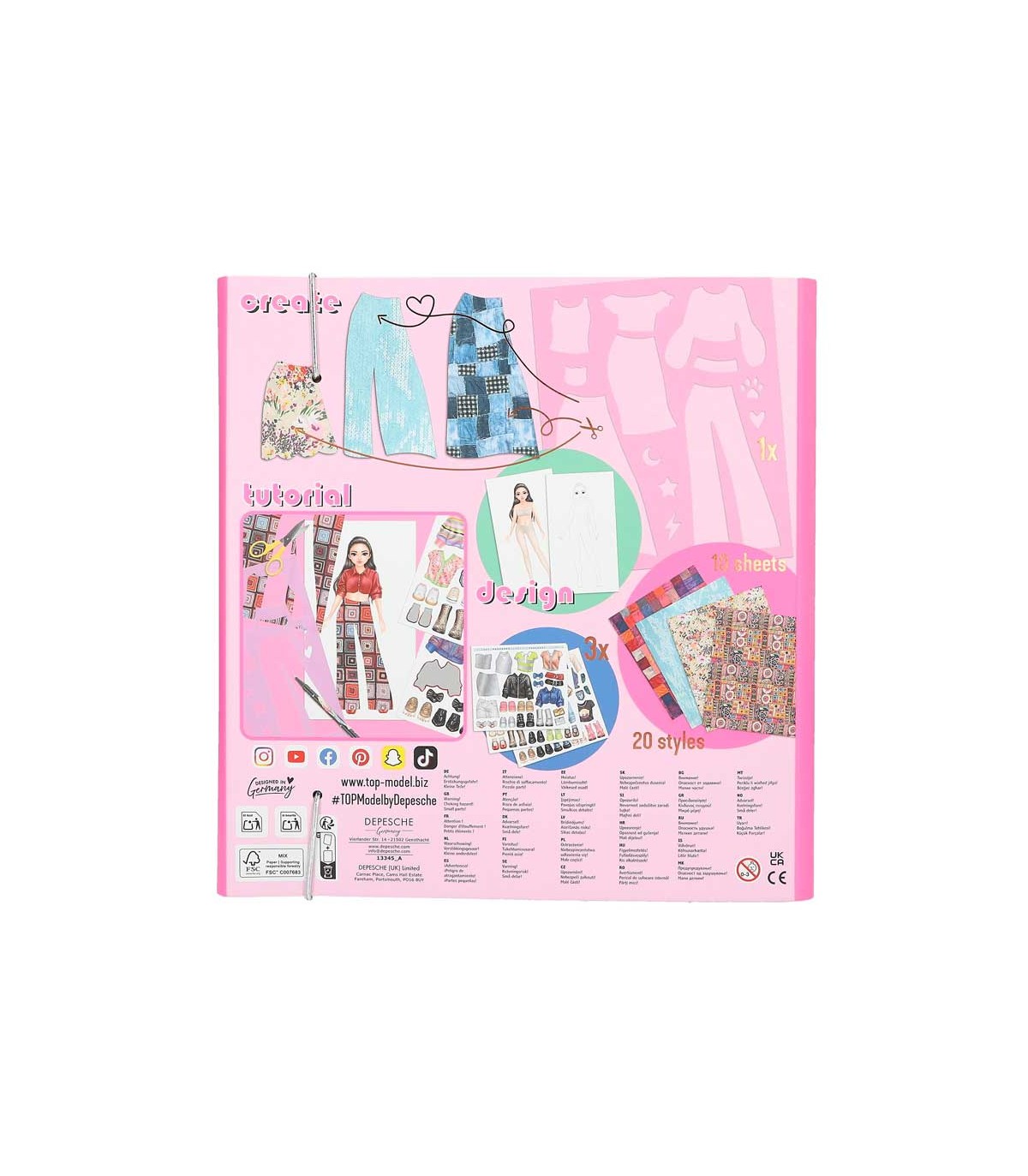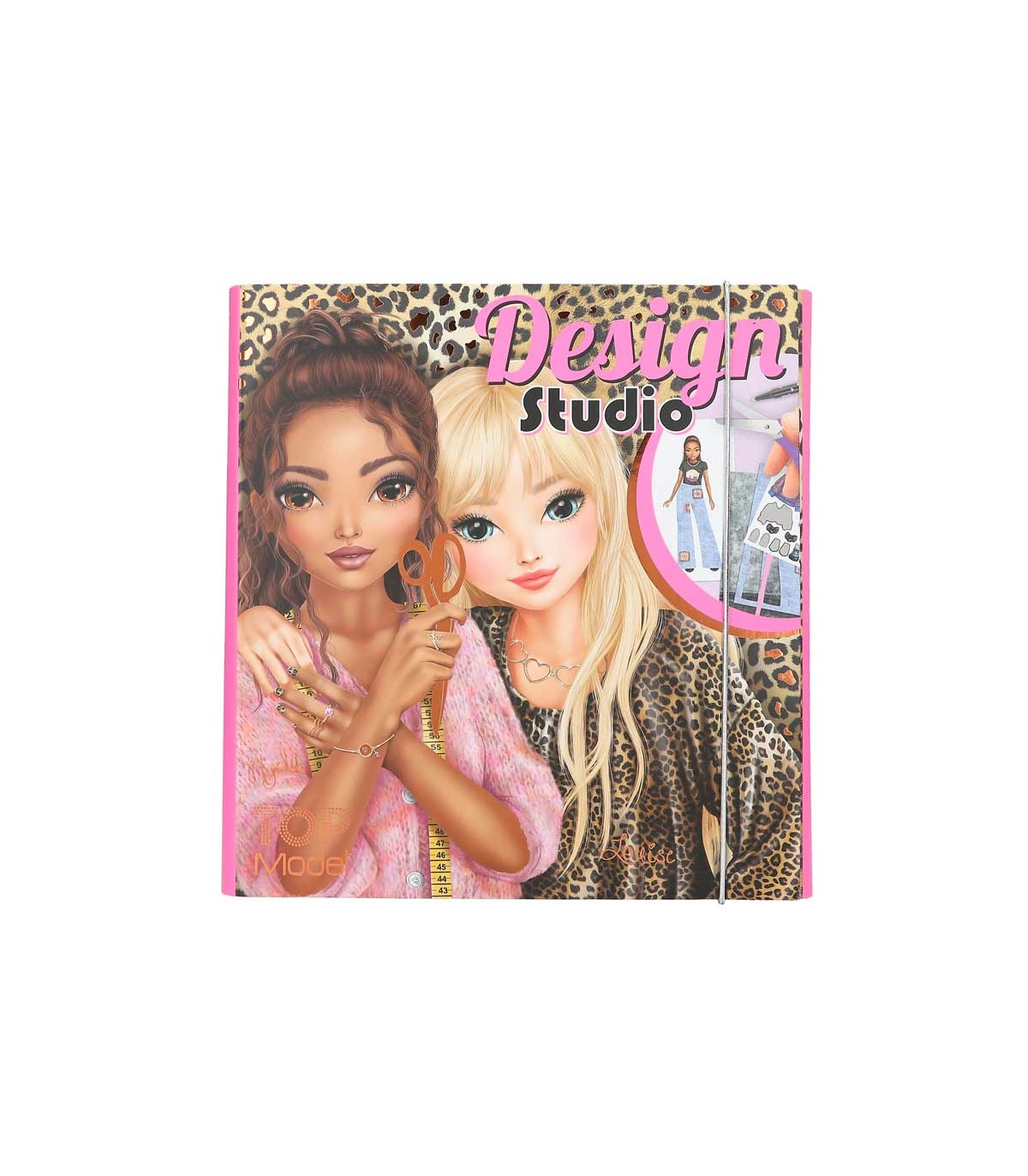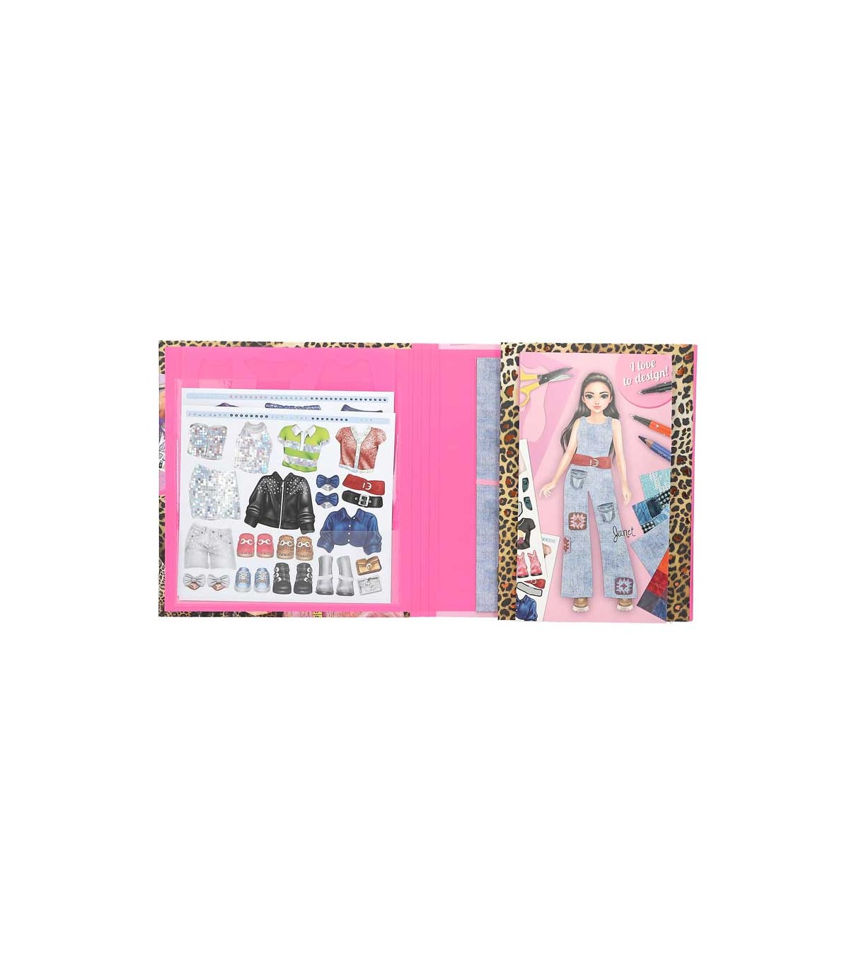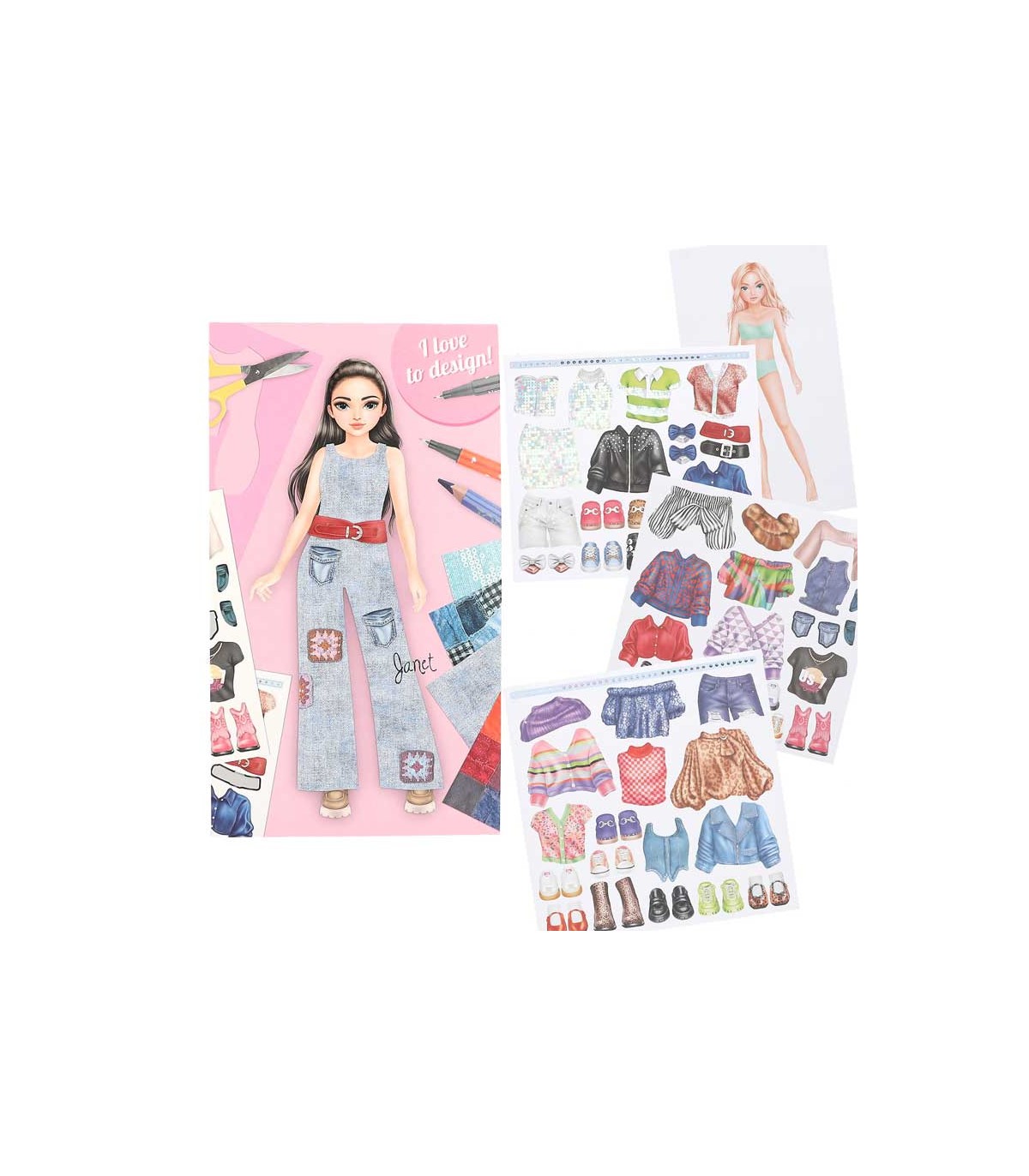 Set de diseño con 30 páginas con figurines de modelos, 1 plantilla, 10 páginas con 20 estampados de estilos diferentes, 2 hojas de pegatinas y muchos ejemplos de diseños para inspirarte.