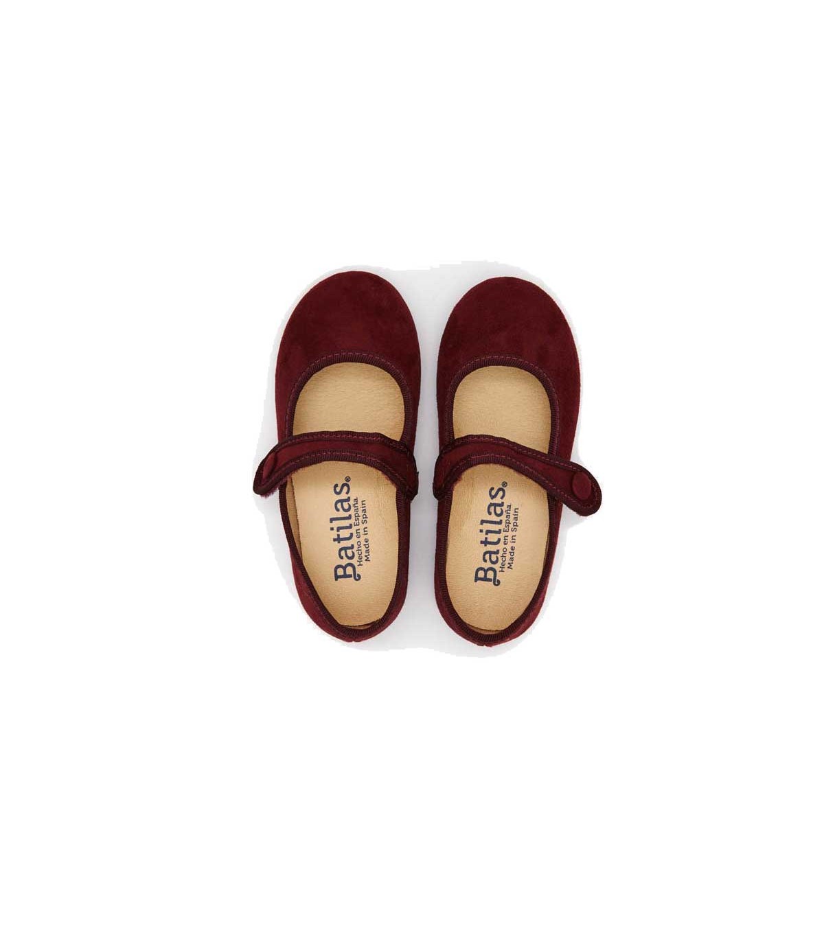 Merceditas Batilas en color burdeos en poliéster con tira adherente y botón de adorno, cómodas y flexibles.