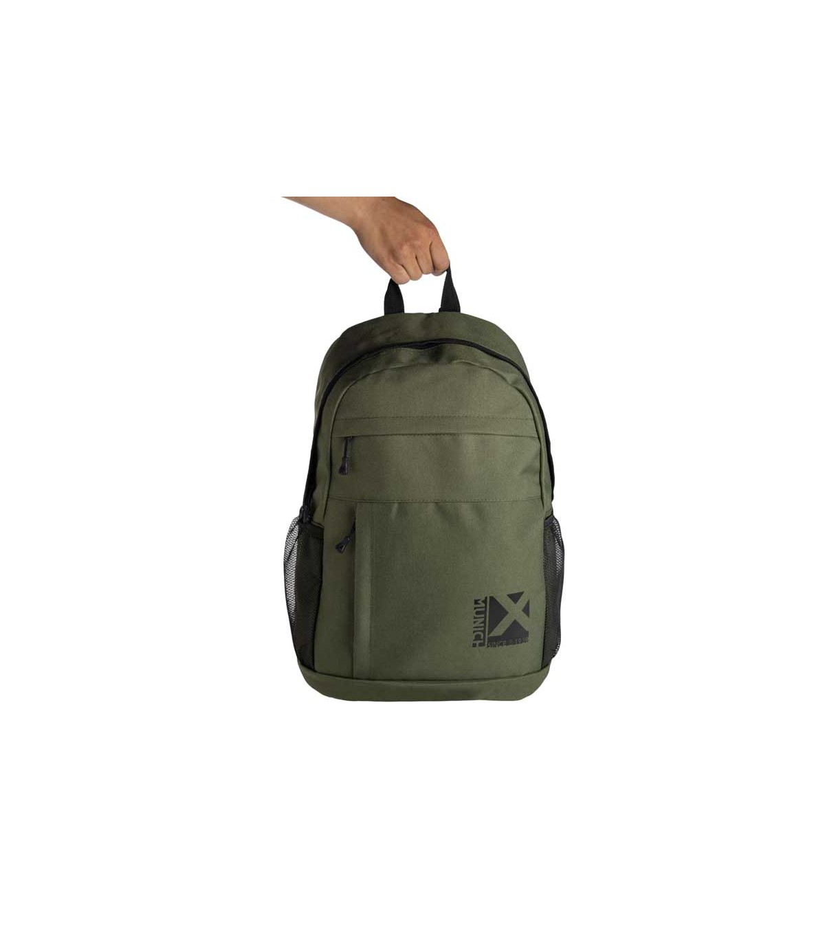 Mochila urbana color kaki, para llevar todo lo necesario para la vuelta al cole. Compartimento general con espacio para un ordenador portátil, estuche y teléfono móvil. Compartimento para objetos pequeños en el frontal con cremallera. Logo Munich en la parte frontal. Dimensiones 42x30x18 cm.