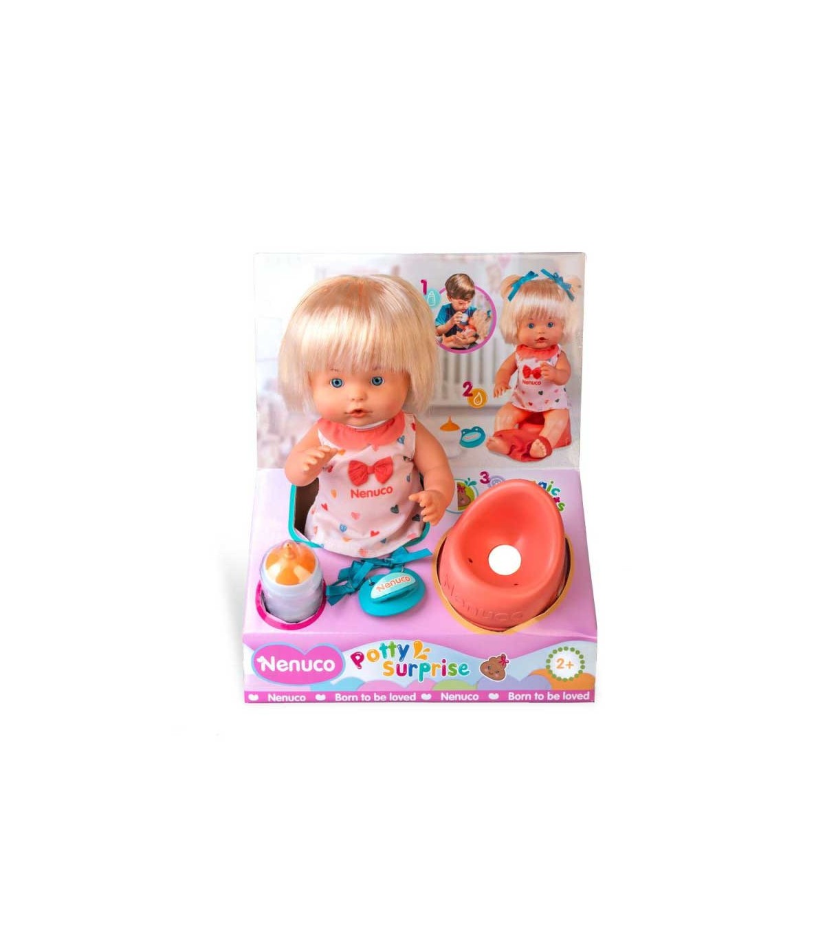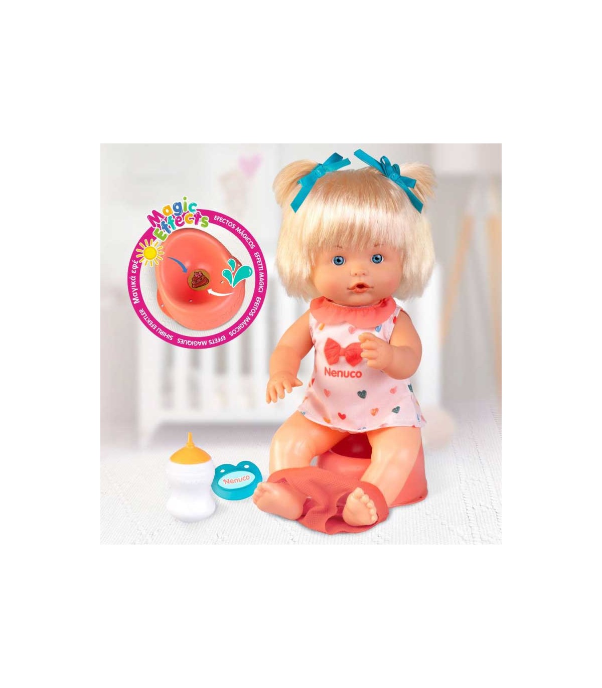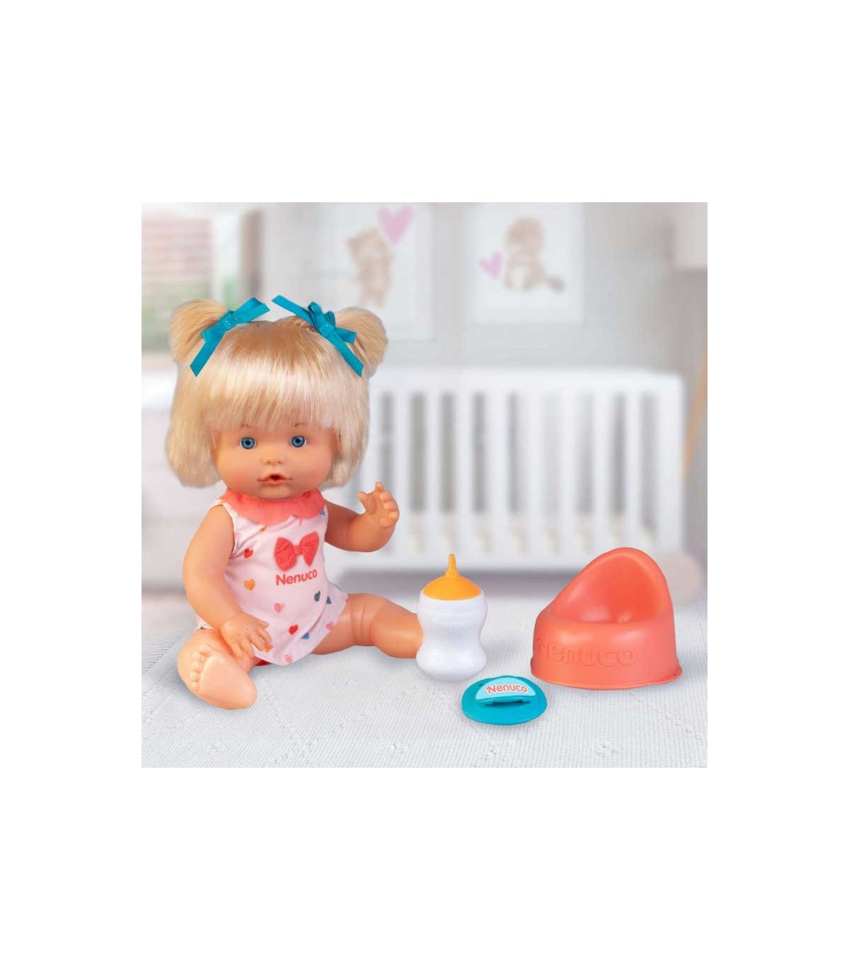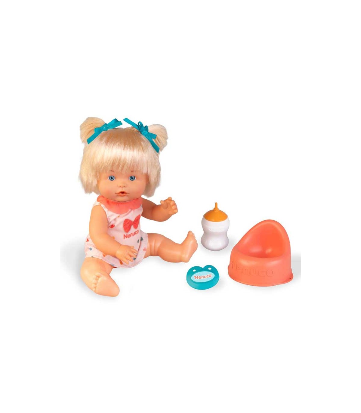 Muñeca Nenuco de 30 cm. con cuerpo duro y pelo rubio. Si le das el biberón con agua hace pipí en el orinal, y una sorpresa¡¡. Incluye chupete y 2 lacitos para hacerle coletas.
