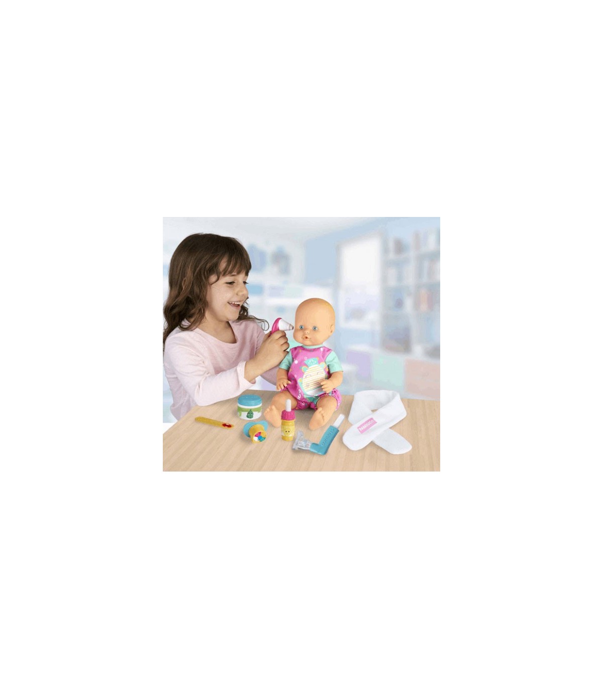 ¿Estará enfermo tu Nenuco? Comprueba si tiene fiebre con el chupete termómetro. Revisa la garganta con la linterna con luz de verdad y colócale la bufanda para que no tenga frío.
