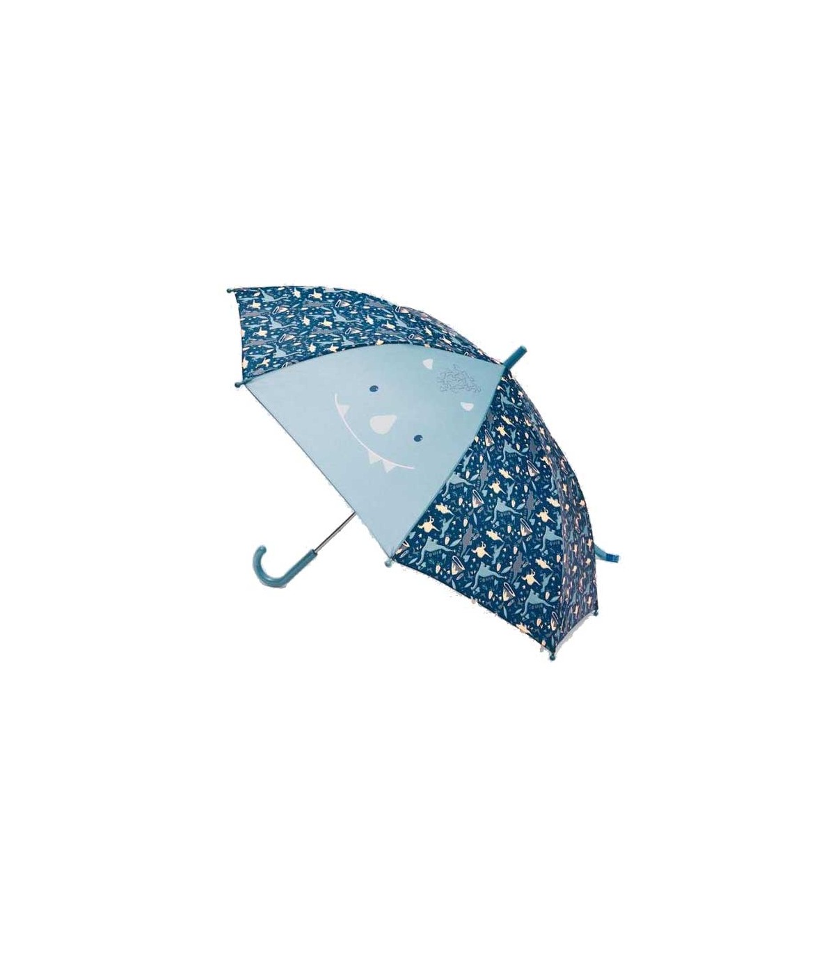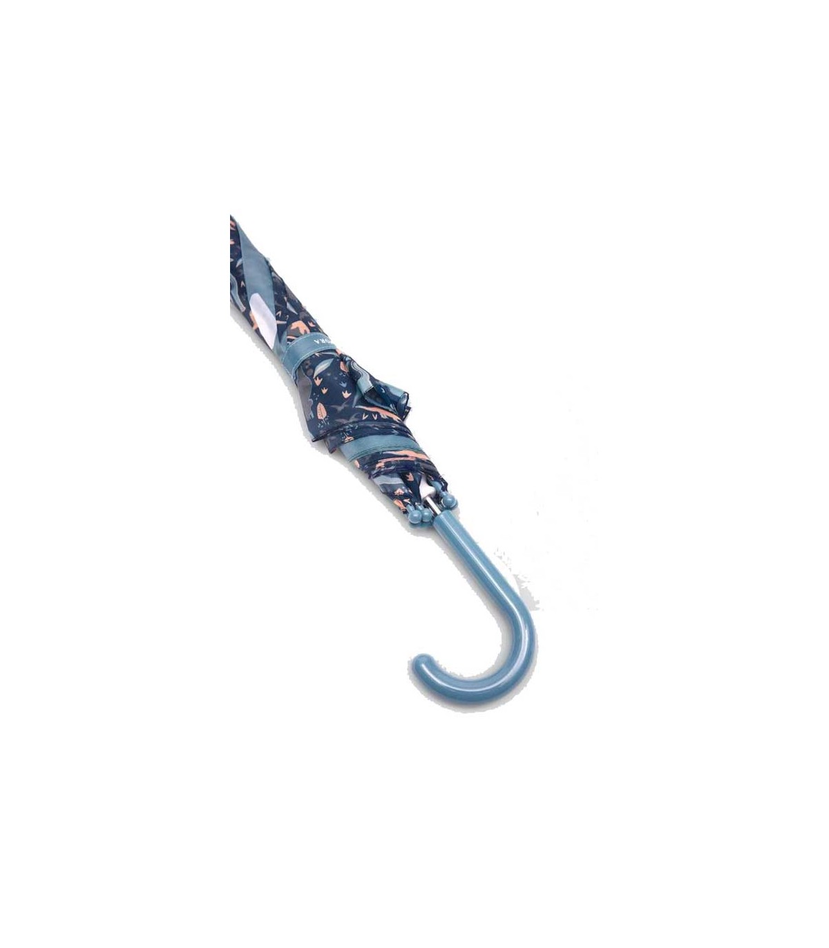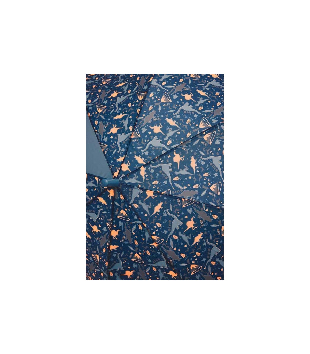 Paraguas infantil azul con decoración de dinosaurios, 54 cm. de diámetro. Varillas de fibra de vidrio par mejor resistencia al viento.