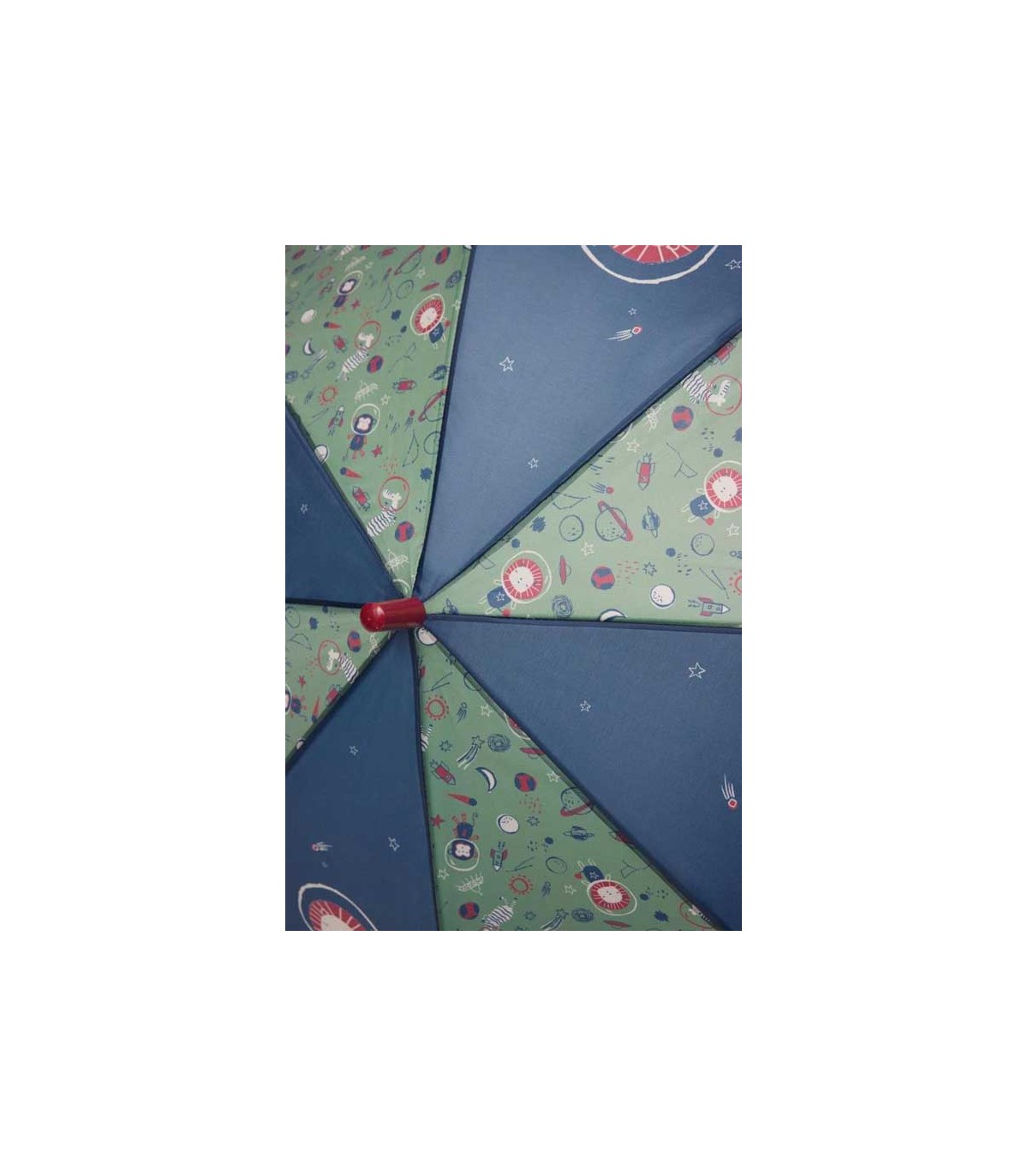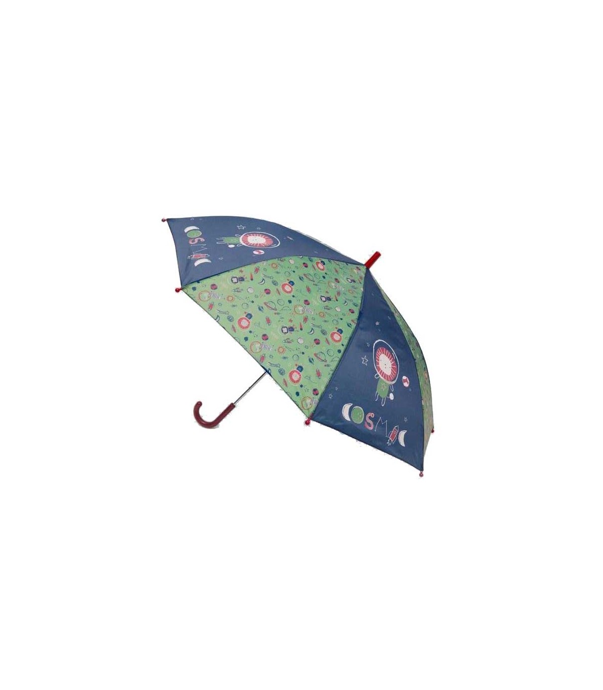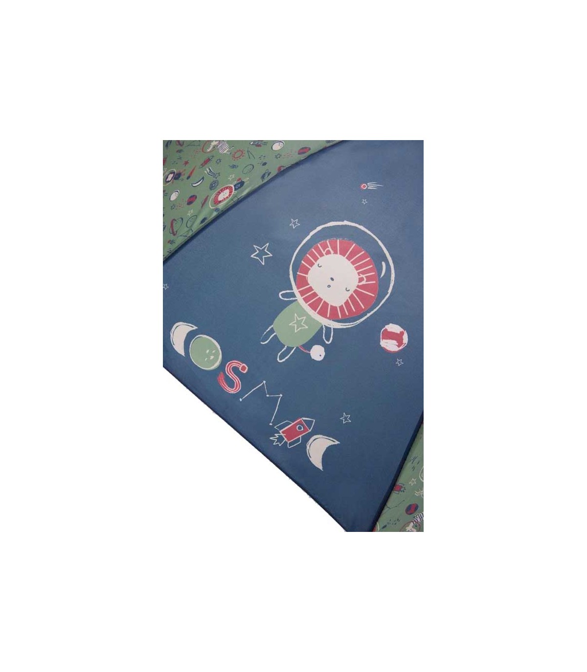 Paraguas infantil verde y azul con decoración del cosmos, 54 cm. de diámetro. Varillas de fibra de vidrio par mejor resistencia al viento.