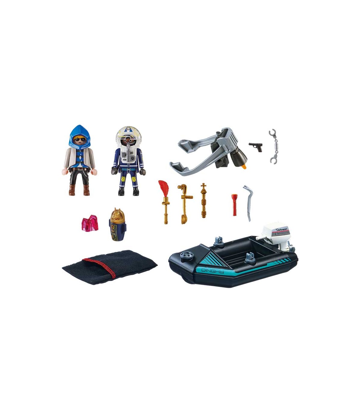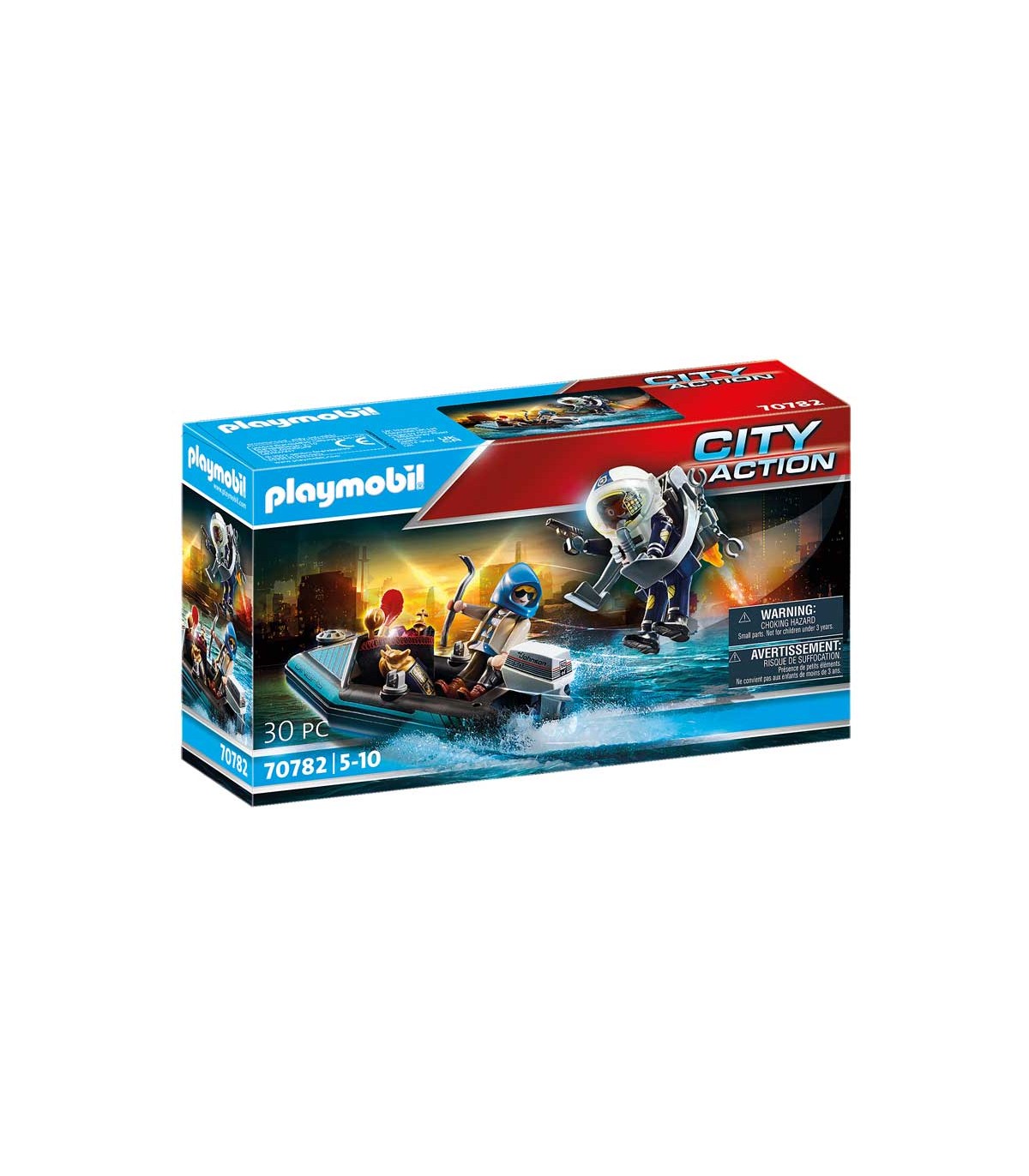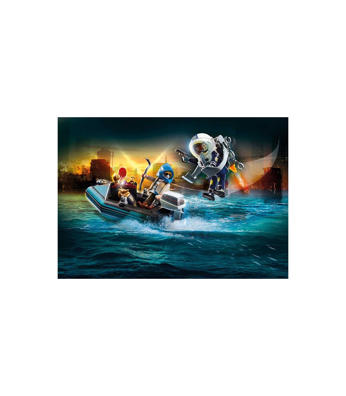 Policía con mochila propulsora persiguiendo al delincuente en lancha. Contiene 30 piezas, lancha con delincuente, policía con mochila propulsora y accesorios varios.