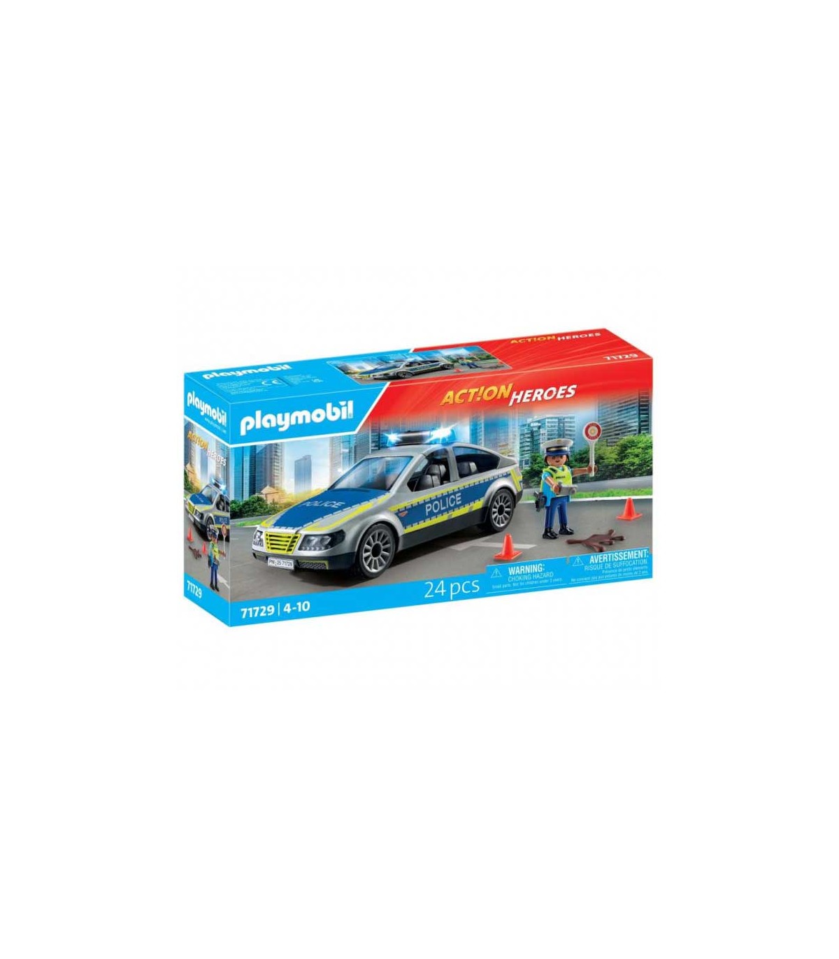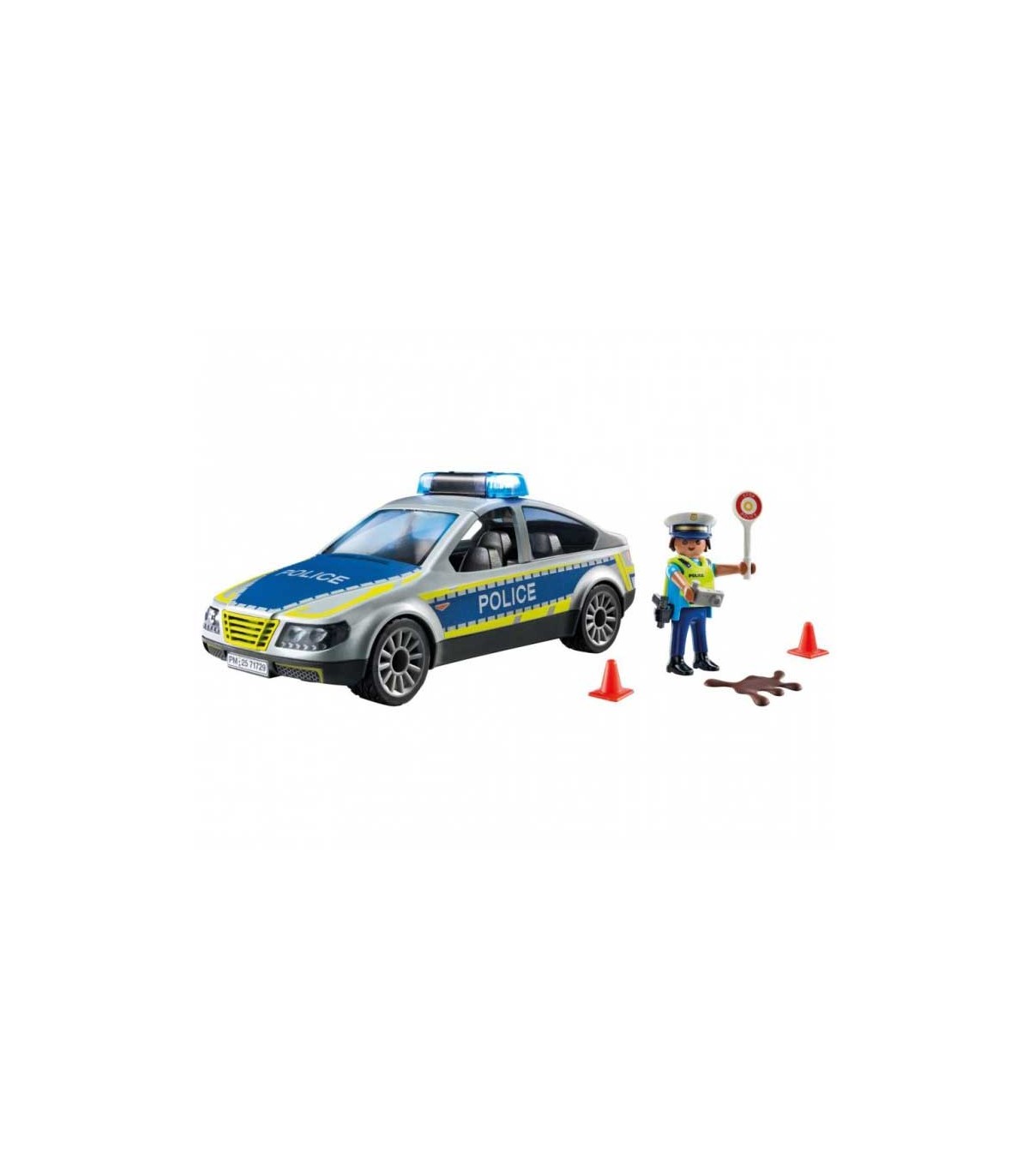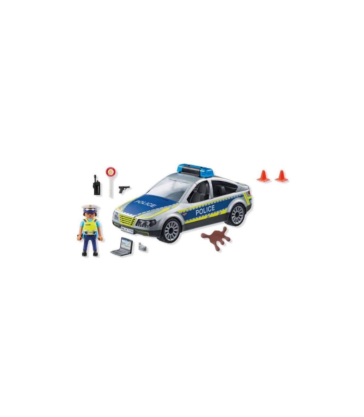 Coche patrulla de policía con luces y módulo de sonido. Incluye un policía y varios accesorios.
