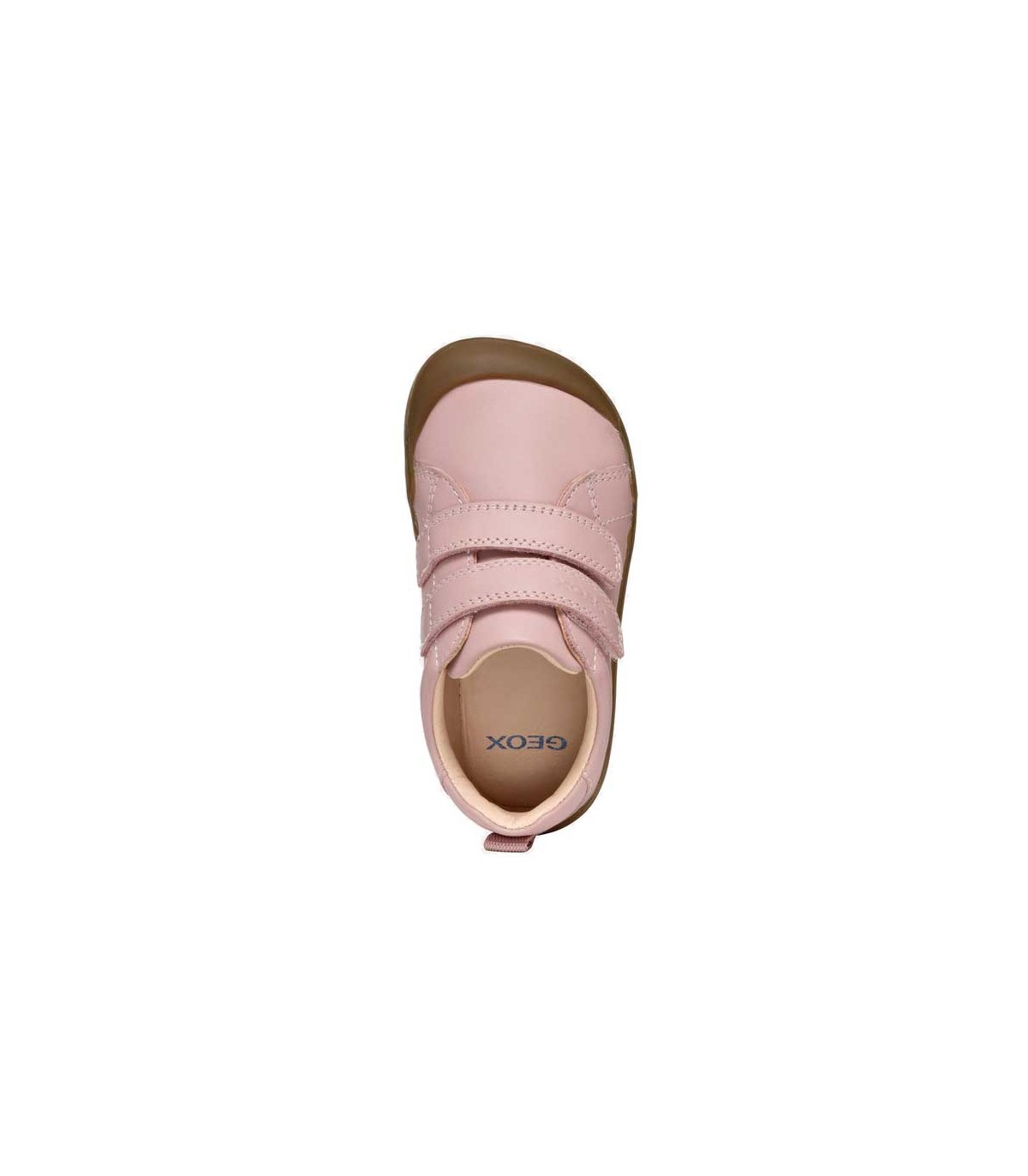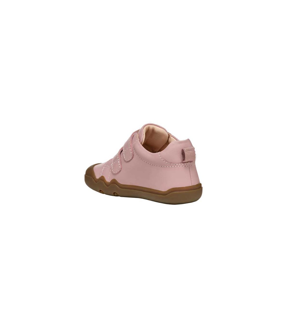 Zapato deportivo Geox en piel rosa. Sistema Steppieup avalado por la Asociación Italiana de Podólogos, que da la sensación de andar descalzo con un calzado ligero, flexible y fácil de calzar. Puntera ancha de goma, cierre con dos velcros.