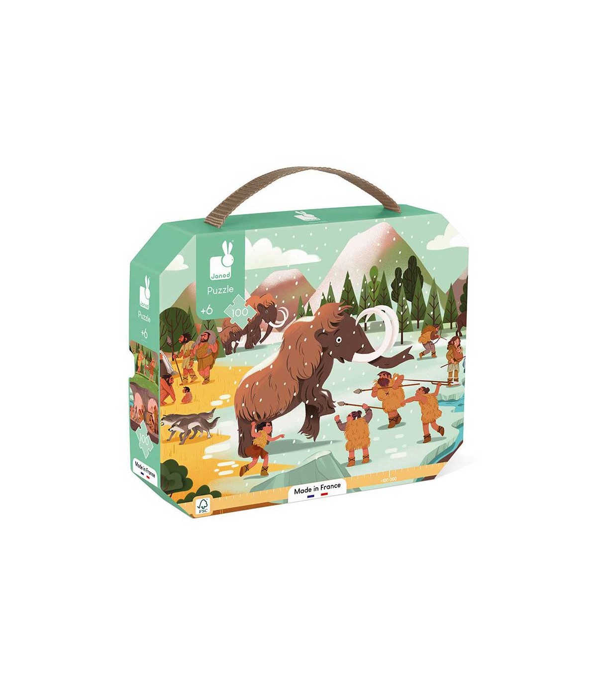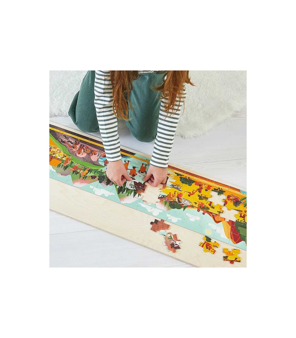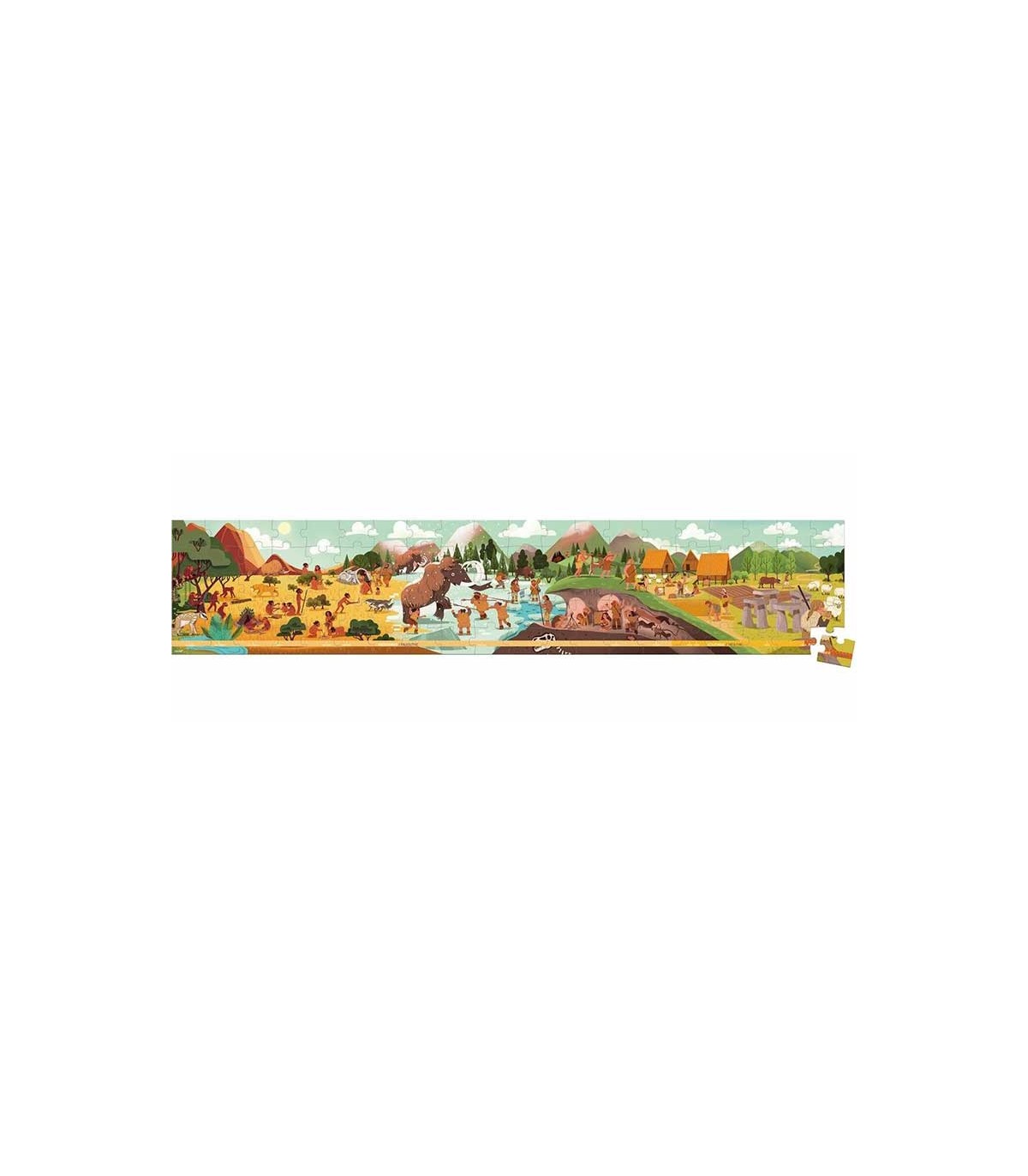 Puzle con ilustraciones de la prehistoria de 100 piezas en formato panorámico, en maletín de cartón con asa de tela. Una vez montado mide: 100x20x0,2 cm.