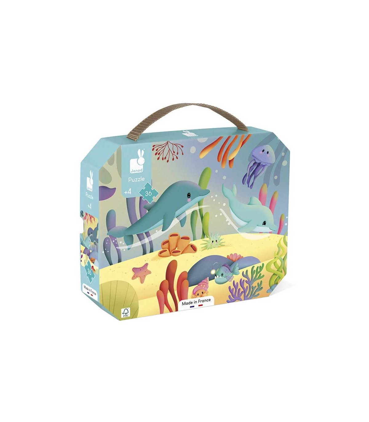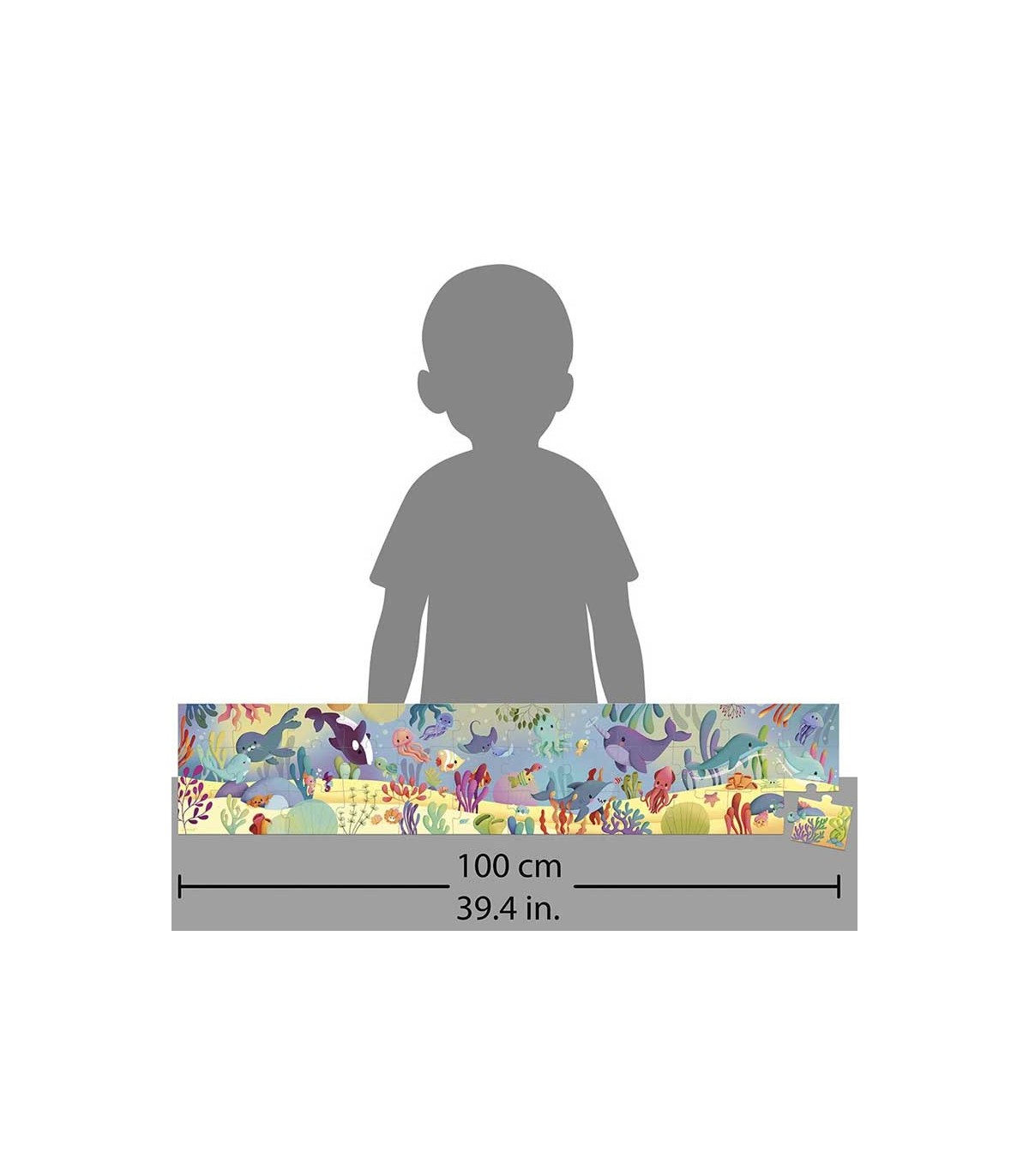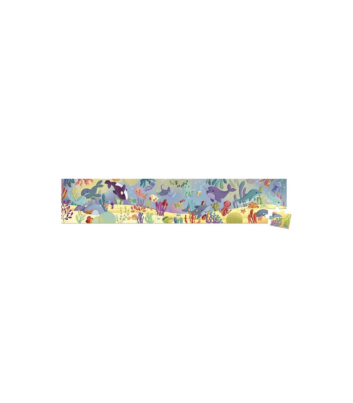 Puzle con ilustraciones divertidas de animales marinos de 36 piezas, en formato panorámico, presentado en caja de cartón duro con asa de tela. Una vez montado mide 100x20x0,2 cm.