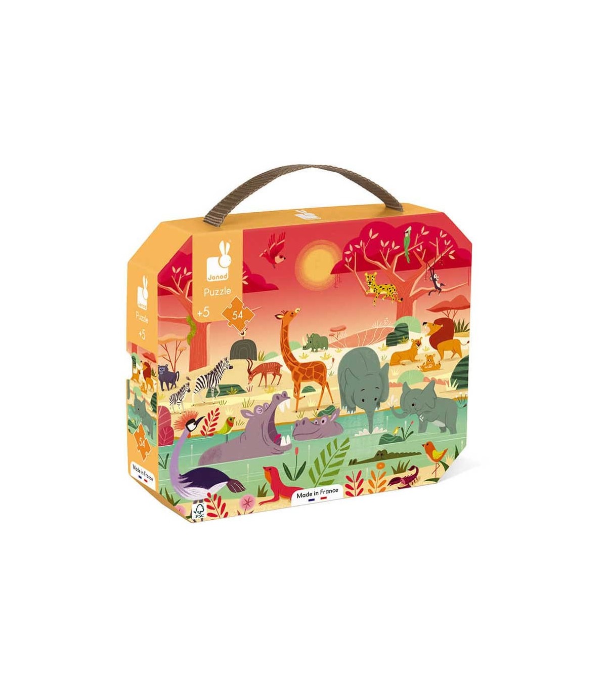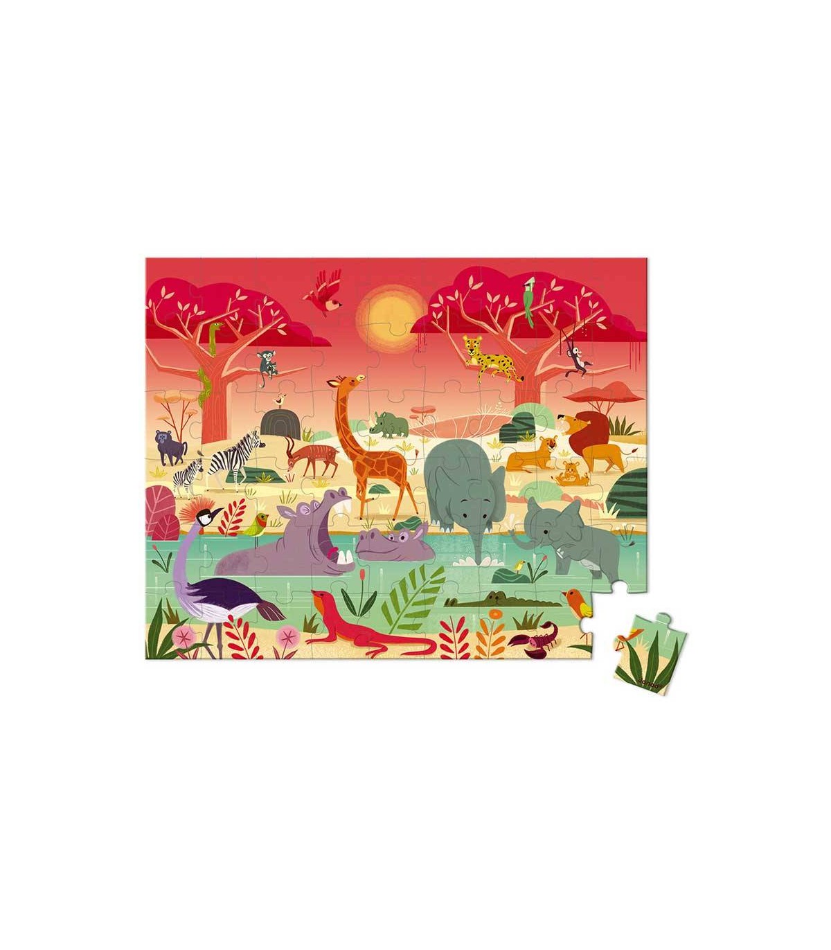 Puzzle la reserva de animales de 54 piezas en cartón con bonitas ilustraciones de animales de la selva. Viene presentado en una bonita caja de cartón duro con asa de tela ideal para regalo.