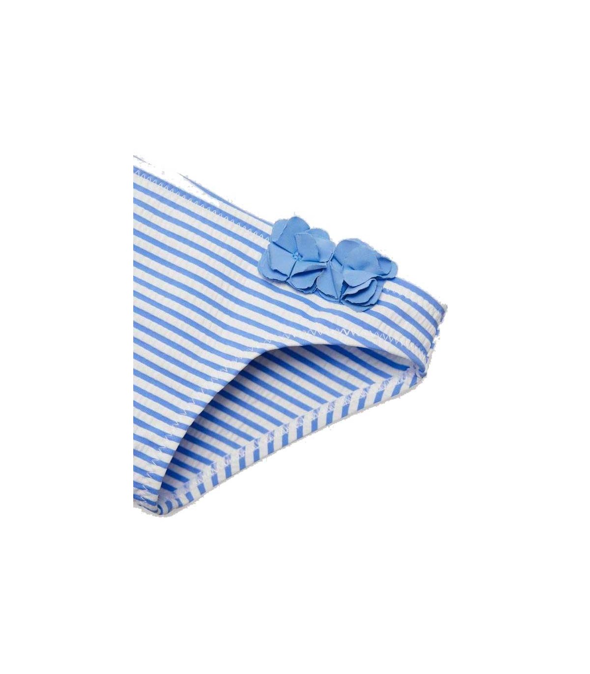 Culetín para bebé con rayas azules, tela con textura y flor en el costado. Perfecto para la playa o la piscina.