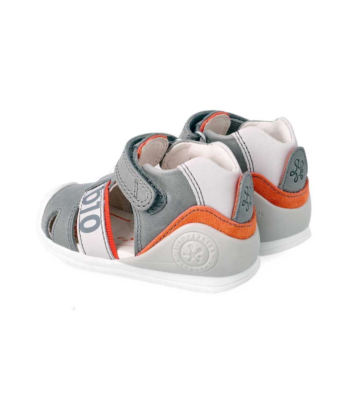 Sandalia Biomecanics para niño en piel de color gris y naranja.