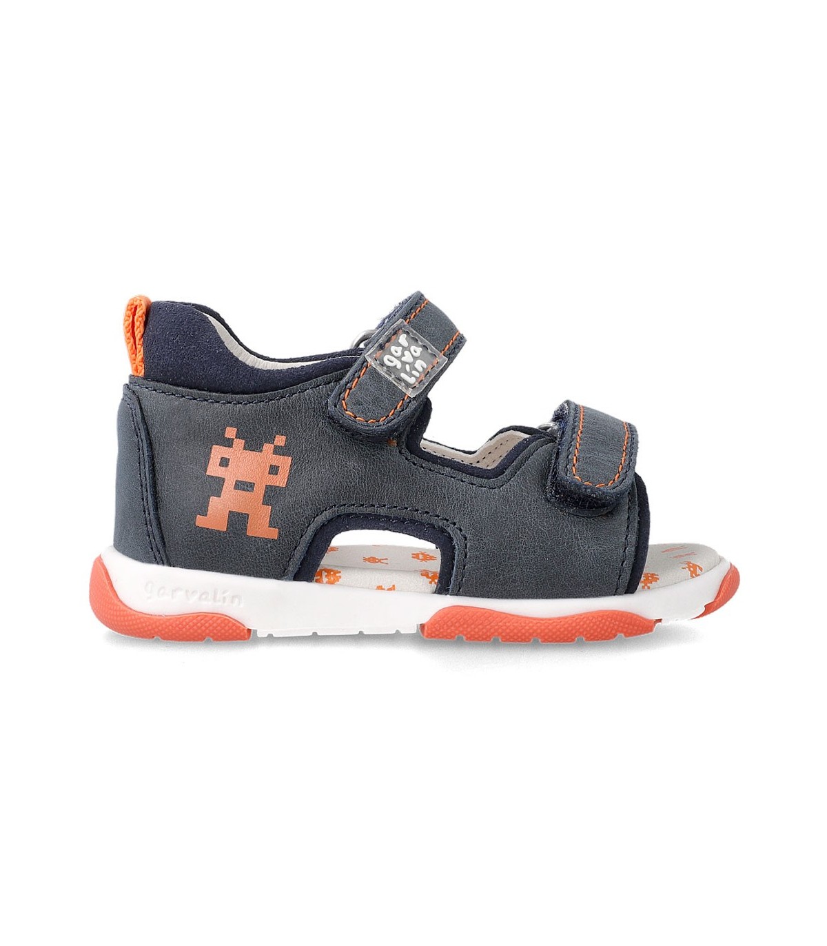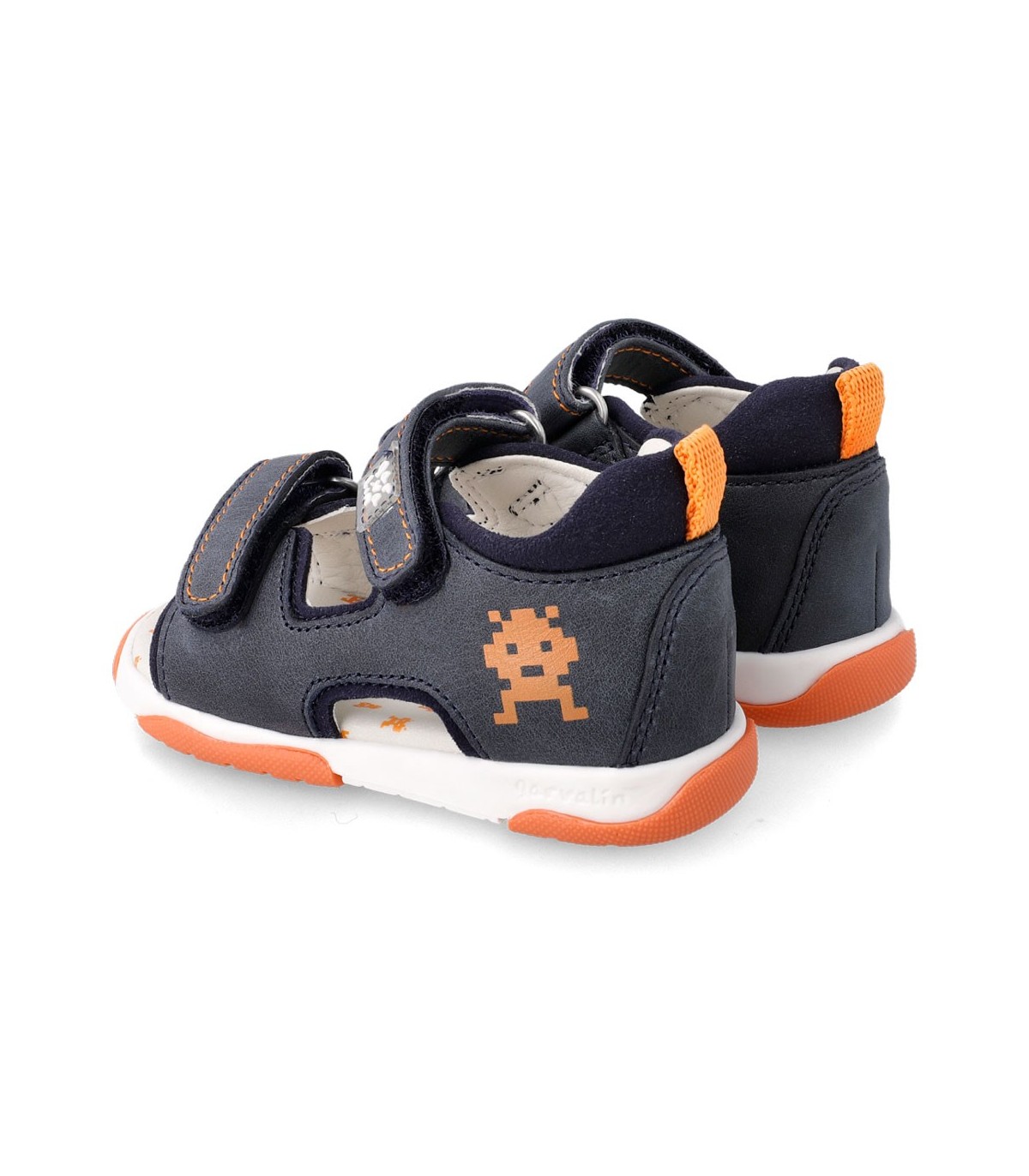 Sandalia para niño en piel color azul marino con pespuntes contrastados en naranja. Cierre con dos velcros para mayor ajuste, estampación en el talón de marcianito de videojuegos retro color naranja. Plantilla anatómica en color blanco estampaciones naranja. Suela de goma en blanco y naranja. Talón cerrado y reforzado en piel.