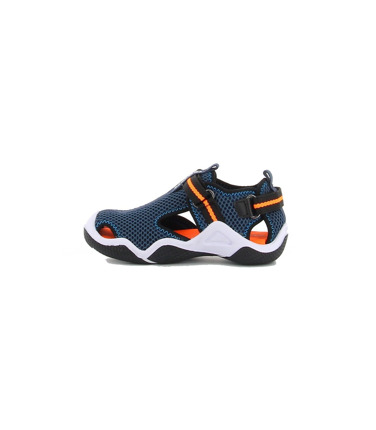 Sandalia deportiva de niño para actividades al aire libre, se pueden mojar. Parte superior de malla textil elástica que se ajusta al pie y cierre con dos velcros, uno en el empeine y otro en la parte trasera. Parte interior y suela textil suave con plantilla transpirable. Suela de goma.