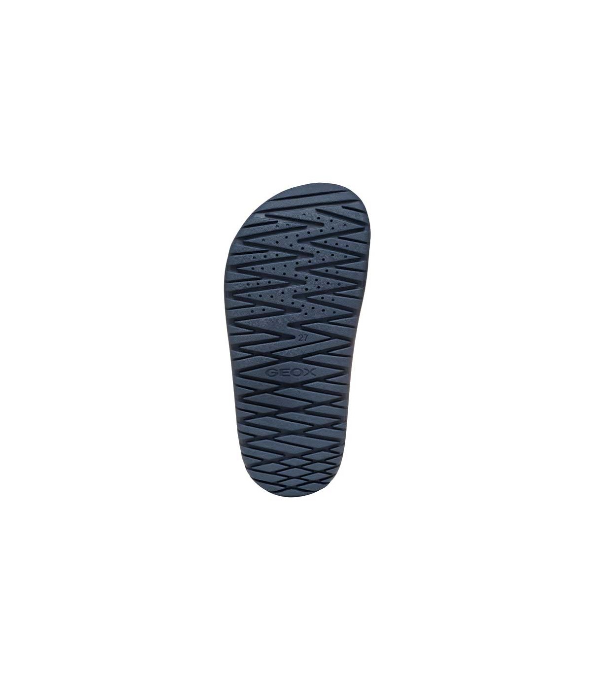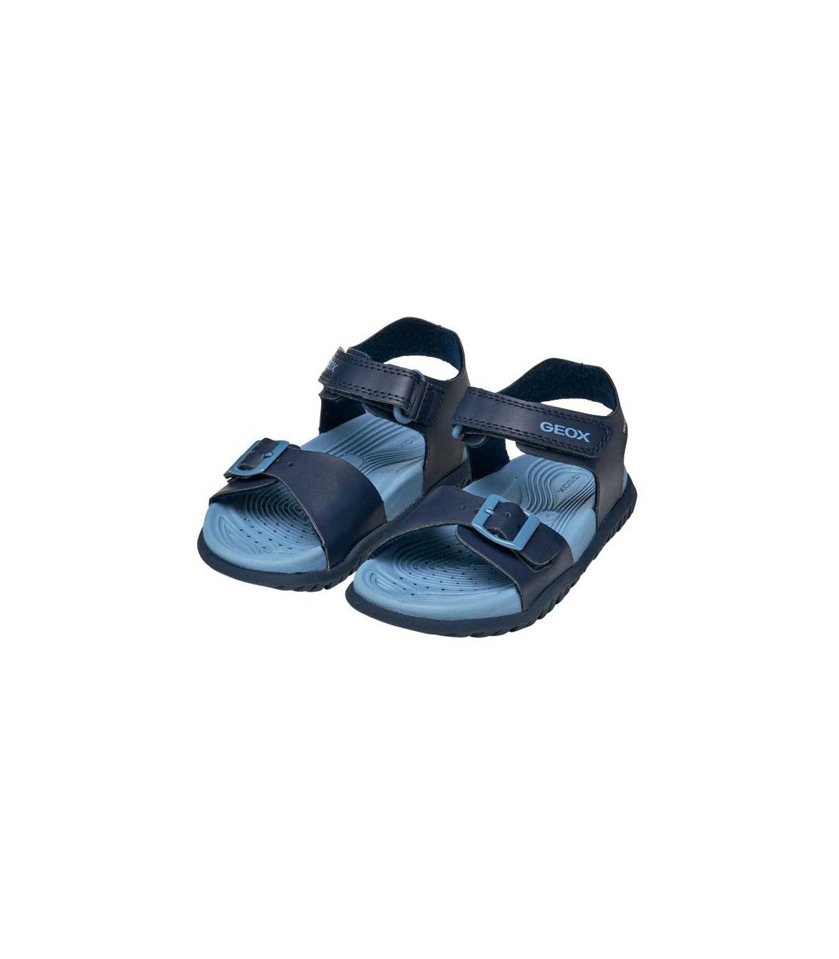 Sandalia juvenil para uso diario al aire libre en color azul marino y azul cielo con diseño ligero, flexible y fácil de ajustar. Fabricada con material efecto piel de secado rápido y suela resistente con agarre excepcional incluso en terrenos resbaladizos. Water friendly, se puede mojar.